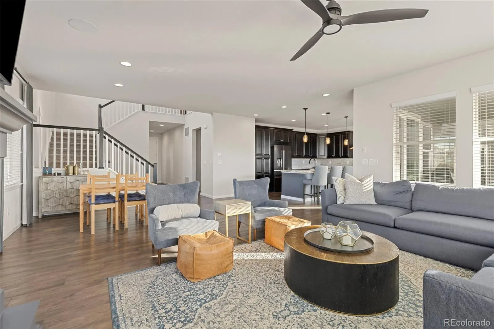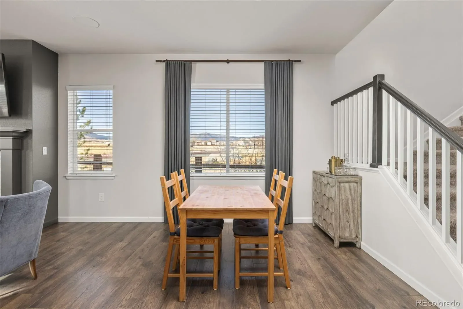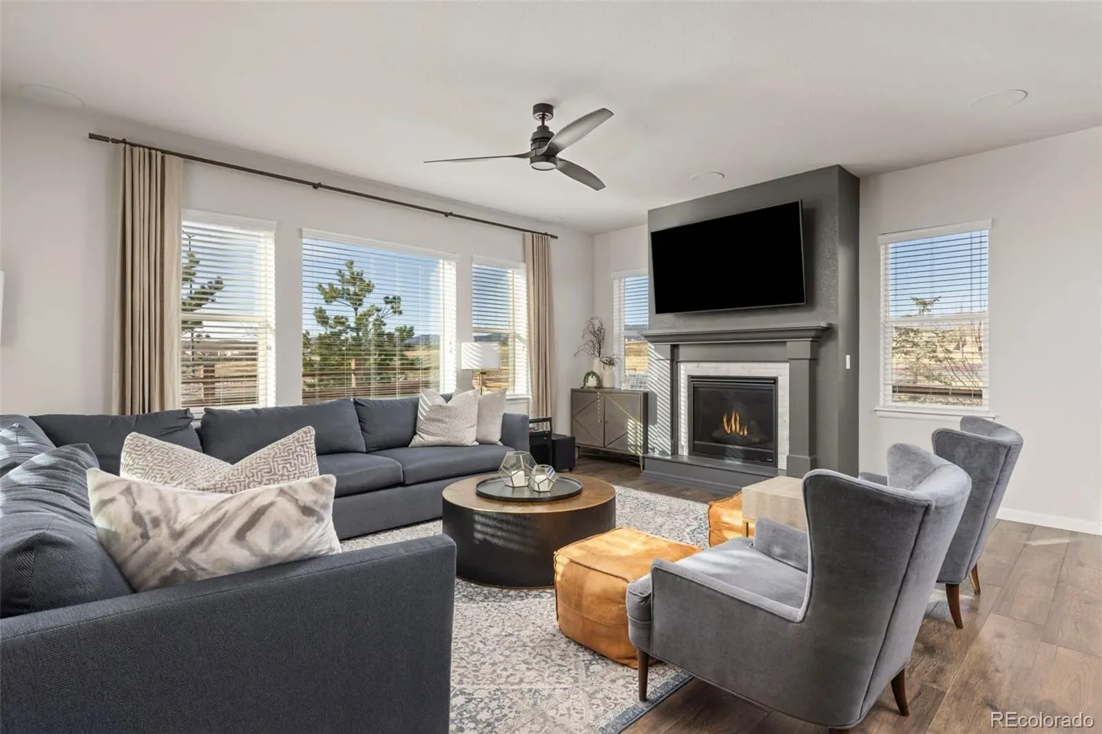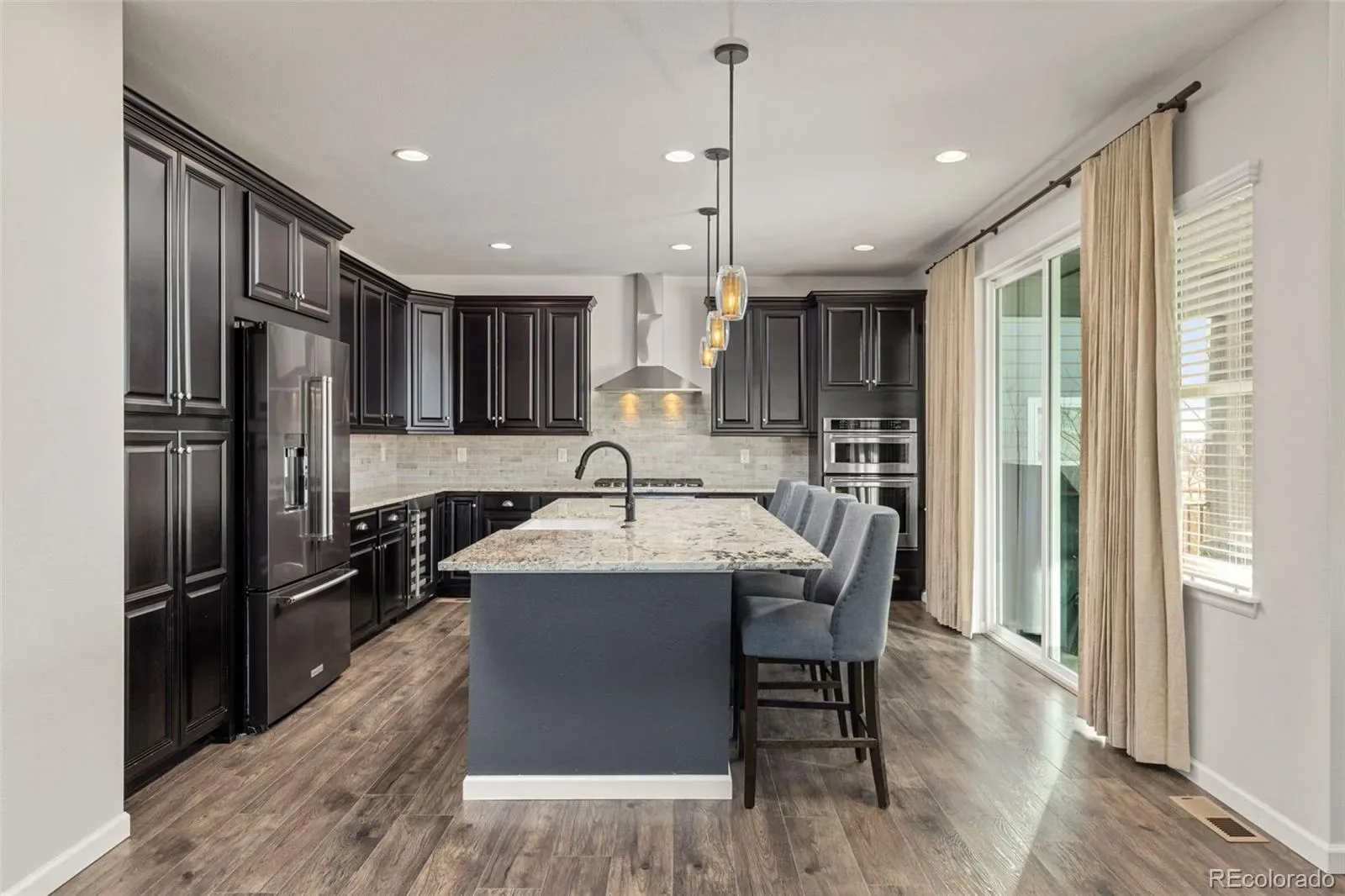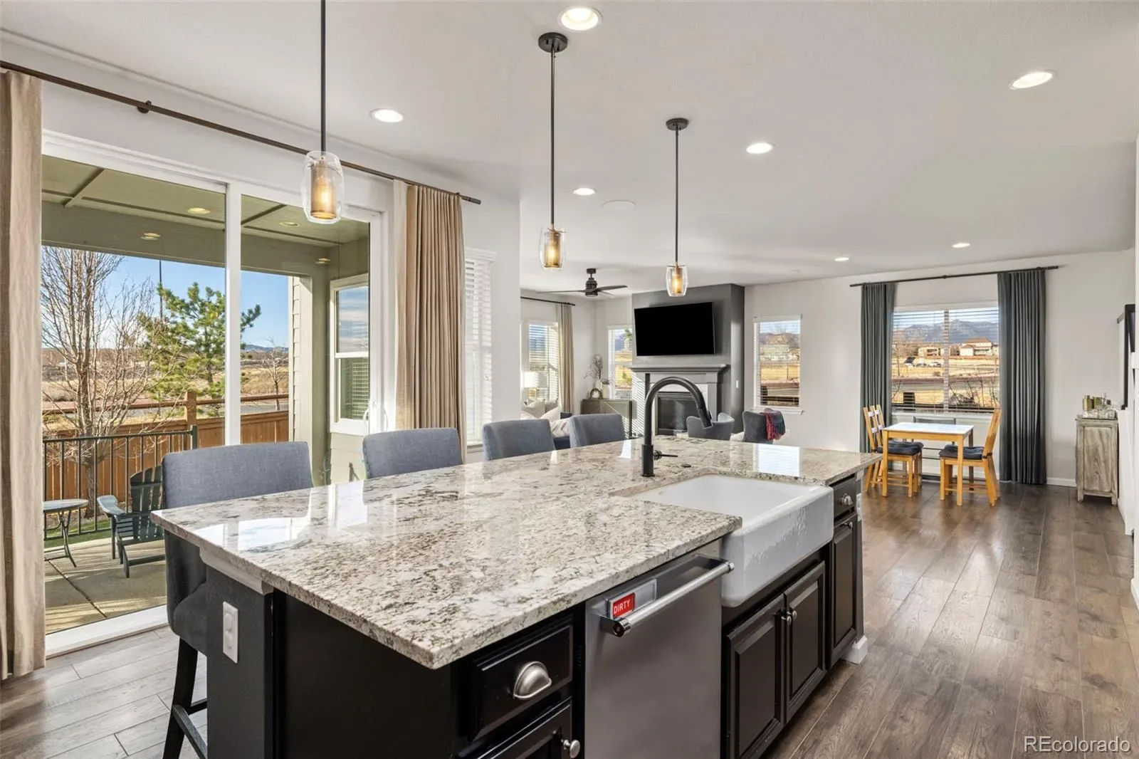 The main level is anchored by a chef-like kitchen designed for both everyday living and effortless entertaining. Features include a farmhouse sink, double ovens, wine refrigerator with dual zones, and a full KitchenAid appliance package, all flowing seamlessly into the spacious family room with built-in 5.1 surround sound speakers, gas fireplace AND direct access to a covered patio with two built-in speakers—perfect for entertaining or relaxing while enjoying the open-space backdrop with Mountain Views.