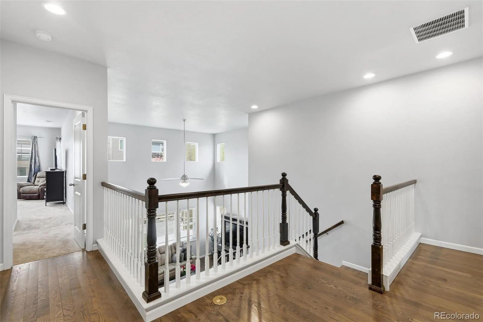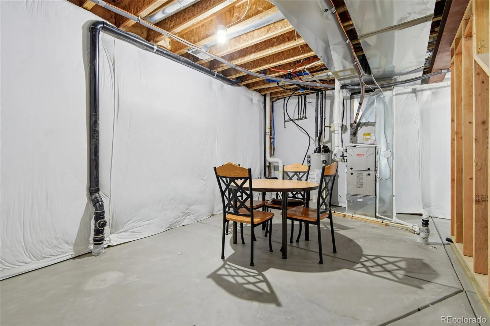 The upper level boasts a sophisticated mix of hardwood floors and brand-new carpeting, featuring a secluded primary suite wing for maximum privacy and a versatile loft perfect for a secondary lounge. Two additional bedrooms share a well-appointed bath, while a separate guest suite enjoys its own private en-suite bathroom. Practicality meets efficiency with a convenient upstairs laundry room, a split-bay three-car garage, and a massive full basement with nine-foot ceilings and a bathroom rough-in ready for custom finishing. Sustainability is built-in with solar panels and dual HVAC systems ensuring year-round comfort. Set within a premier community, residents enjoy access to exceptional amenities including six parks, two swim and fitness clubs, and the conveniently located Three Creeks K-8 school. This home offers a rare combination of architectural beauty, modern efficiency, and an unparalleled lifestyle.