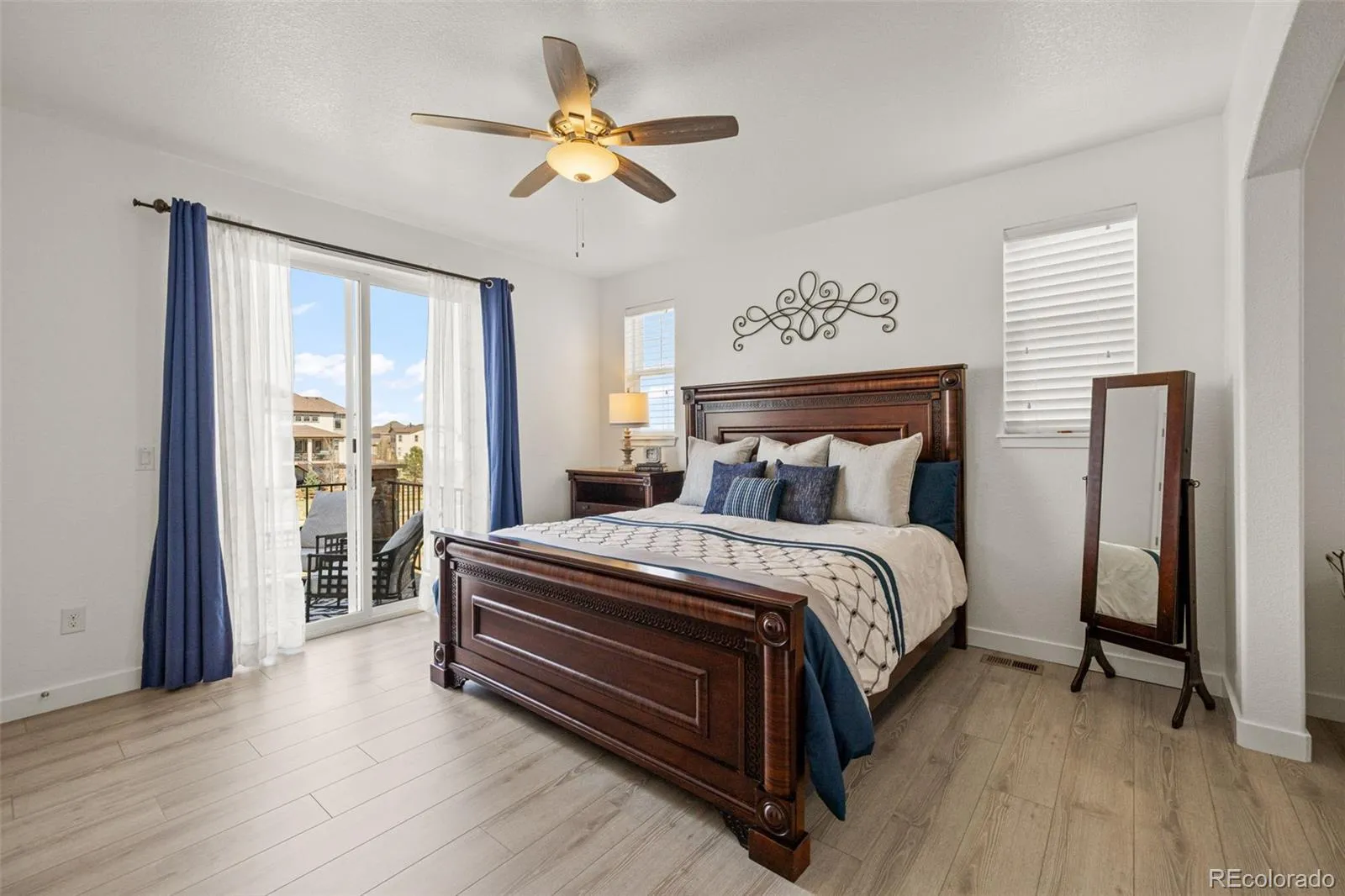 Outdoor living shines with a large lot, expanded partially covered deck, stamped concrete patio, and built-in seating—ideal for enjoying Colorado sunsets or evenings by the fire. The private deck off the suite adds a peaceful retreat with mountain views.