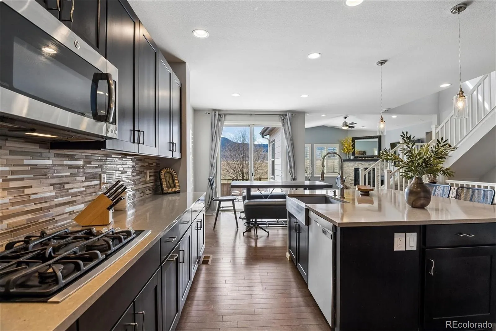 From the moment you enter, you’re greeted by expansive sightlines, rich finishes, and abundant natural light. The heart of the home is a stunning chef’s kitchen featuring quartz countertops, ebony cabinetry, double ovens, a large center island, and walk-in pantry—opening effortlessly to the dining area and inviting living room anchored by a striking stone fireplace.