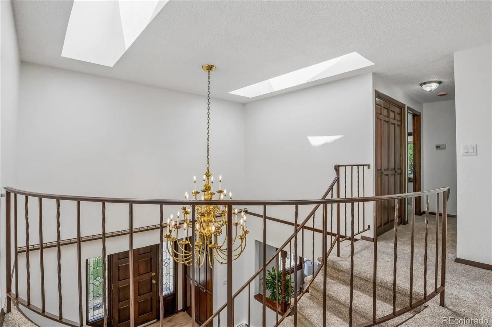 At the heart of the home, an expansive kitchen connects effortlessly to multiple living areas, creating a natural hub for hosting and daily life alike. A striking floor-to-ceiling stone fireplace anchors the family room, while oversized windows and skylights draw in abundant natural light throughout.