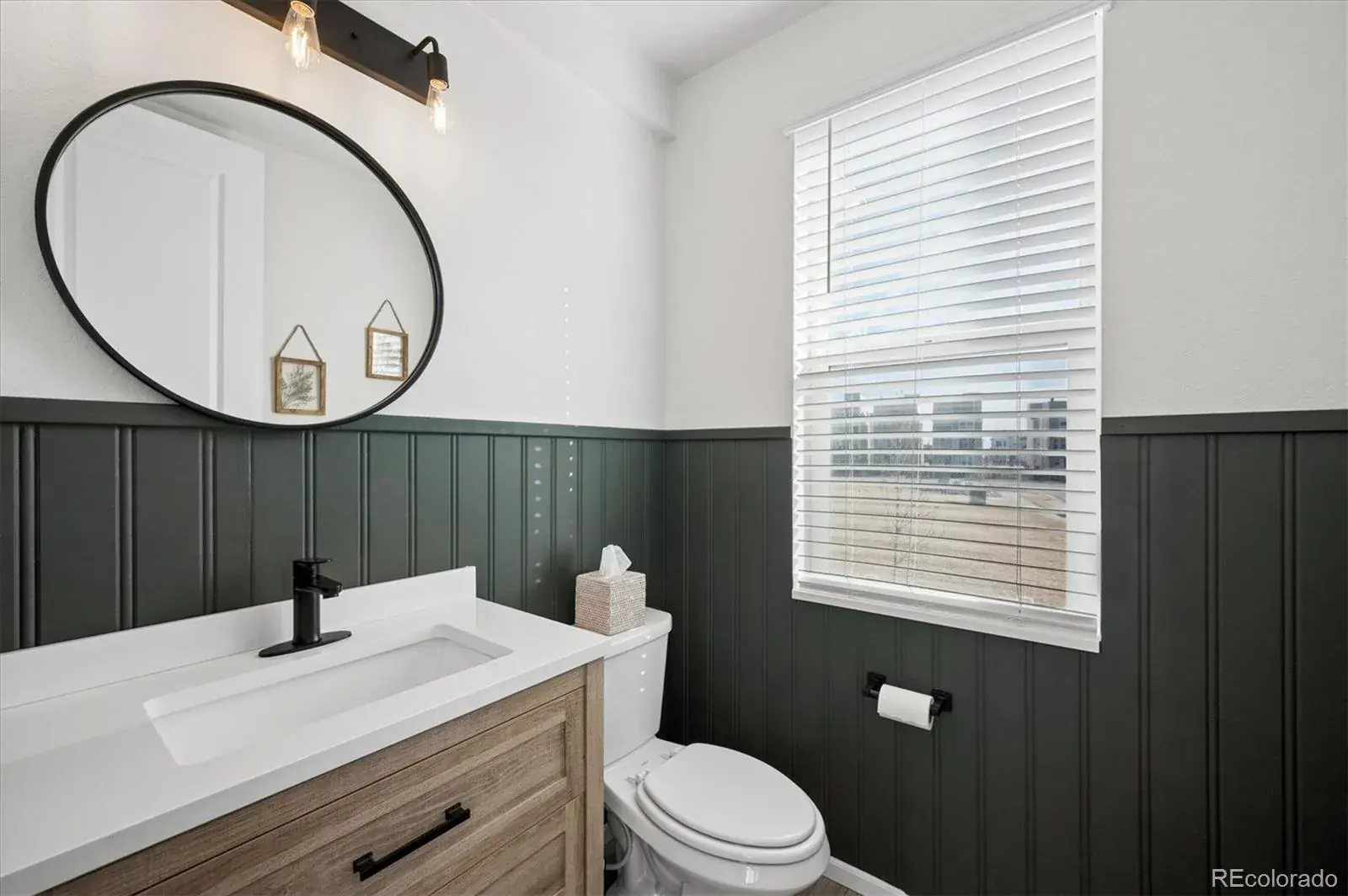 Remodeled main floor half bath with new vanity, designer paint/wains coating and fixtures!
