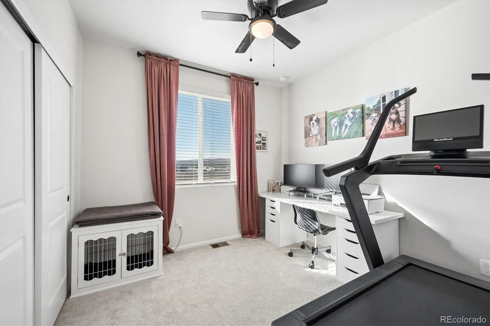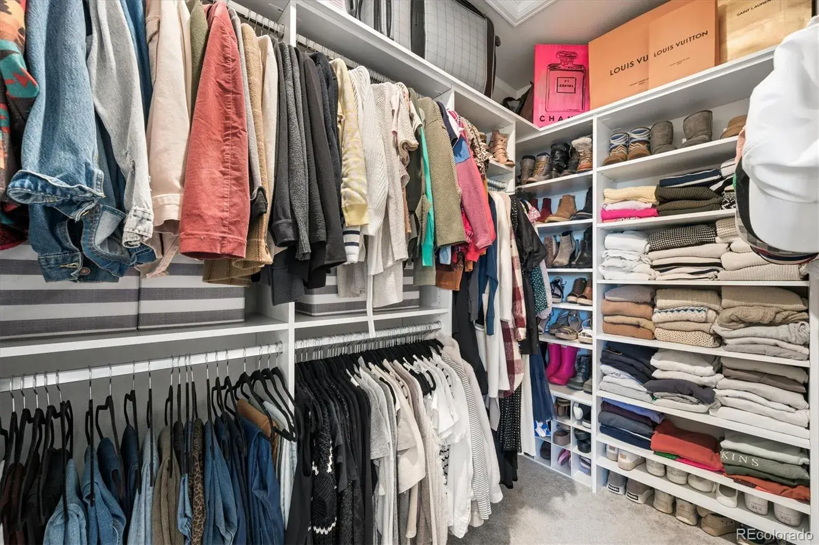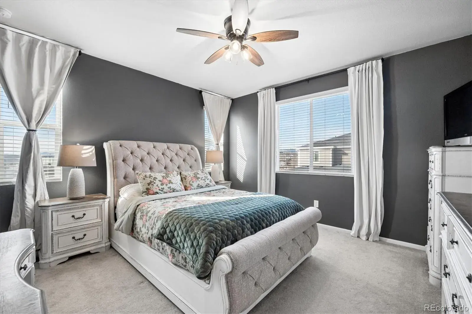 Large Primary Bedroom boasts designer paint and expertly organized, custom closet!!