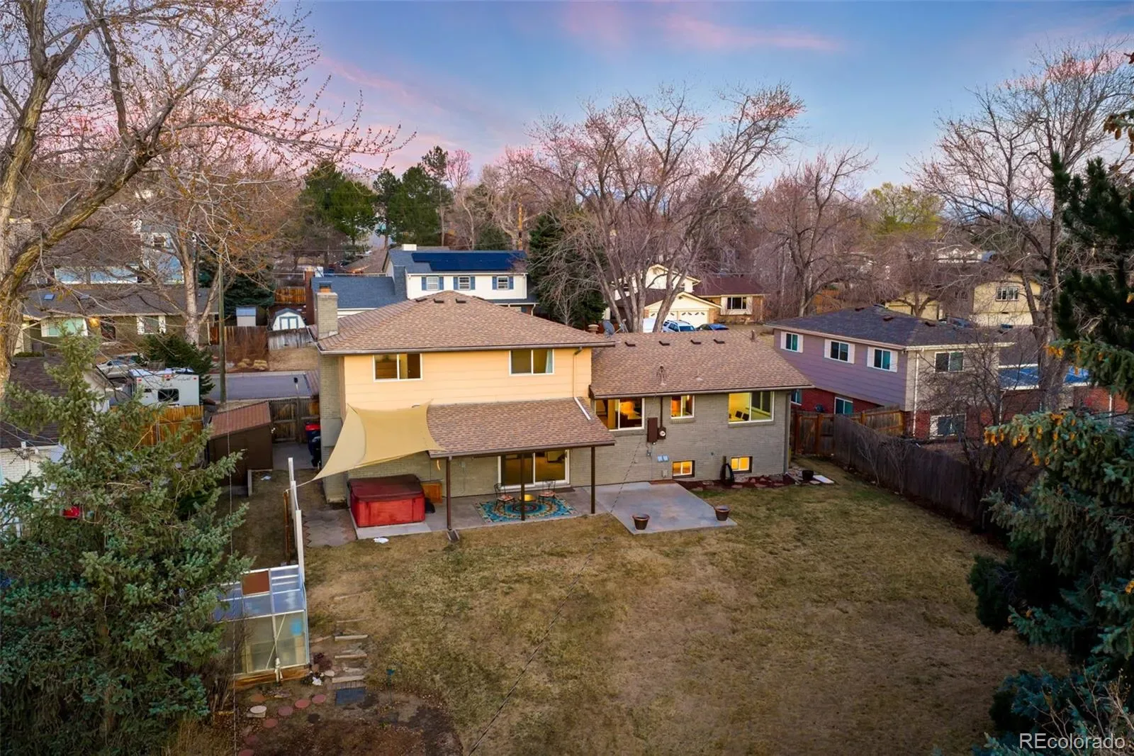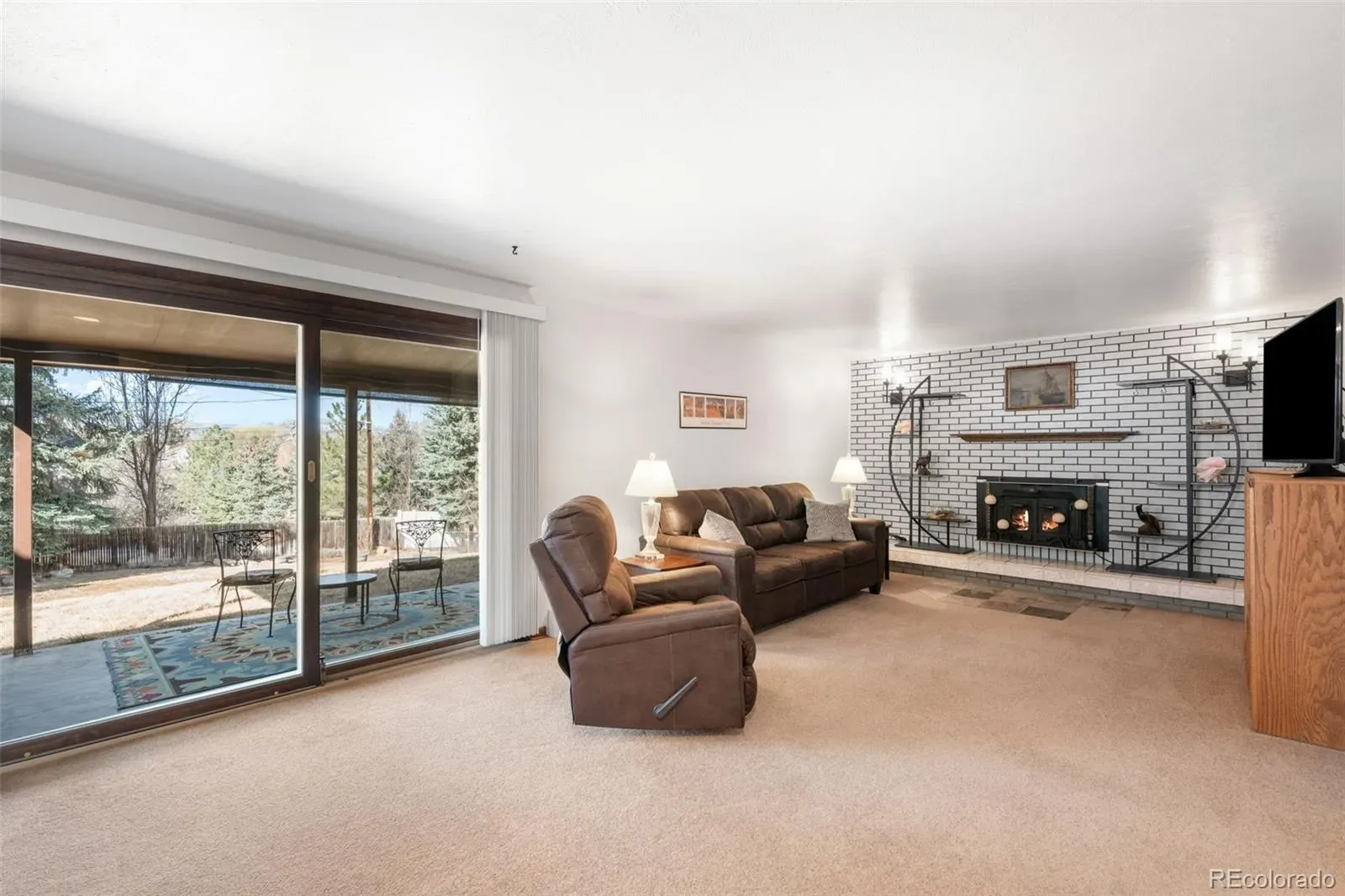 The lower level opens to a covered patio and large fenced backyard with a hot tub—ideal for relaxing evenings and enjoying Colorado’s sunshine. A cozy brick fireplace, fourth bedroom, and additional bathroom with shower create a comfortable guest or retreat space.