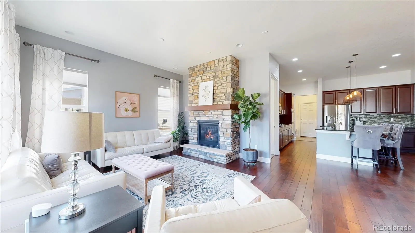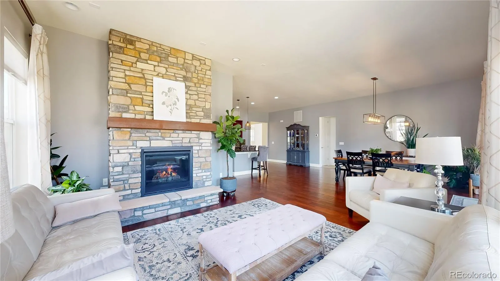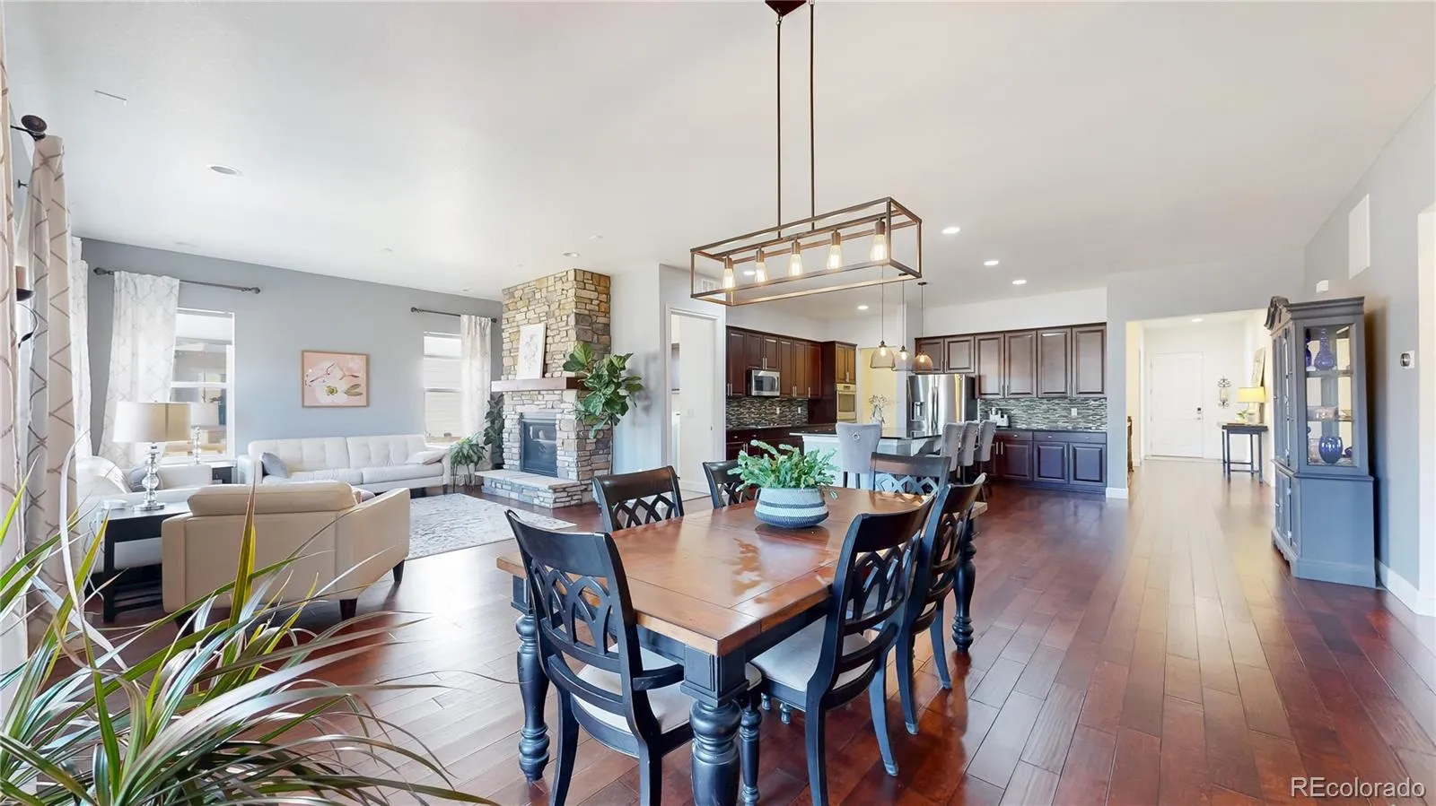 Thoughtfully designed with an open, airy floor plan, this 4 bedroom, 4 bath home showcases 10-foot ceilings, 8-foot doors & abundant natural light throughout the main level, complemented by rich hardwood flooring. The upgraded kitchen serves as the heart of the home, featuring SS appliances, a large island ideal for gathering, generous cabinet & counter space, and a separate pantry. The seamless flow into the dining and living areas, anchored by a fireplace, makes this home as functional as it is inviting. The private primary suite offers a spacious retreat with a well-appointed en-suite bath, including dual sinks, a walk-in shower, and a large walk-in closet. Two additional bedrooms, multiple bathrooms, a dedicated office with French doors & a conveniently located laundry room (washer and dryer included) complete the main level. The fully finished basement with 9-foot ceilings significantly expands the living space, offering a large family room, wet bar, game area, gym space, a 4th bedroom & a full bathroom, ideal for guests or comfortable multi-generational living. Outdoors, the backyard captures beautiful mountain views and provides ample space for entertaining, relaxing, and everyday enjoyment. Additional highlights include a 3-car tandem garage, offering flexibility for extra storage or workshop space. This home has been lightly lived in by its original owners and is in move-in ready condition.