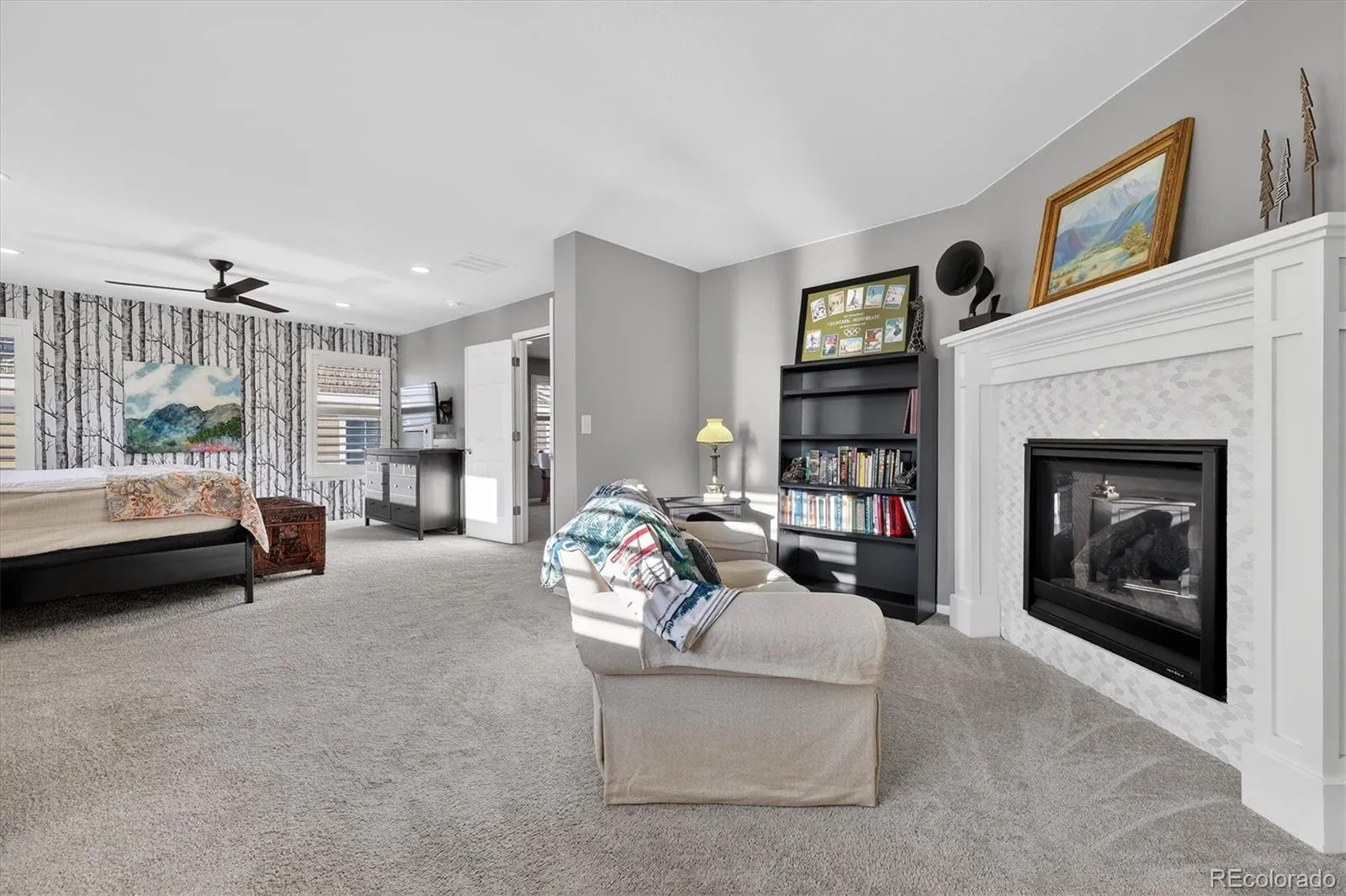 The primary suite is a true retreat, complete with a cozy seating area and its own fireplace, a spa-like bathroom with a soaking tub, walk-in shower, dual sinks, and two walk-in closets.