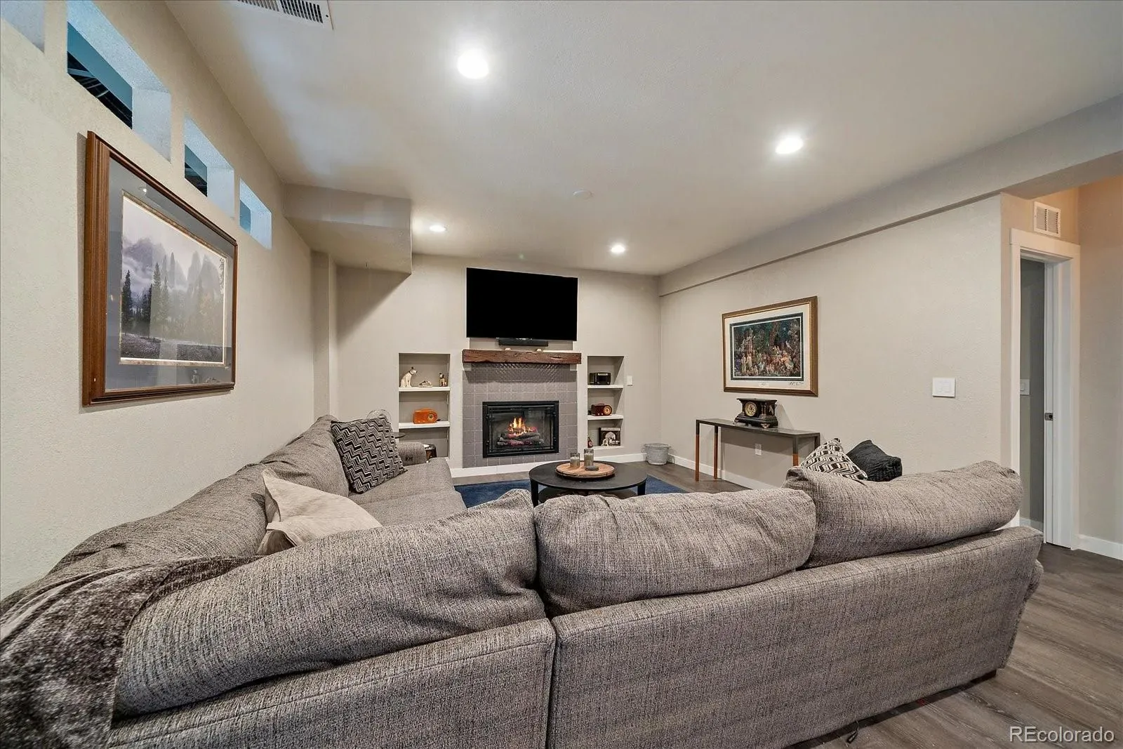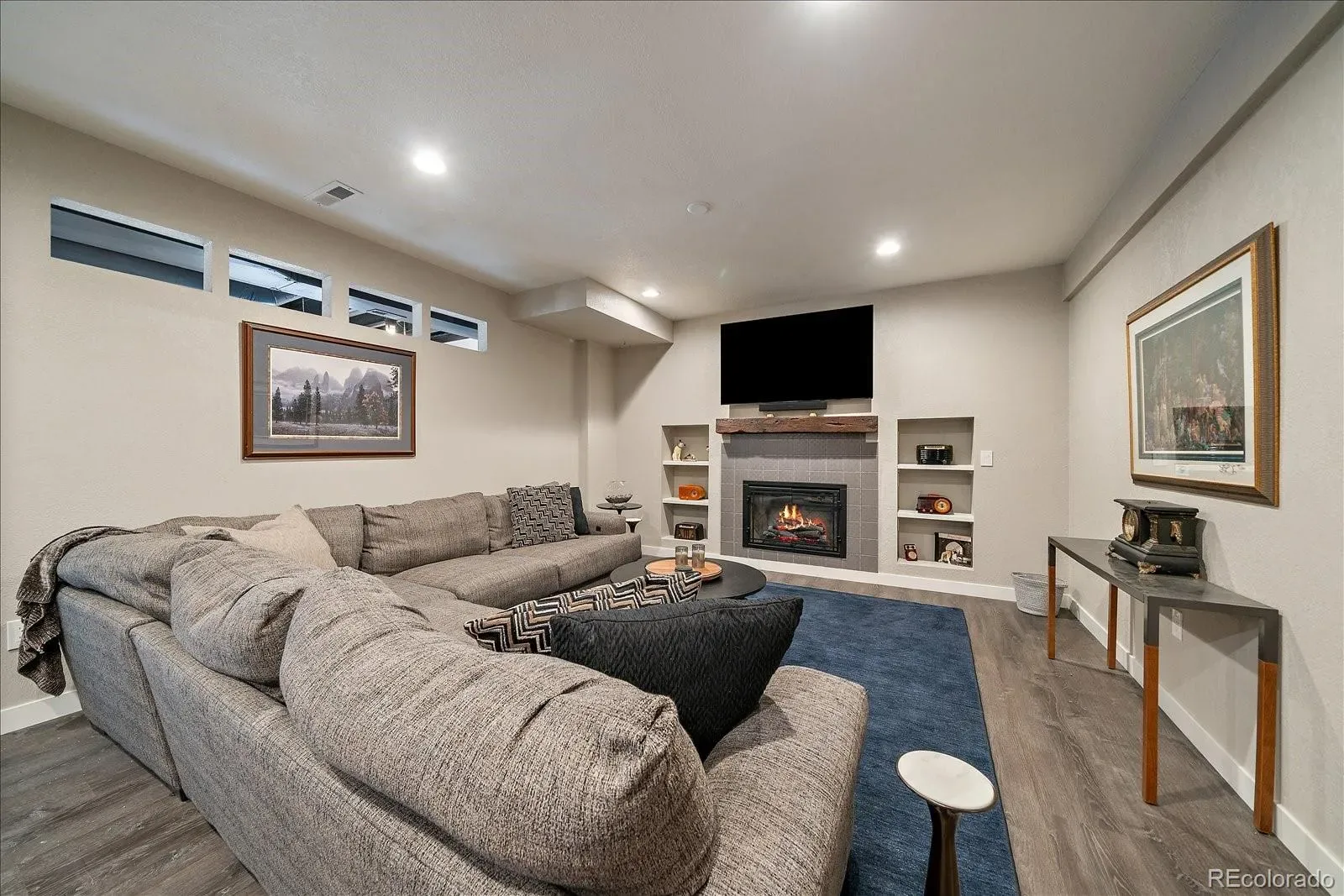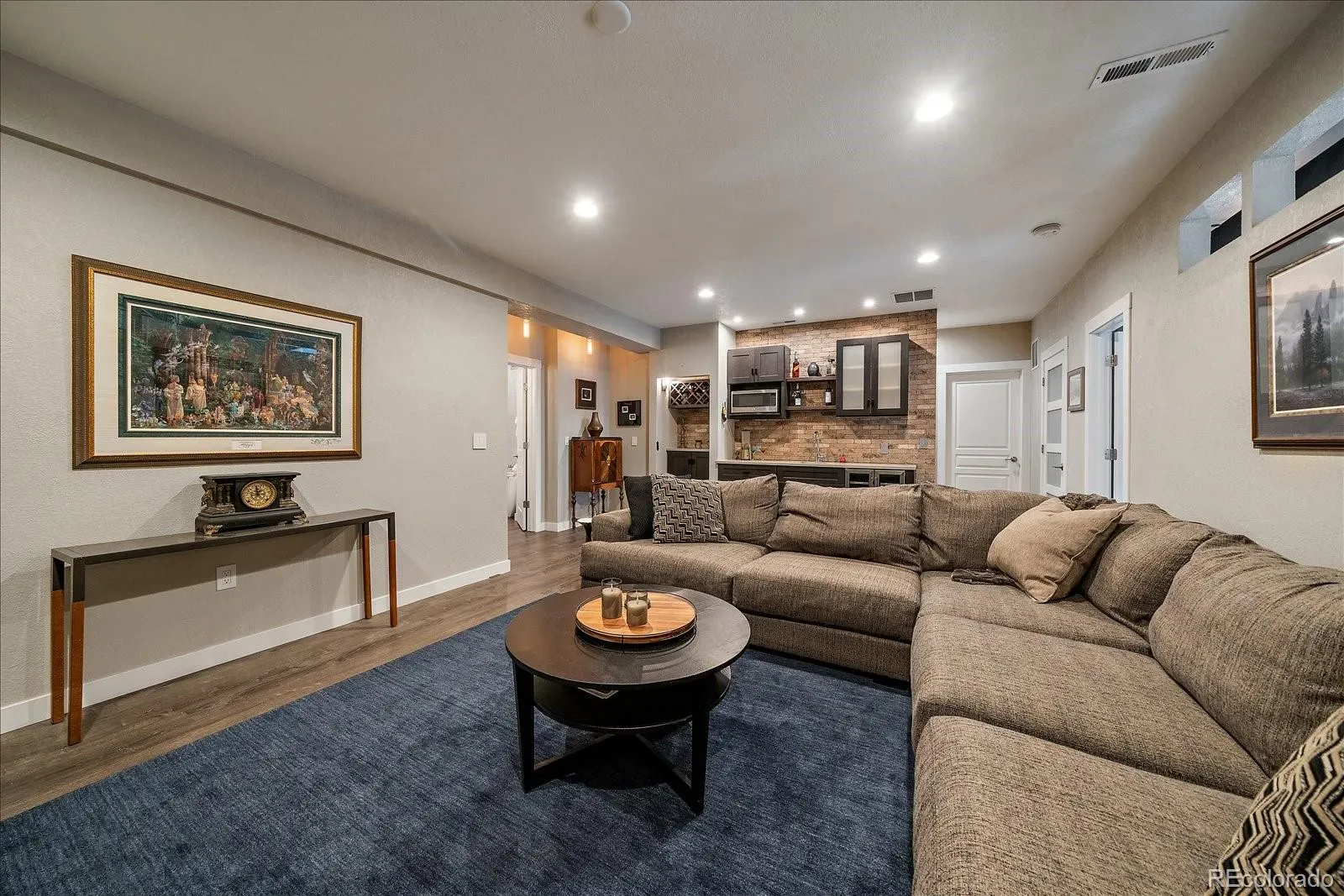 Effortless Leyden luxury with over $100k in upgrades. Renovated 3-bed + flex room + office garden-level ranch home offering the ultimate low-maintenance lifestyle. Sleek engineered wood floors + an open layout anchored by an impressive stacked-stone main level fireplace. Chef’s kitchen features ample cabinetry with custom pull-outs, Pental Quartz island w/ granite sink, newer KitchenAid stainless appliances. Entertain easily w/ designer lighting, built-ins and custom dry bar with wine fridge flanking kitchen & living area. Primary suite is a true retreat with premium tile, frameless glass shower, upgraded lighting and expansive Quartz-topped dual vanity. Main floor also adds 2nd bedroom, large office and full hall bath with Restoration Hardware lighting & upgraded vanity. Upgraded Lutron lighting details and shutters complete the main floor. Finished garden level bsmt features upgraded structural wood floor. This peaceful retreat adds a large family/game room with tiled electric fireplace + wet bar. A 3rd bedroom adds the perfect guest retreat + you’ll find an oversized flex room/4th bedroom option also perfect for your home gym, art studio or additional WFM option. Treat yourself to the spa-like basement bathroom complete with a steam shower and a freestanding soaking tub. Multiple storage areas on this level make stowing seasonal items a breeze. Step out the french doors and enjoy green space views from your composite deck featuring both a covered area and a custom pergola. Custom front landscaping includes masonry wall planters, mature trees, and wrap-around walkways on both sides of the home. Situated on a premium lot this is 1 of only 2 William Lyons patio homes boasting a full 3-car garage. Lawn care and snow removal is off your plate and handled by the HOA while also enjoying the convenience of a rare-for-this-style fenced-in rear yard—perfect for your pup but without the weekend yard care grind. 2022 premium exterior paint.