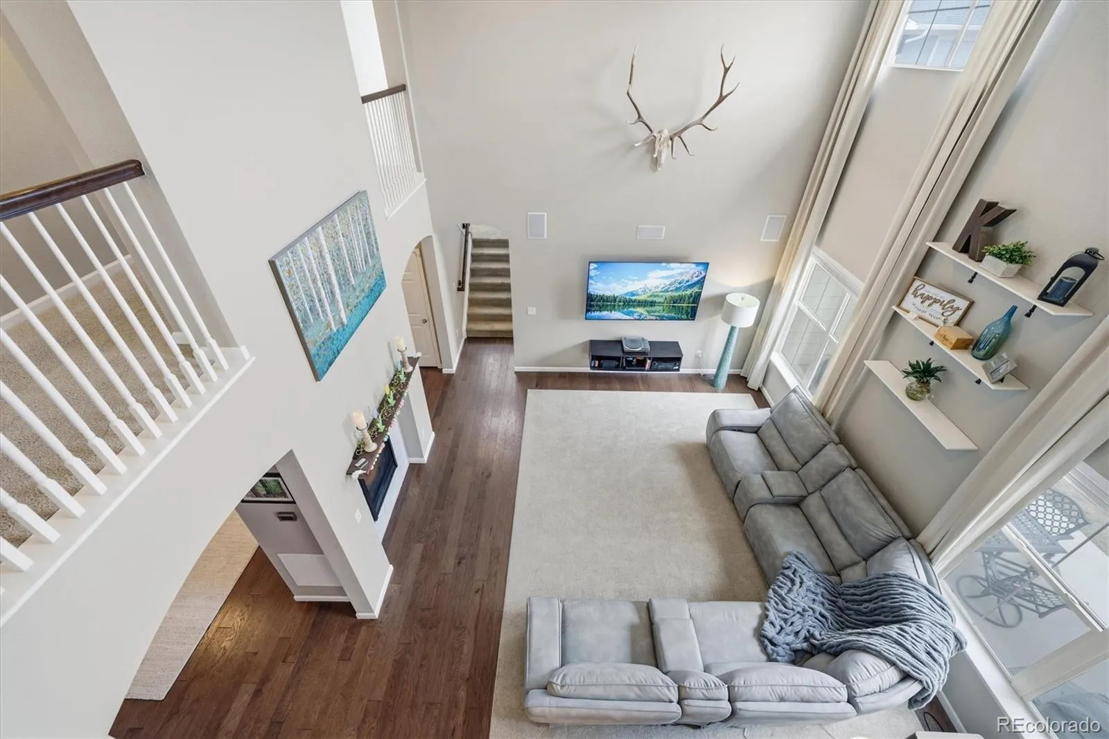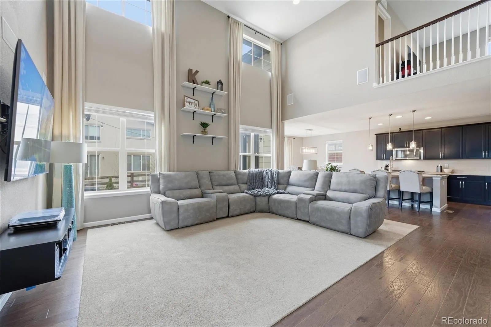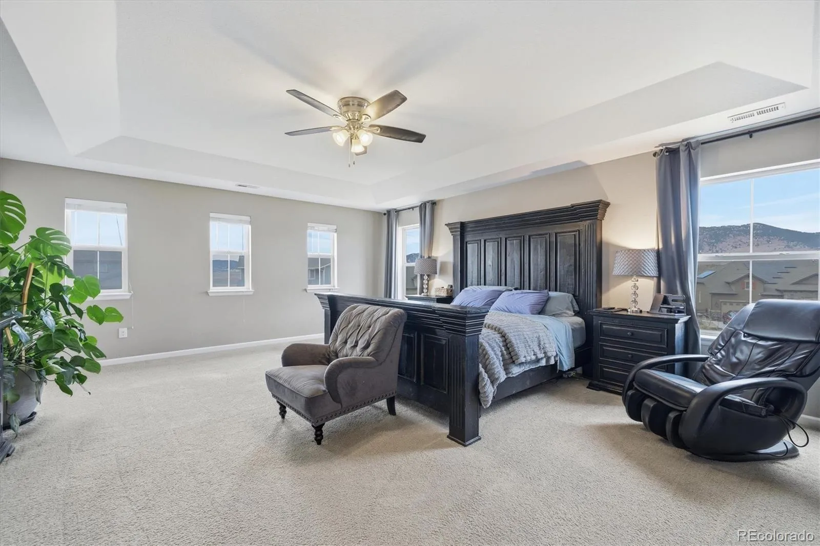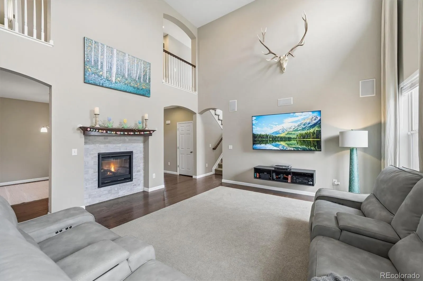 This stunning south-facing home welcomes you with soaring vaulted ceilings and an abundance of windows that fill the space with natural light. The spacious great room seamlessly connects to a beautifully designed open kitchen, perfect for cooking and entertaining. Featuring granite countertops, a large center island, tall espresso cabinetry, stainless steel appliances, a double oven, a generous pantry, and a casual eat-in dining area, the kitchen is both stylish and functional. An elegant double-sided electric fireplace creates a warm focal point between the dining room and great room. The dining area offers ample space for a large table, along with a convenient drink bar where guests can gather while cocktails or coffee are prepared. A standout feature of this home is the main-level bedroom paired with a ¾ bathroom, offering flexibility for guests or multi-generational living. Enjoy outdoor living from the wraparound covered porch with scenic mountain views overlooking the spacious side yard, or relax on the back porch just off the kitchen. Located in a quiet and welcoming cul-de-sac neighborhood, the home offers breathtaking sunset views over the Rockies. View of city lights from the master bathroom and south facing guest bedroom. Upstairs, the open design continues as the hallway overlooks the great room below. The expansive primary suite features tiered ceilings, a ceiling fan, and a luxurious en-suite bathroom. A large walk-in closet provides abundant storage and offers direct access to the laundry room for added convenience.