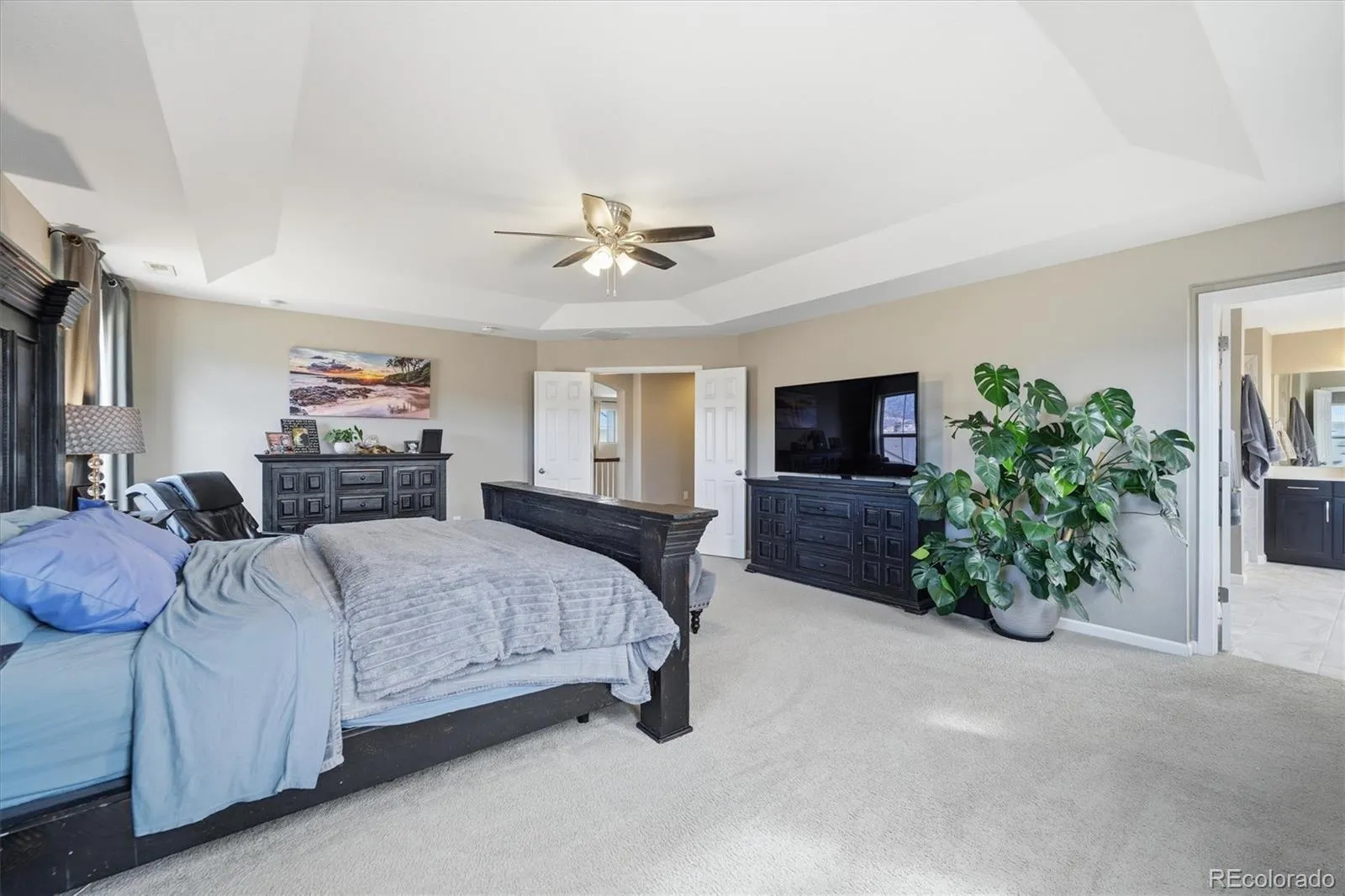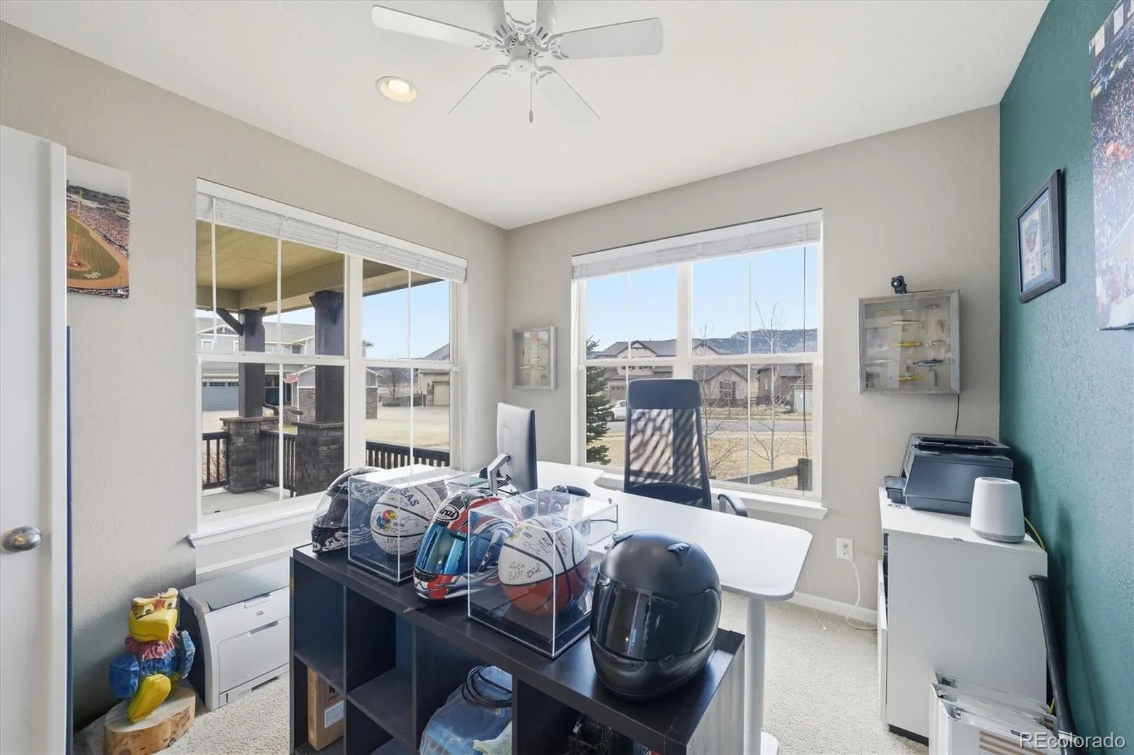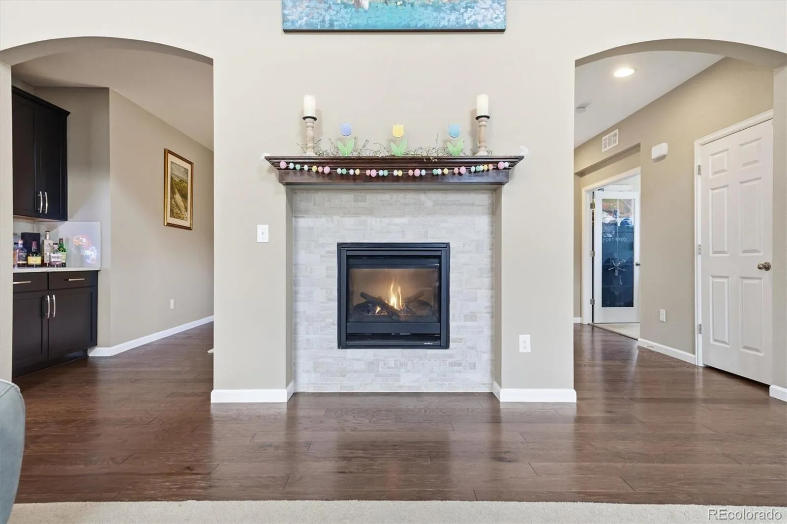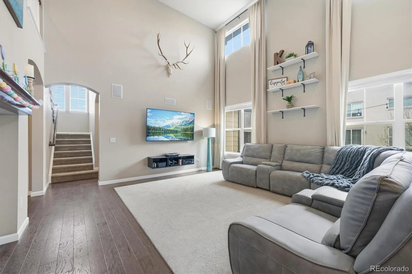 This stunning south-facing home welcomes you with soaring vaulted ceilings and an abundance of windows that fill the space with natural light. The spacious great room seamlessly connects to a beautifully designed open kitchen, perfect for cooking and entertaining. Featuring granite countertops, a large center island, tall espresso cabinetry, stainless steel appliances, a double oven, a generous pantry, and a casual eat-in dining area, the kitchen is both stylish and functional. An elegant double-sided electric fireplace creates a warm focal point between the dining room and great room. The dining area offers ample space for a large table, along with a convenient drink bar where guests can gather while cocktails or coffee are prepared. A standout feature of this home is the main-level bedroom paired with a ¾ bathroom, offering flexibility for guests or multi-generational living. Enjoy outdoor living from the wraparound covered porch with scenic mountain views overlooking the spacious side yard, or relax on the back porch just off the kitchen. Located in a quiet and welcoming cul-de-sac neighborhood, the home offers breathtaking sunset views over the Rockies. View of city lights from the master bathroom and south facing guest bedroom. Upstairs, the open design continues as the hallway overlooks the great room below. The expansive primary suite features tiered ceilings, a ceiling fan, and a luxurious en-suite bathroom. A large walk-in closet provides abundant storage and offers direct access to the laundry room for added convenience.