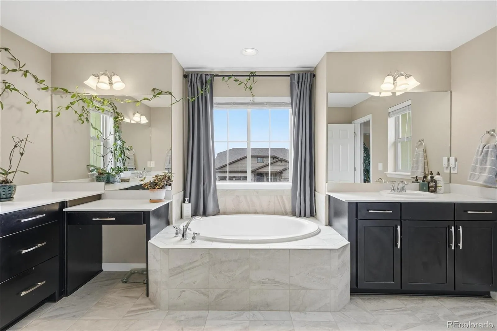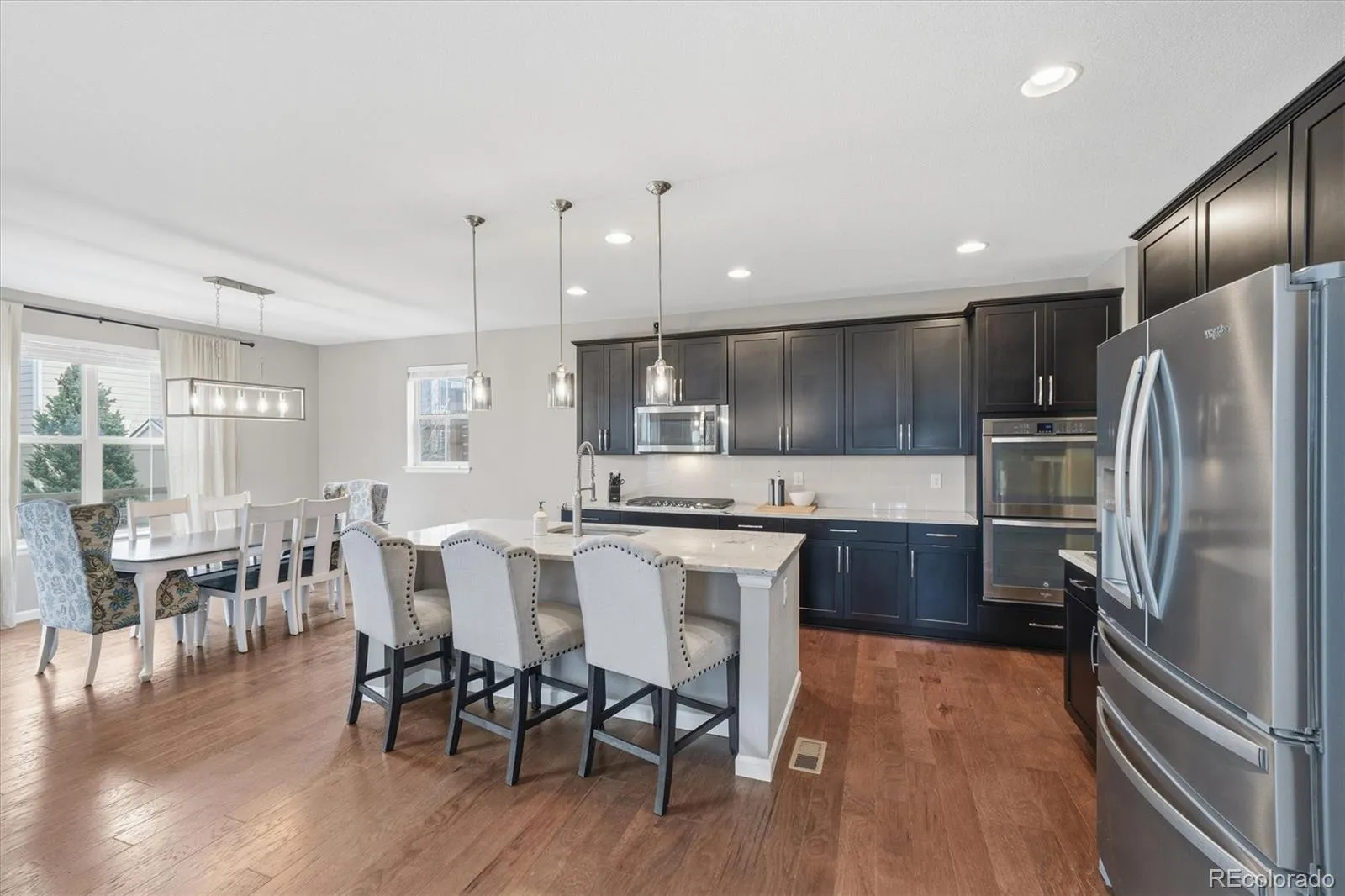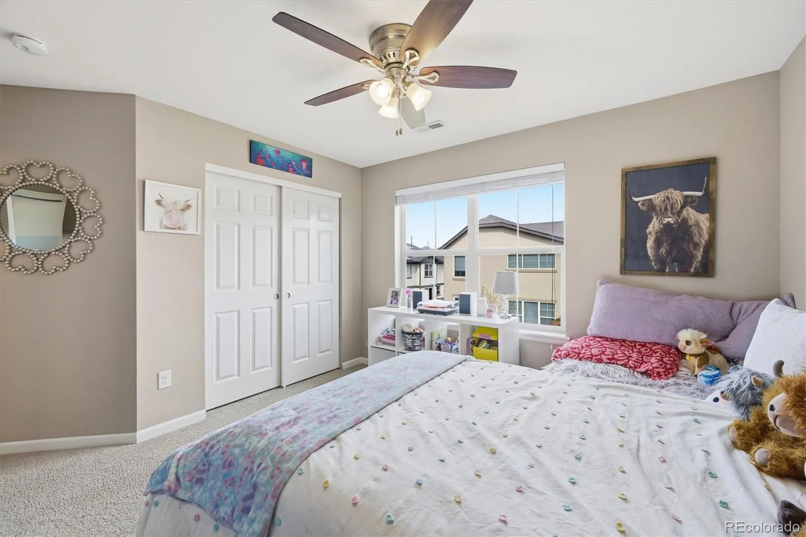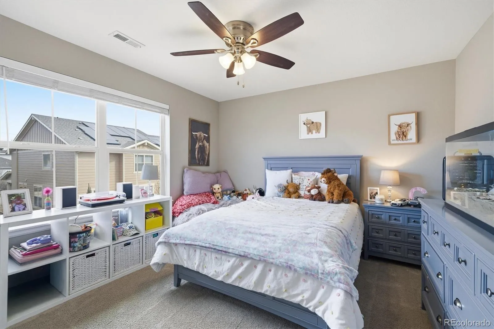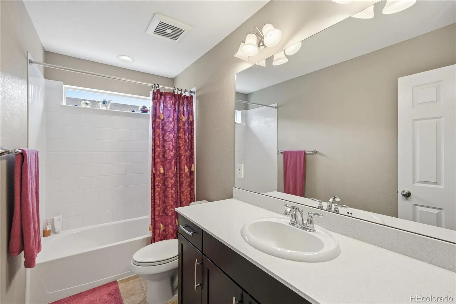 This stunning south-facing home welcomes you with soaring vaulted ceilings and an abundance of windows that fill the space with natural light. The spacious great room seamlessly connects to a beautifully designed open kitchen, perfect for cooking and entertaining. Featuring granite countertops, a large center island, tall espresso cabinetry, stainless steel appliances, a double oven, a generous pantry, and a casual eat-in dining area, the kitchen is both stylish and functional. An elegant double-sided electric fireplace creates a warm focal point between the dining room and great room. The dining area offers ample space for a large table, along with a convenient drink bar where guests can gather while cocktails or coffee are prepared. A standout feature of this home is the main-level bedroom paired with a ¾ bathroom, offering flexibility for guests or multi-generational living. Enjoy outdoor living from the wraparound covered porch with scenic mountain views overlooking the spacious side yard, or relax on the back porch just off the kitchen. Located in a quiet and welcoming cul-de-sac neighborhood, the home offers breathtaking sunset views over the Rockies. View of city lights from the master bathroom and south facing guest bedroom. Upstairs, the open design continues as the hallway overlooks the great room below. The expansive primary suite features tiered ceilings, a ceiling fan, and a luxurious en-suite bathroom. A large walk-in closet provides abundant storage and offers direct access to the laundry room for added convenience.