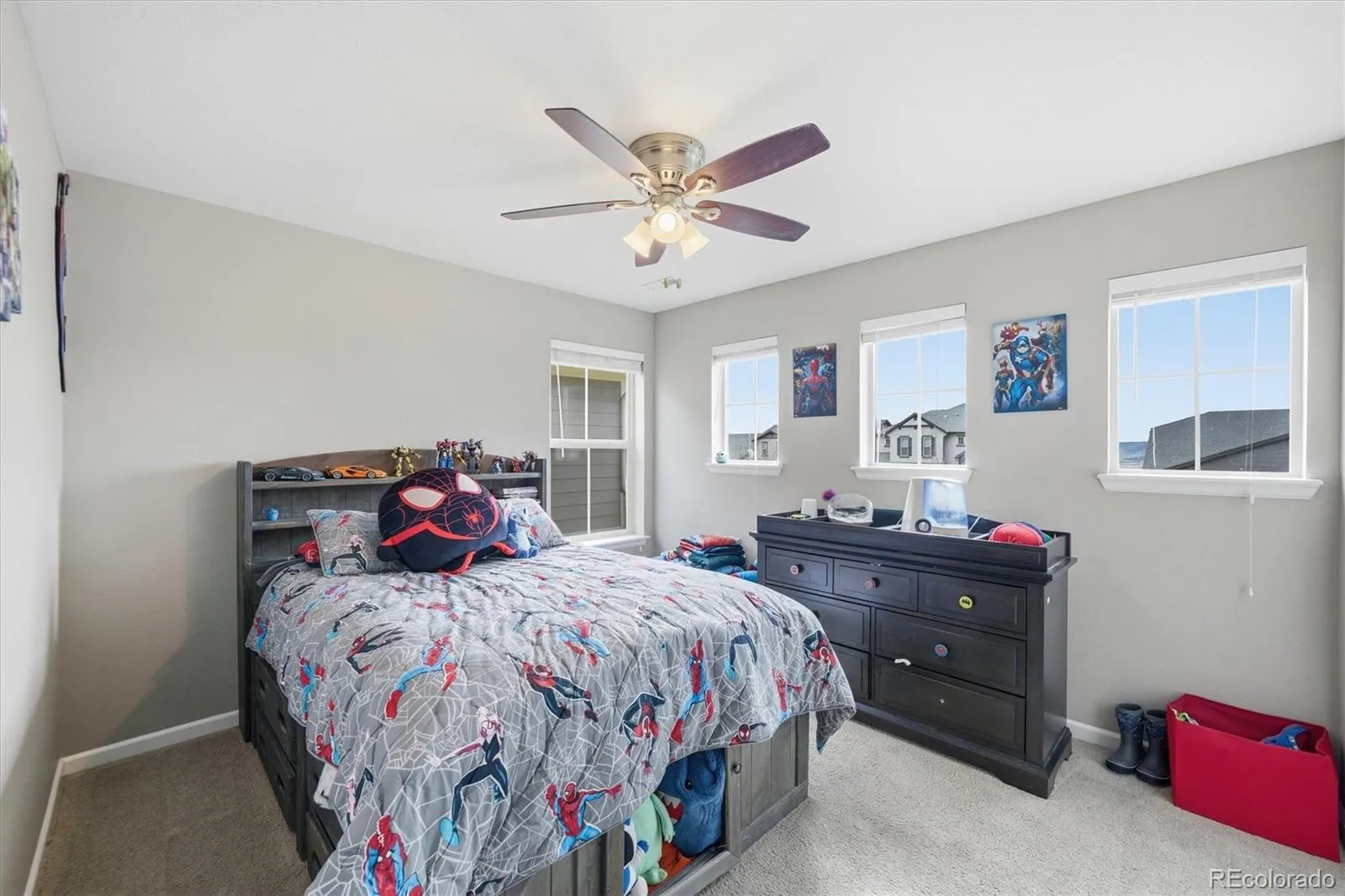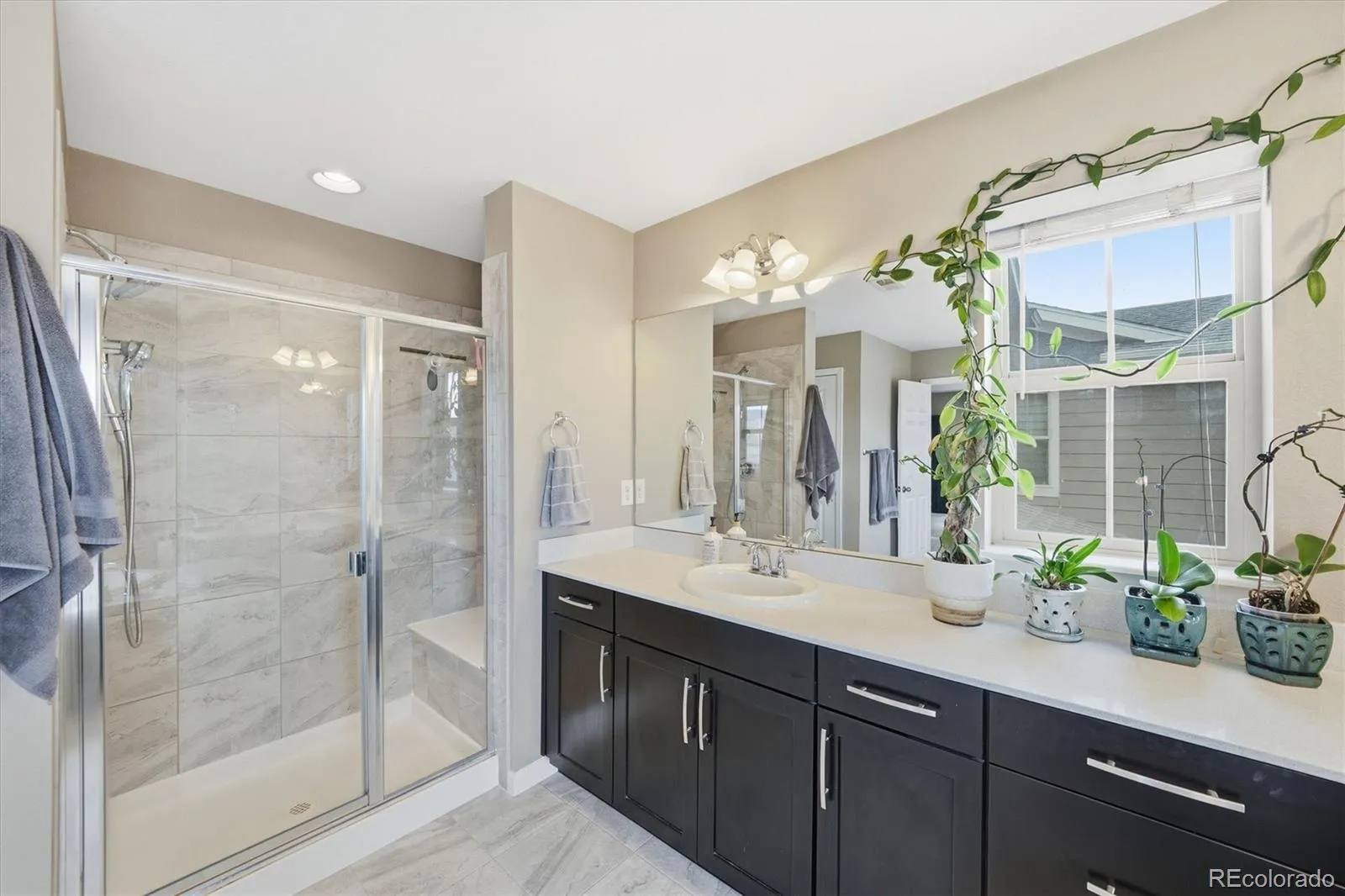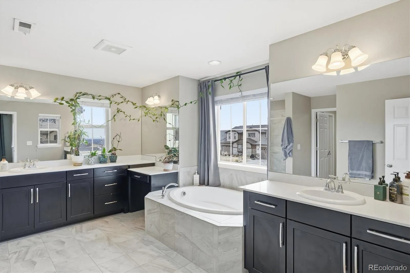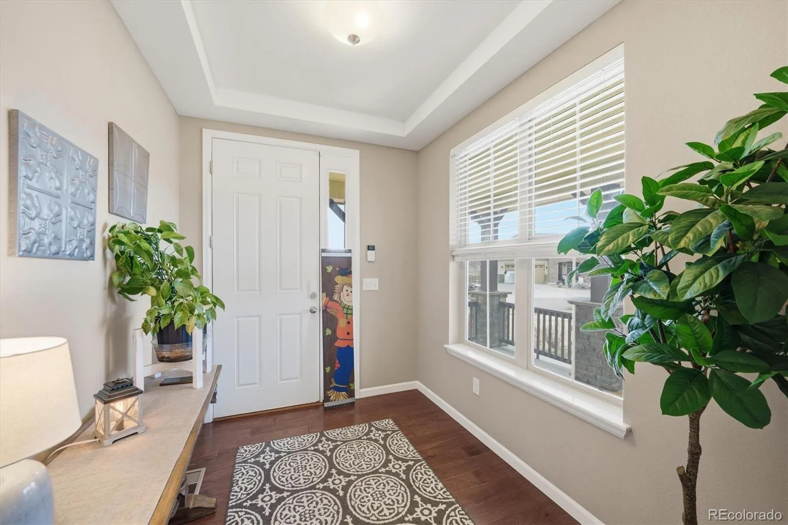 This stunning south-facing home welcomes you with soaring vaulted ceilings and an abundance of windows that fill the space with natural light. The spacious great room seamlessly connects to a beautifully designed open kitchen, perfect for cooking and entertaining. Featuring granite countertops, a large center island, tall espresso cabinetry, stainless steel appliances, a double oven, a generous pantry, and a casual eat-in dining area, the kitchen is both stylish and functional. An elegant double-sided electric fireplace creates a warm focal point between the dining room and great room. The dining area offers ample space for a large table, along with a convenient drink bar where guests can gather while cocktails or coffee are prepared. A standout feature of this home is the main-level bedroom paired with a ¾ bathroom, offering flexibility for guests or multi-generational living. Enjoy outdoor living from the wraparound covered porch with scenic mountain views overlooking the spacious side yard, or relax on the back porch just off the kitchen. Located in a quiet and welcoming cul-de-sac neighborhood, the home offers breathtaking sunset views over the Rockies. View of city lights from the master bathroom and south facing guest bedroom. Upstairs, the open design continues as the hallway overlooks the great room below. The expansive primary suite features tiered ceilings, a ceiling fan, and a luxurious en-suite bathroom. A large walk-in closet provides abundant storage and offers direct access to the laundry room for added convenience.