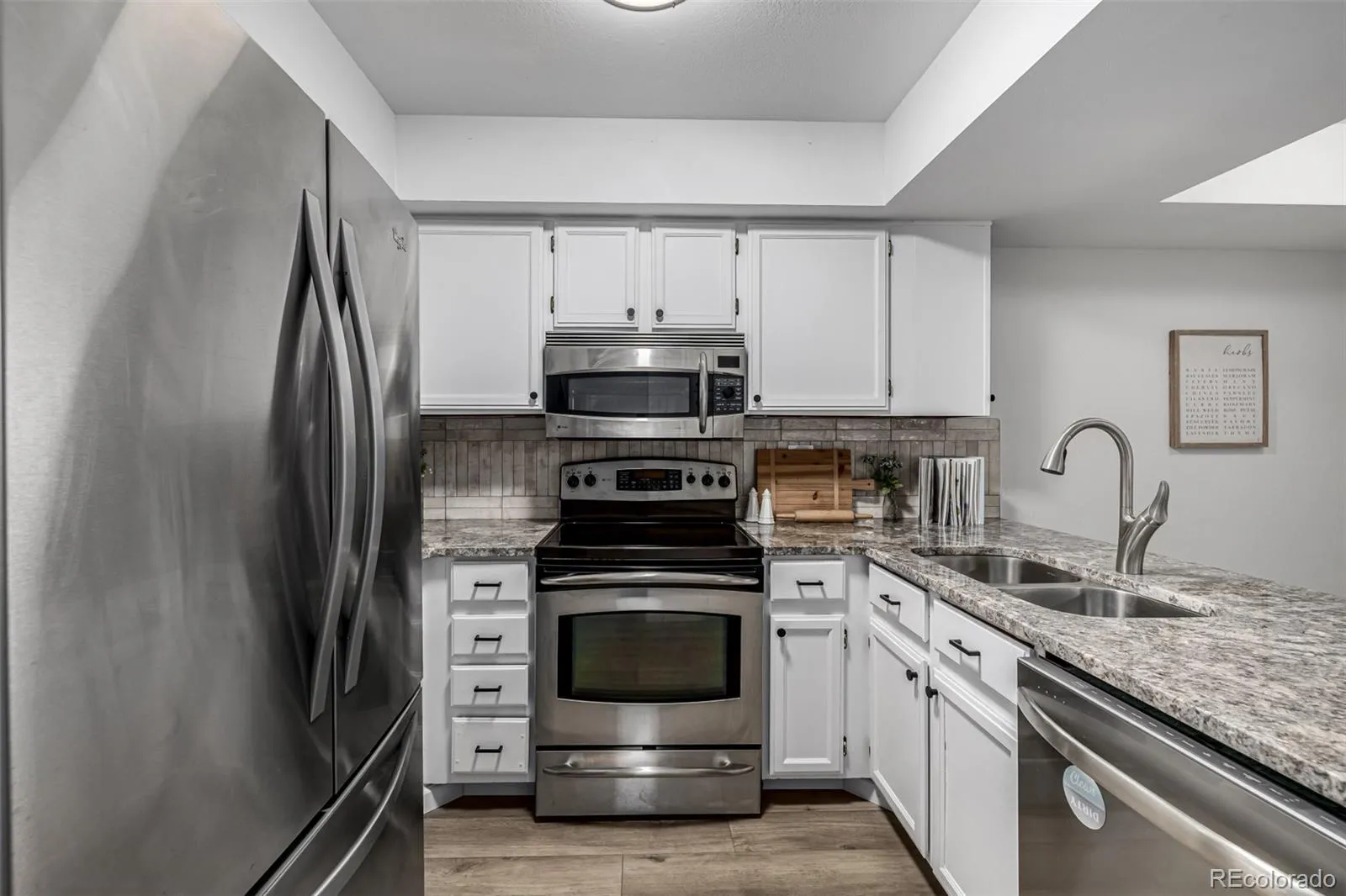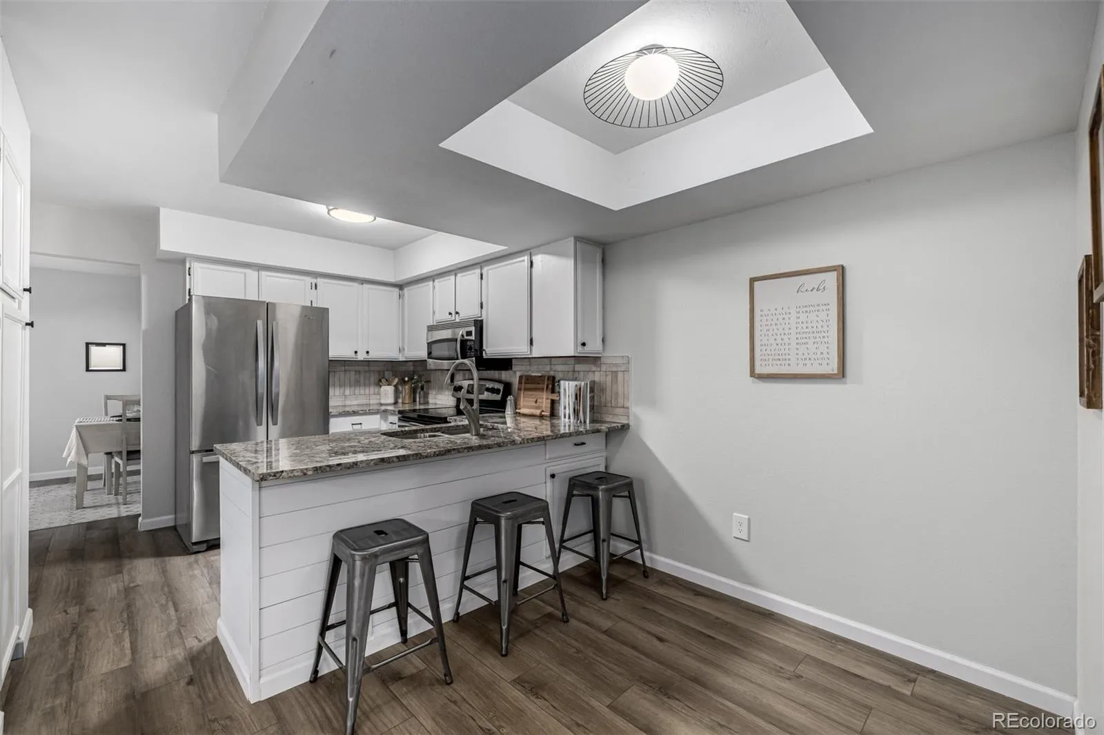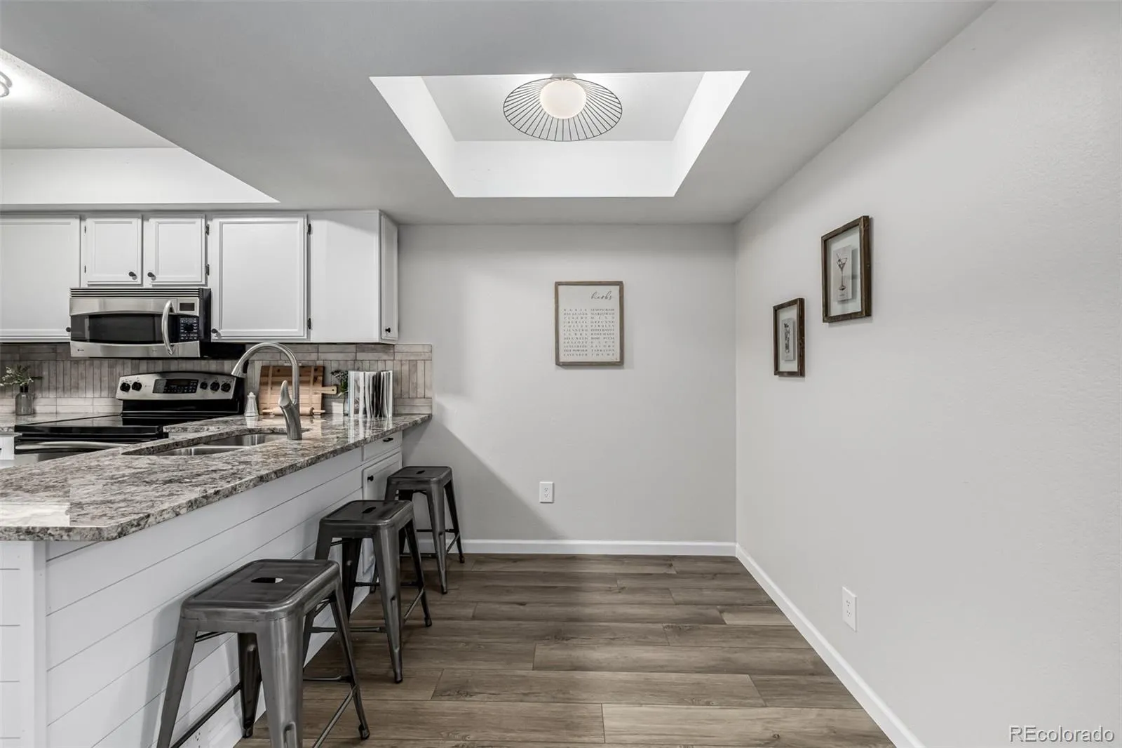 The updated kitchen features granite countertops, stainless steel appliances, crisp white cabinetry, a stylish tile backsplash, breakfast bar, and a sunny nook perfect for daily living or entertaining. Upstairs, the primary suite offers a private retreat with balcony access, a walk-in closet, and en-suite bath.