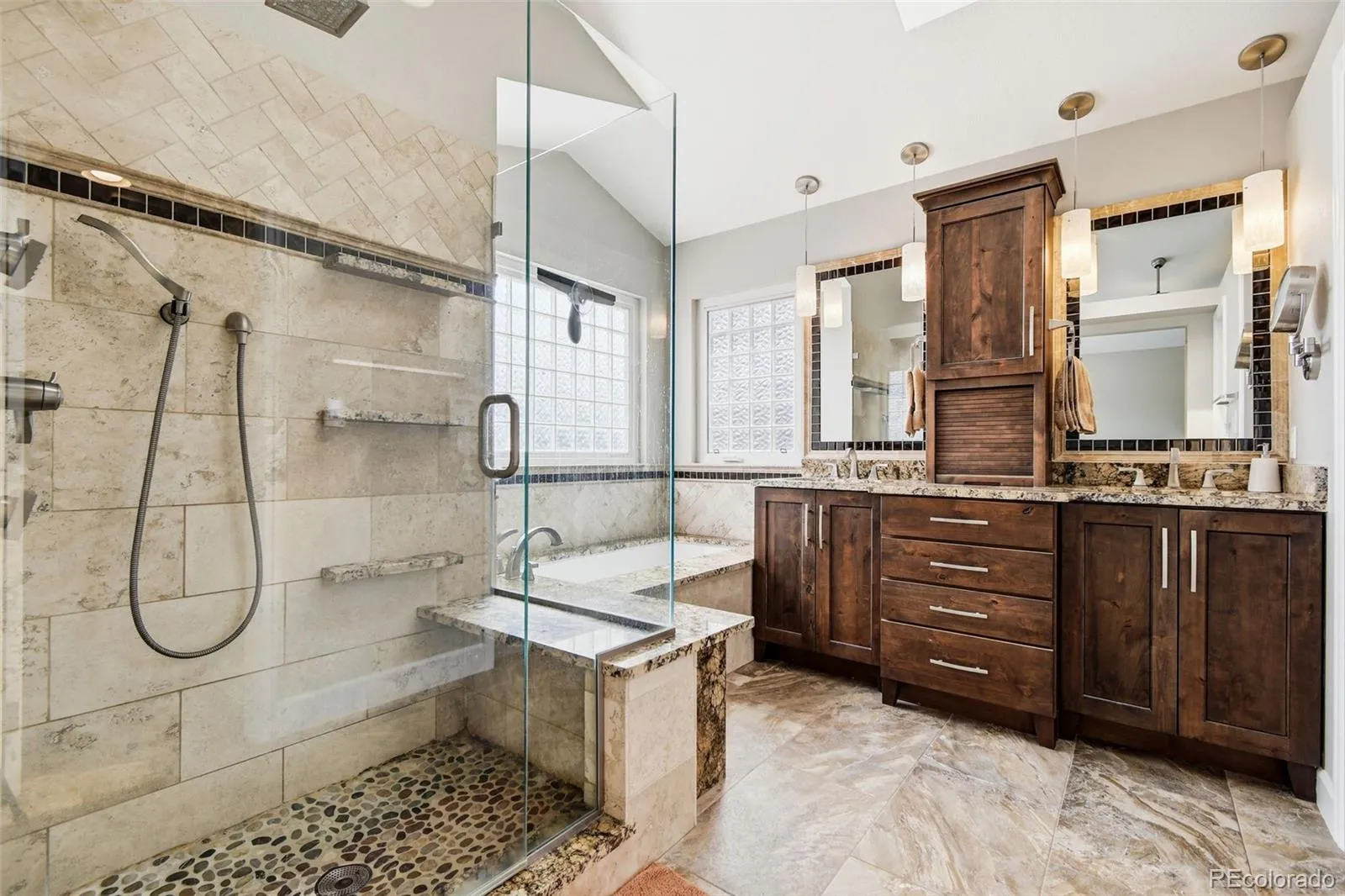 Upstairs, the primary suite offers a double-door entry, soaring ceilings, and a fully updated, spa-inspired bathroom complete with heated floors, dual vanities, granite counters, custom tile work, a glass-enclosed shower, a soaking tub, generous storage, and walk-in closet. Two additional bedrooms and a full bathroom complete the upper level, all in move-in ready condition.