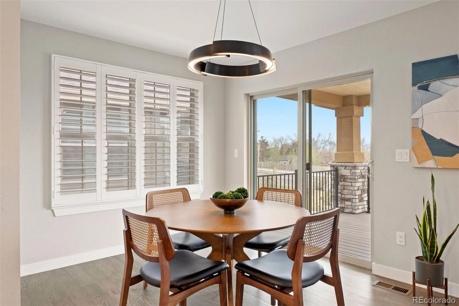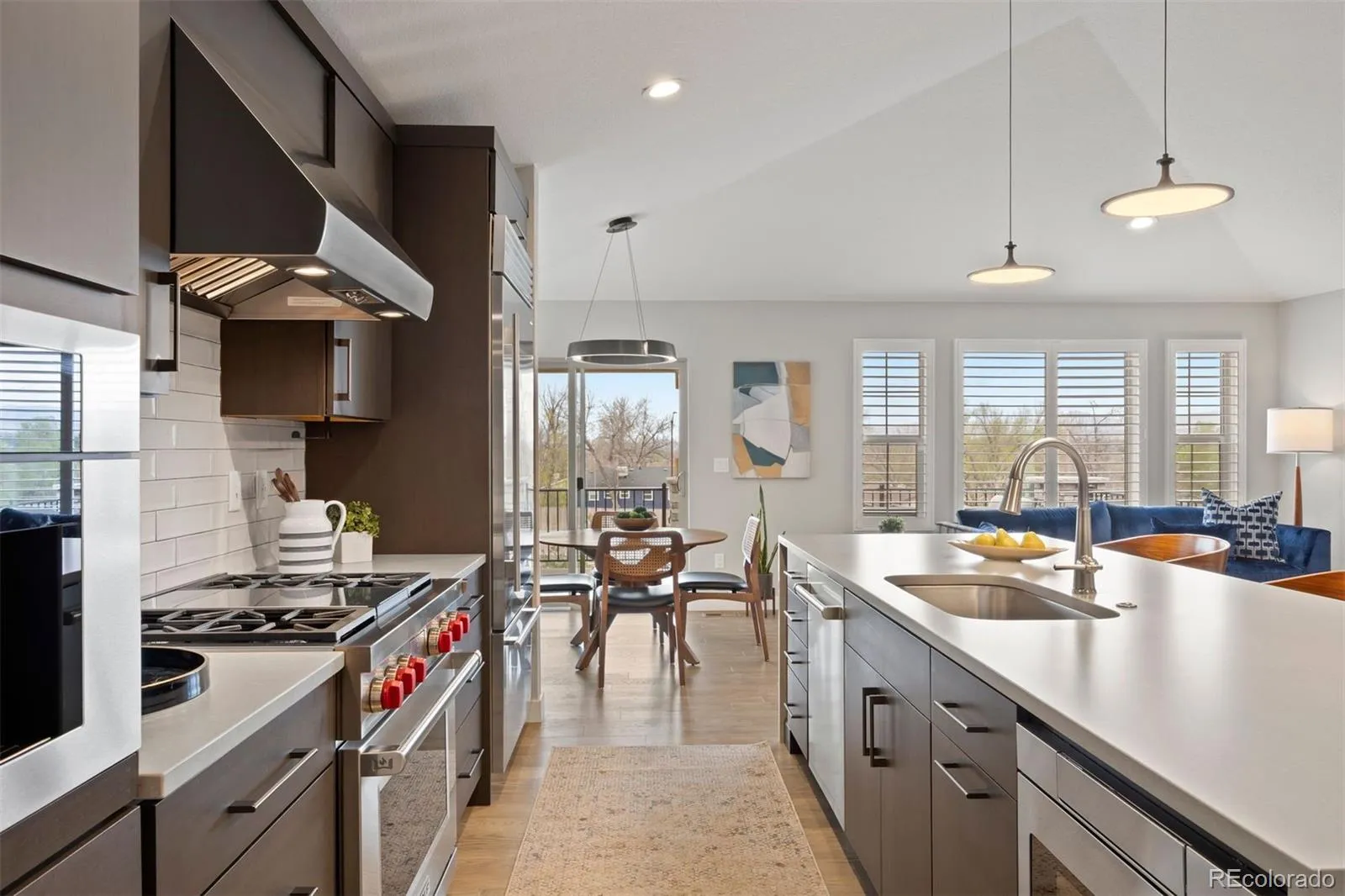 Perched atop a private bluff at the end of a quiet cul-de-sac, this exceptional ranch-style walkout home showcases sweeping mountain views and refined Colorado living at its finest. Designed for both elegance and ease, the low-maintenance residence features four bedrooms, three bathrooms, and an open-concept layout filled with natural light, soaring ceilings, and elevated finishes throughout. At the heart of the home, a stunning gourmet kitchen flows seamlessly into the great room, dining area, and outdoor living space—perfect for effortless entertaining. A dramatic quartz waterfall island is complemented by custom cabinetry and professional-grade appliances, including a 6-burner Wolf range, Sub-Zero refrigerator, and built-in Miele coffee system. The great room offers a sleek gas fireplace and opens to an expanded, partially covered deck where serene mountain views create a breathtaking backdrop. The dining area also connects to the deck, enhancing the indoor-outdoor lifestyle. Wide plank hardwood floors, designer lighting, and curated details elevate the main level. The primary suite is a private retreat with coffered ceilings and a spa-inspired five-piece bath featuring an oversized dual-head steam shower and custom walk-in closet. A main floor office, guest bedroom, bath, and laundry complete the level. The walkout lower level is designed for entertaining, with 9-foot ceilings, a spacious recreation room, and direct access to a covered patio which is wired for a future hot tub and a fully fenced yard. An additional bedroom, full bath, and generous storage provide flexibility and comfort. Enjoy lock-and-leave living with HOA services including snow removal, trash and recycling, common area maintenance, and gutter cleaning. Ideally located just minutes from the Apex Center, Arvada Center for the Arts and near shopping, dining, and parks, this home offers a perfect blend of luxury, convenience, and natural beauty.