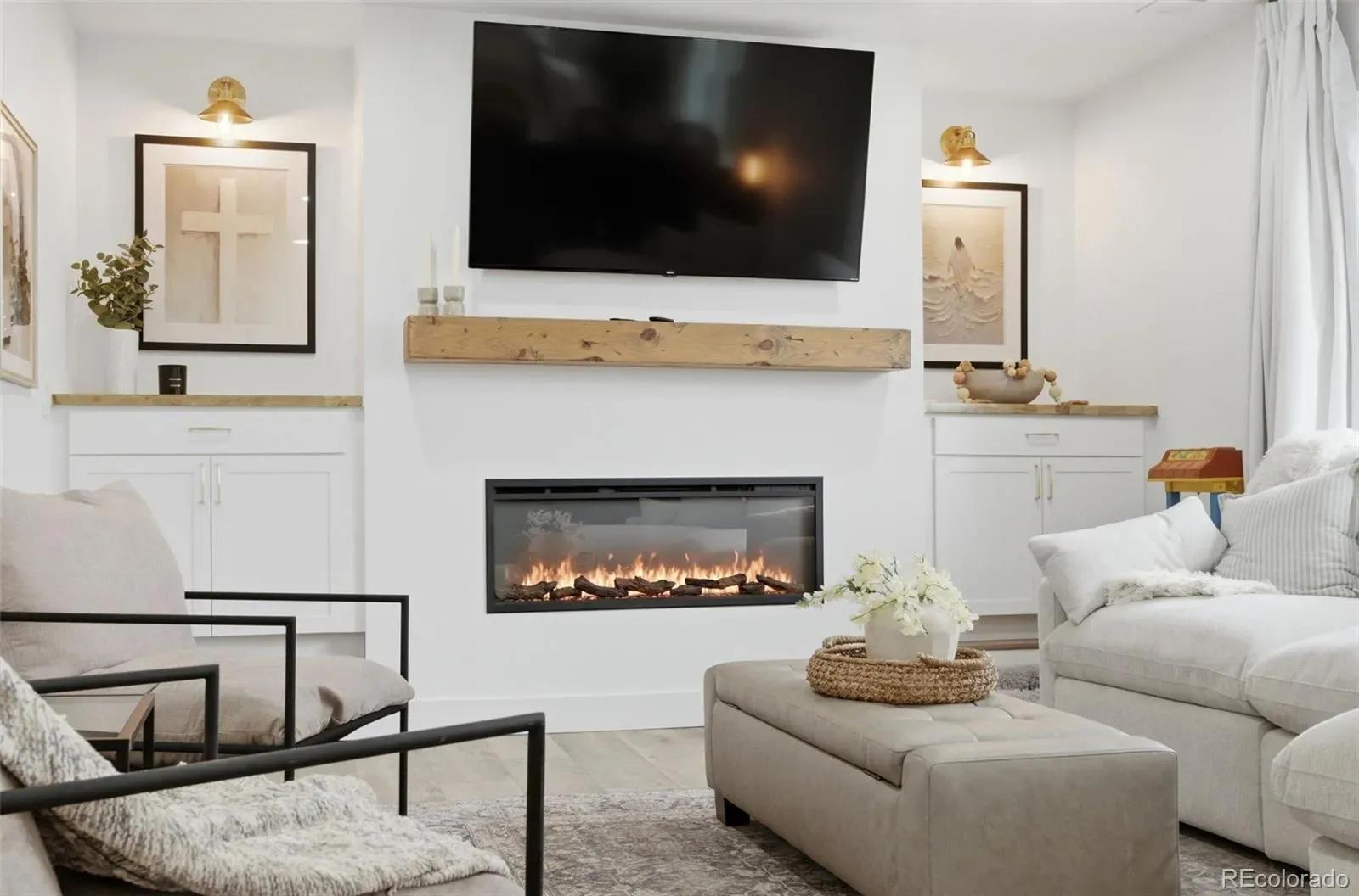 Inside, a bright open-concept floor plan creates the perfect balance of comfort and sophistication. The heart of the home is a stunning kitchen anchored by a massive statement island with seating for six or more, ideal for entertaining or gathering with family and friends. The living area is highlighted by a custom built-in fireplace wall with a sleek electric fireplace, creating a warm and stylish focal point.