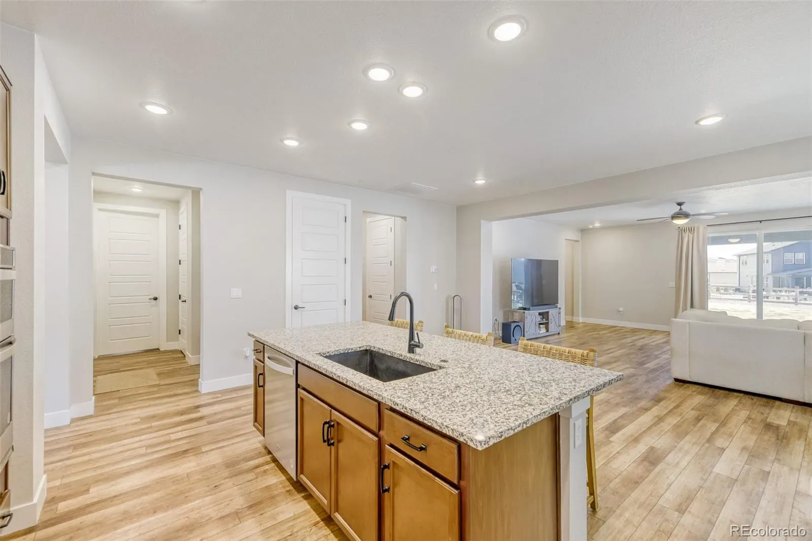 Pulte Homes has sold out in the Aurora Highlands new premier neighborhood in Aurora. Here is your chance to own the Manzanita ranch plan, their most popular model fully fenced and landscaped at a great price. This 3 bed 2 bath with study is a perfect work from home open floor plan complete with great Colorado outdoor living on your covered patio. One of the best lots Pulte offered with good rear spacing was built from a dirt start with the current owners selecting great finishes at the design center. The spacious kitchen with oversized island has a Chefs Gourmet stainless appliance setup with lots of beautiful cabinet space. This opens up to the Cafe and Gathering Room for the perfect social entertaining space, then this opens up to the large family room which leads to the outdoor living space. One large space with so many options to make your own flow. Large baseboard, 9 foot white ceilings and 8 foot doors make the whole house pop from room to room. Master bedroom offers an ensuite bath with large walk in shower, a huge walk in closet and great finishes throughout. Two more bedrooms with full bath and a large laundry room round out this Colorado Ranch style living area. Now go down to the full 2129 square foot unfinished basement ready for your custom finish that would come close to doubling the size of this home. New roof recently installed with industry leading Malarkey Legacy Class 4 hail impact rating shingles could save you on insurance now and in the future. Owners paid extra to do their best to prevent future claims. Made better to last longer for you, check the product online, a real benefit. Come see and own this beautiful home in an up and coming community with easy access to DIA/Denver, outstanding schools, shopping , pools, trails and parks. The Aurora Highlands, come visit and own today!!