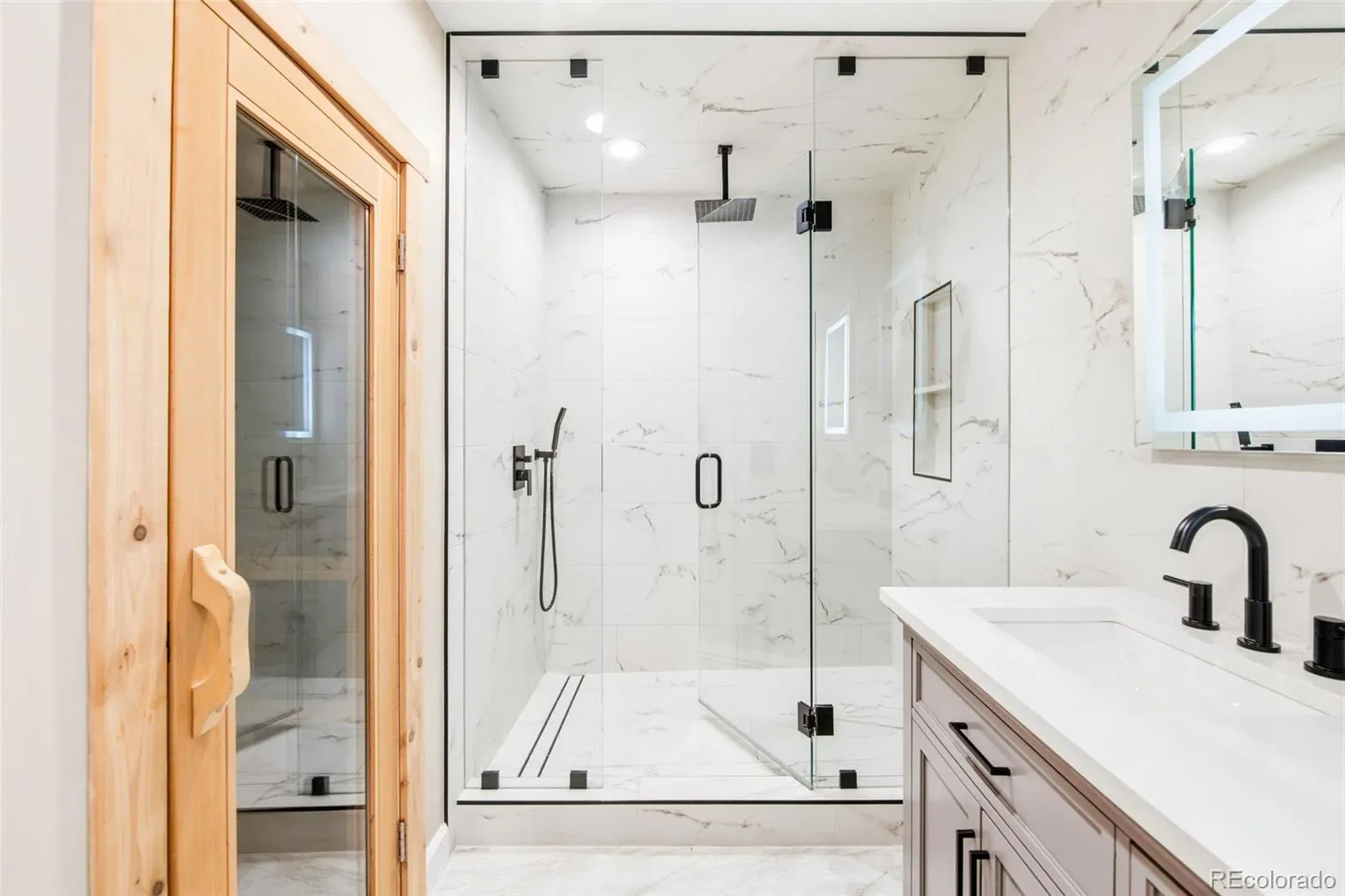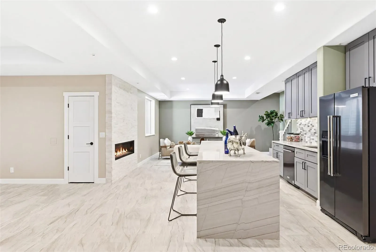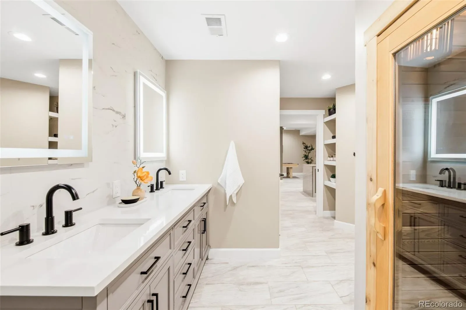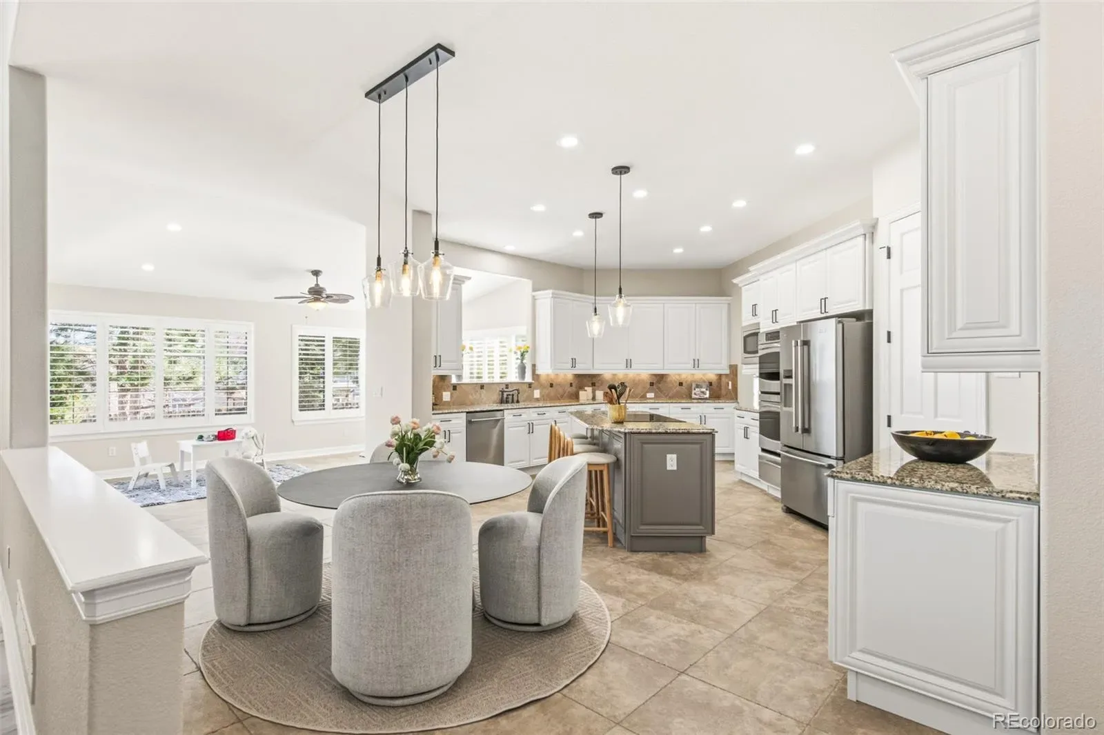 This expansive semi-custom Toll Brothers residence in Beacon Point offers a rare blend of scale, craftsmanship, and modern efficiency designed for both elevated daily living and effortless entertaining. A grand two-story foyer opens into a dramatic great room with soaring ceilings, creating an immediate sense of space and light. The kitchen is both refined and highly functional, featuring double ovens, an induction range, premium appliances, and a walk-in pantry. The main level is thoughtfully designed with a dedicated office, library, and sunroom, along with a well-appointed mudroom and laundry room. A full interior refresh in 2026, paired with custom shutters, hickory hardwoods and updated lighting, delivers a clean, cohesive, and move-in-ready aesthetic throughout. Upstairs, the primary suite is a sanctuary unto itself a built-in Miele coffee maker, wet bar, double-sided fireplace, dual walk-in closets, and a luxurious bathroom create a retreat you’ll never want to leave. The finished basement extends the living experience with a guest bedroom, KitchenAid appliance package, and an exquisitely finished spa-style bathroom with a private sauna, ideal for guests or multi-generational living. Outdoors, the backyard offers a spacious patio, a tranquil water feature, and water-efficient landscaping, creating a private and low-maintenance setting. The oversized three-car garage is equipped with built-in cabinetry, a workbench, and a dedicated 220V outlet for EV charging. A fully owned 13.1 kWh solar system, R60 insulation, dual-zone HVAC, and Class 4 impact-resistant tile roof deliver exceptional energy efficiency and near-zero utility costs. Residents enjoy a clubhouse, fitness center, resort-style pool, and tennis courts, all steps from Aurora Reservoir and miles of trails. Top-rated Cherry Creek Schools, Southlands Mall minutes away, and both DIA and DTC within 20 minutes complete this extraordinary offering.