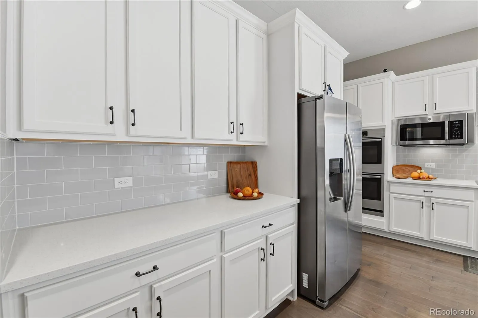 Welcome to this stunning ranch-style home by Richmond American Homes in the highly sought-after Blackstone community. Thoughtfully designed and impeccably maintained by its original owner, this move-in-ready residence blends modern luxury with everyday functionality. The main level features a spacious great room with 10’ ceilings, fireplace, ceiling fan, and mounted TV, plus durable wood flooring throughout the entry, kitchen, dining, and living areas. The gourmet kitchen offers quartz countertops, upgraded 42″ white cabinets with crown molding, tile backsplash, stainless steel appliances, double oven, custom hood, walk-in pantry, oversized island with pendant lighting, undermount sink, and touchless faucet.