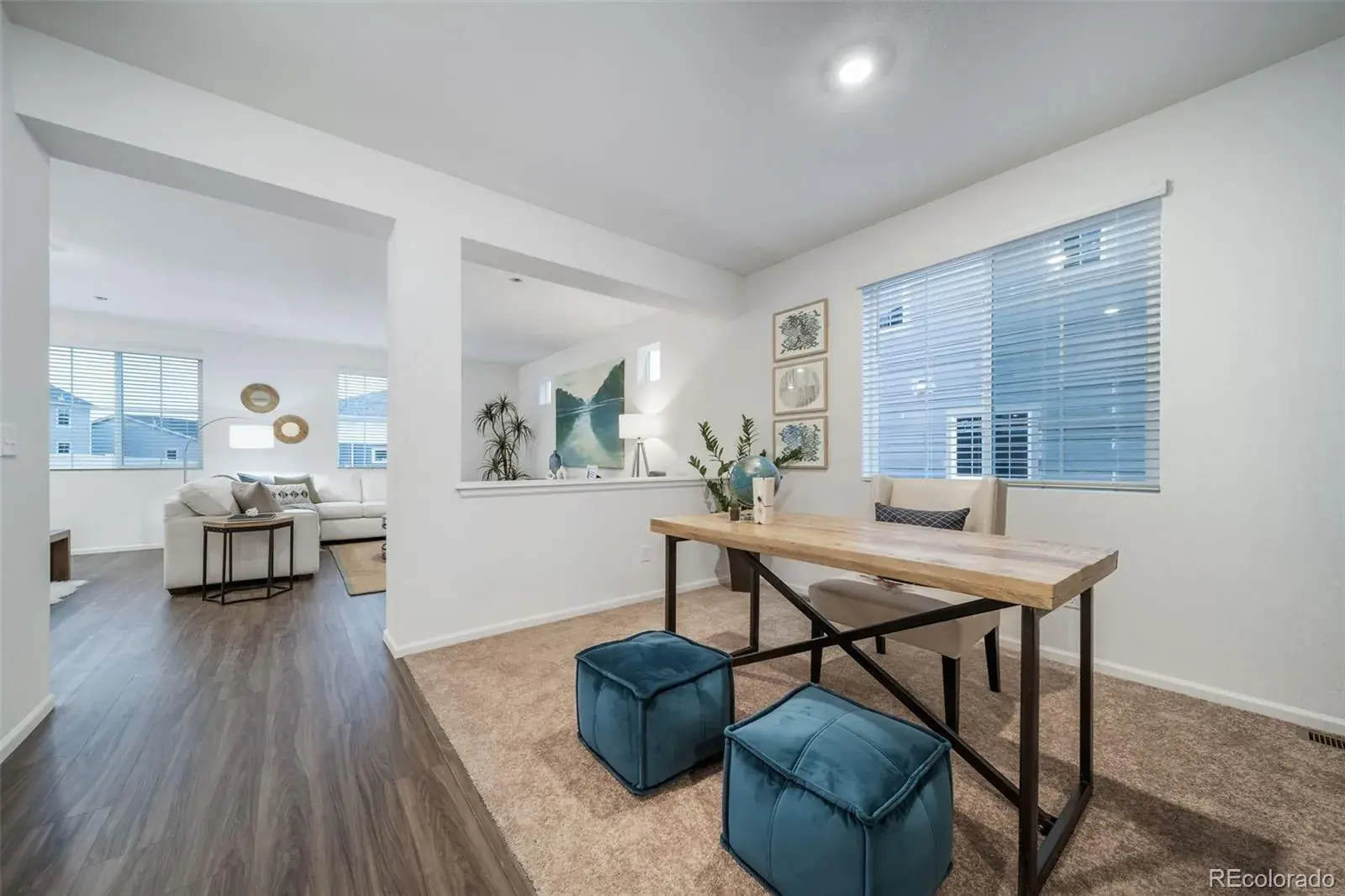 This home has plenty of curb appeal featuring a multi-textural exterior, front porch. The main level is bright with oversized windows, 9’ ceilings, home-office flex space, and an expansive “heart of the home” great room. Enjoy designer LVP flooring, Shaw carpeting, and Sherwin-Williams paint throughout. The kitchen is complete with a dining island, designer countertops, stainless-steel sink, and large pantry. The spacious primary suite offers a large walk-in closet, double vanity sink, and a tiled spa shower. The 2nd floor also features a laundry room and 3 additional bedrooms with large closets.