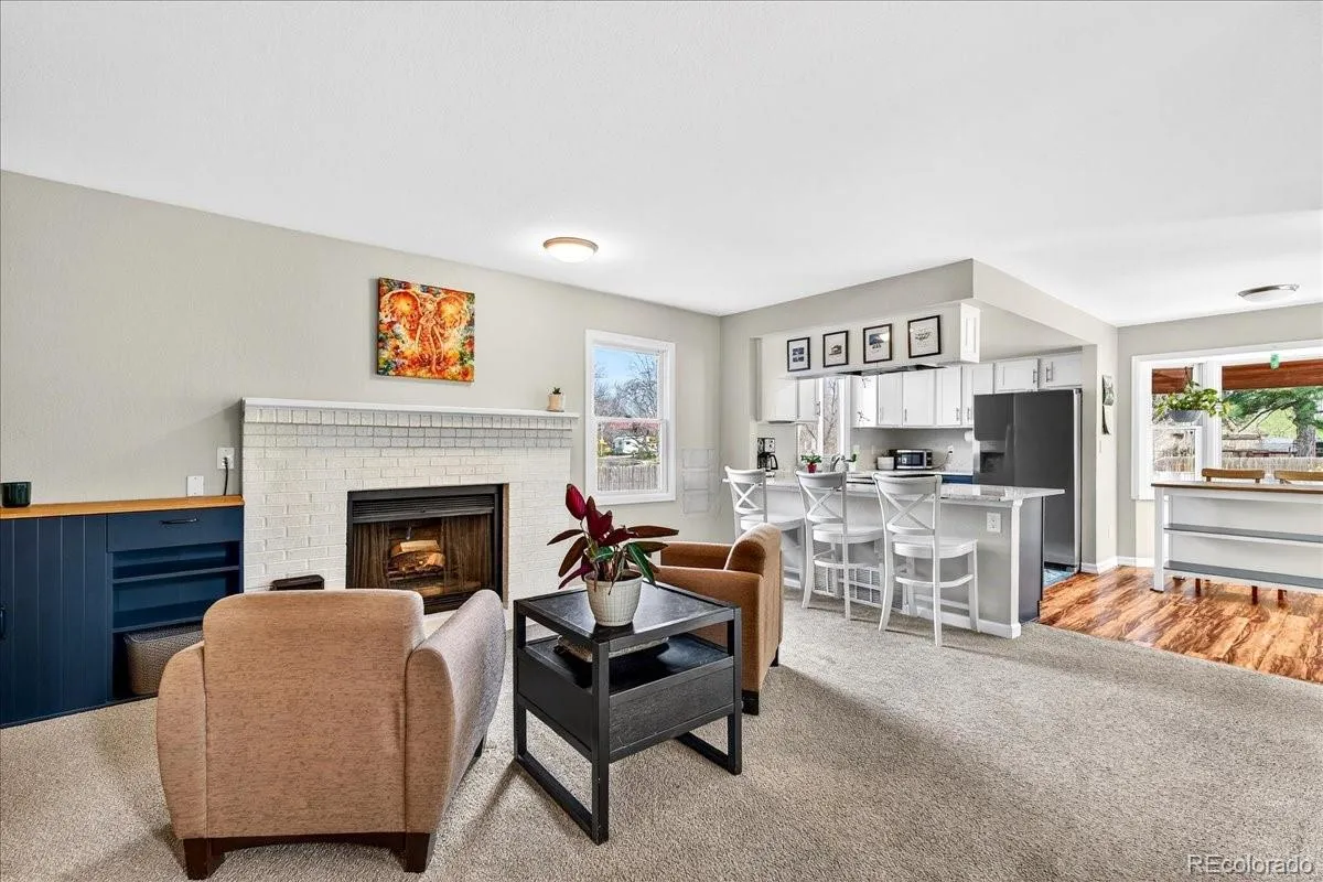 Step inside to find two spacious living areas, each with its own cozy wood-burning fireplace—perfect for Colorado evenings. One living room is highlighted by a charming bay window that fills the space with natural light, while vaulted ceilings create an open, airy feel. The kitchen features newer lower cabinets, a breakfast nook for casual dining, and a separate formal dining area.