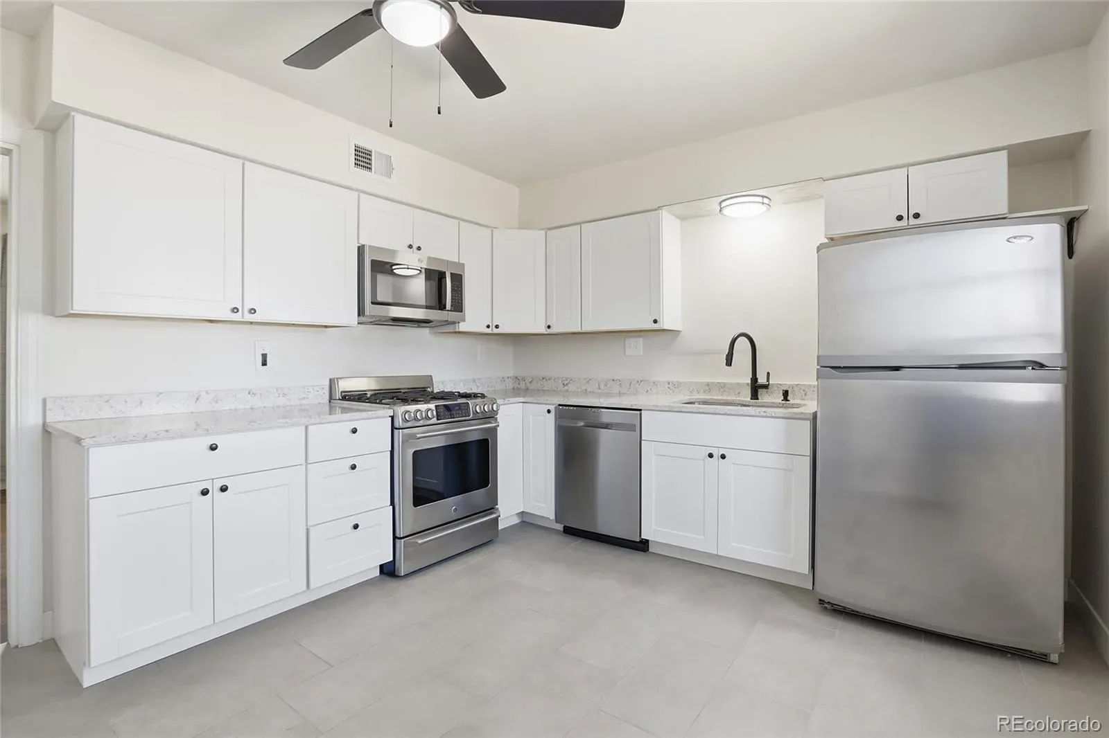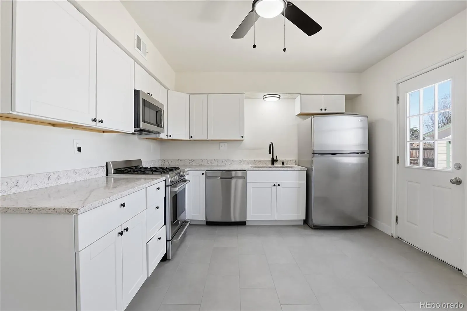 Beautifully remodeled ranch style home in Aurora. New flooring throughout, carpet in the bedrooms, hardwood floors in living room, new tile floors in bathrooms, kitchen and laundry room. Enoy living in these 3 beds 2 bath home with new gourmet kitchen. Kitchen has a gas stove, stainless steel appliances, including dishwasher and refrigerator. White cabinets with built ins, Quartz counter tops, deep stainless-steel sink and a door to the outside. The bathrooms have been remodeled with new vanities, toilets, lighting, mirrors and tile floors and main bathroom with a tile bath/shower combo. Enjoy sitting in your living/dining room area with hardwood floors and the woodburning stove to keep you warm. Newer double paned windows. Laundry room is large with lots of cabinets and full-size washer and dryer are included. All 3 bedrooms have new carpet, new windows and new ceiling fans. The house has an oversized 2 car detached garage with a long driveway for more cars, trailer or RV. The shed is attached to the garage with brand new cement floor, new cement laid on portions of the driveway, side area and back. Large yard is great to ready to make it your own oasis in the city. Inside and outside have been recently painted and all of the outside doors have been changed out. This house is available now for move in. Easy access to I225, 6th Ave, Shopping, Anschutz medical center, and Light rail is close by.