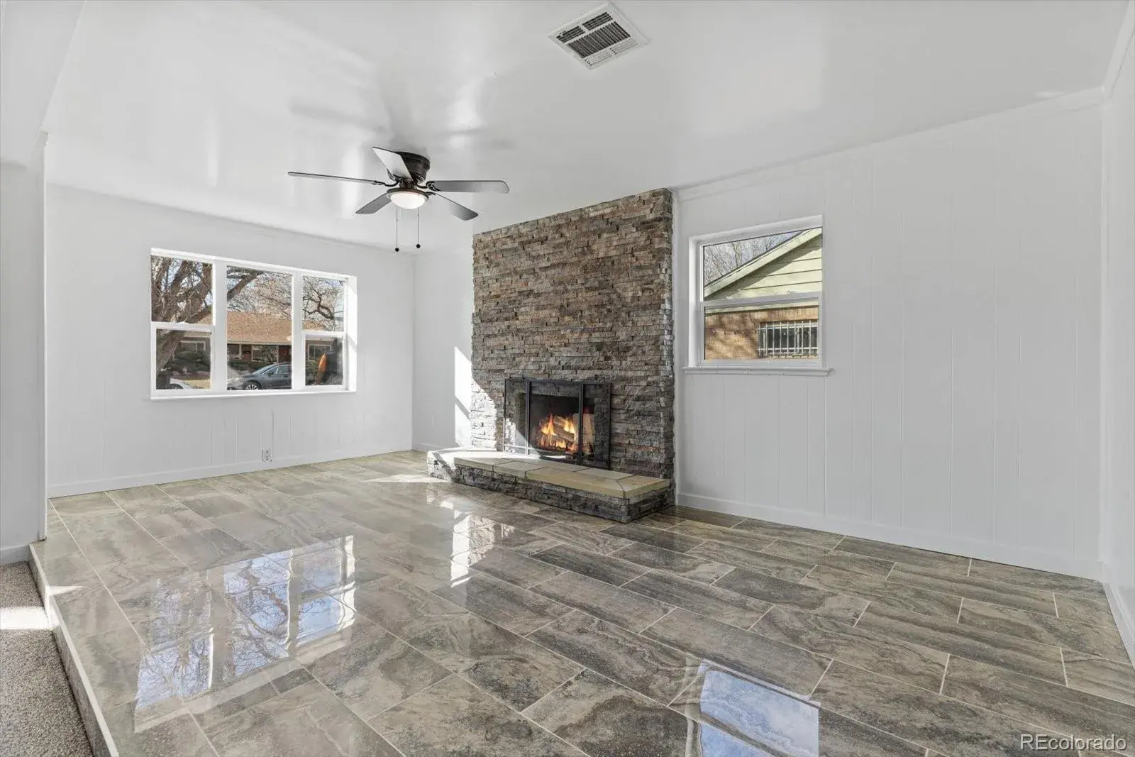 Inside, you’ll love the bright, open feel with new flooring throughout—tile, luxury vinyl plank, and plush carpet. The oversized front living room offers plenty of space to gather and centers around a stunning new stone fireplace and hearth. The kitchen has been refreshed with new quartz countertops, and the home features new lighting, ceiling fans, and trim throughout.
