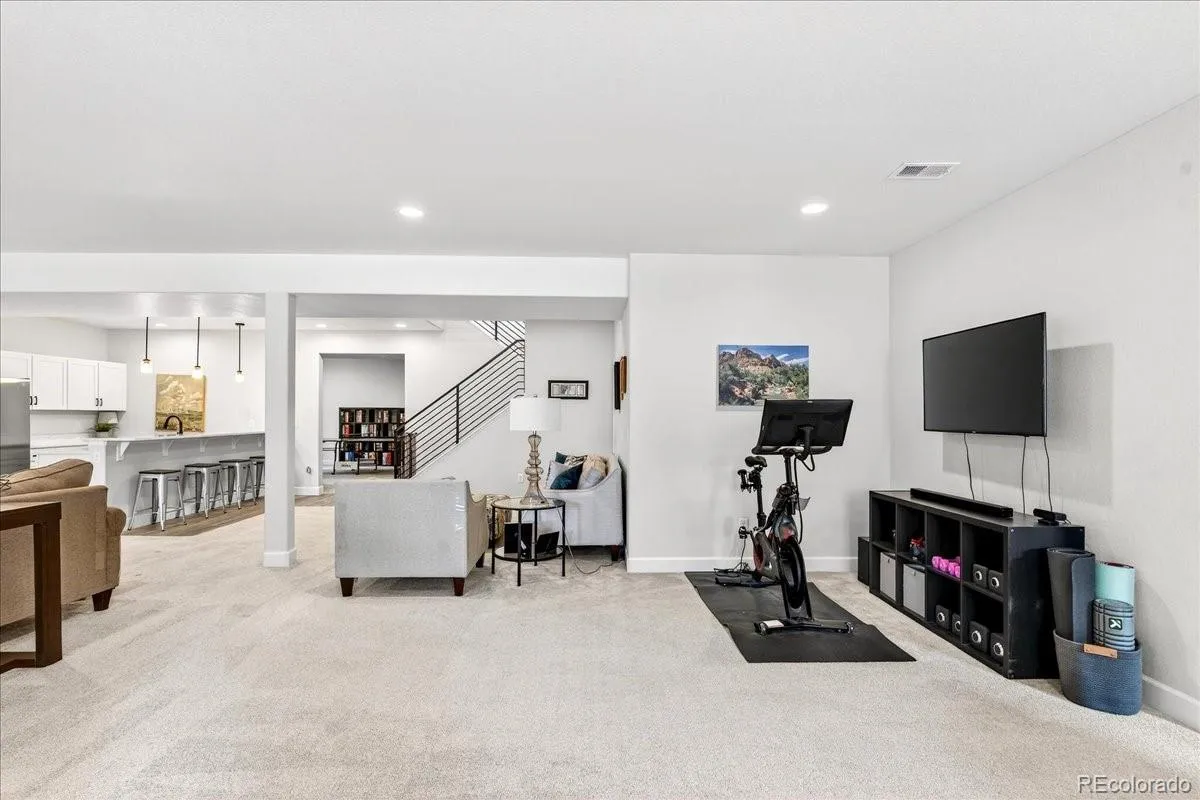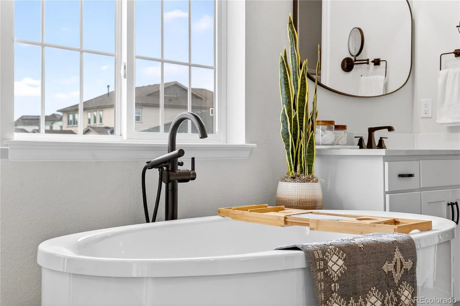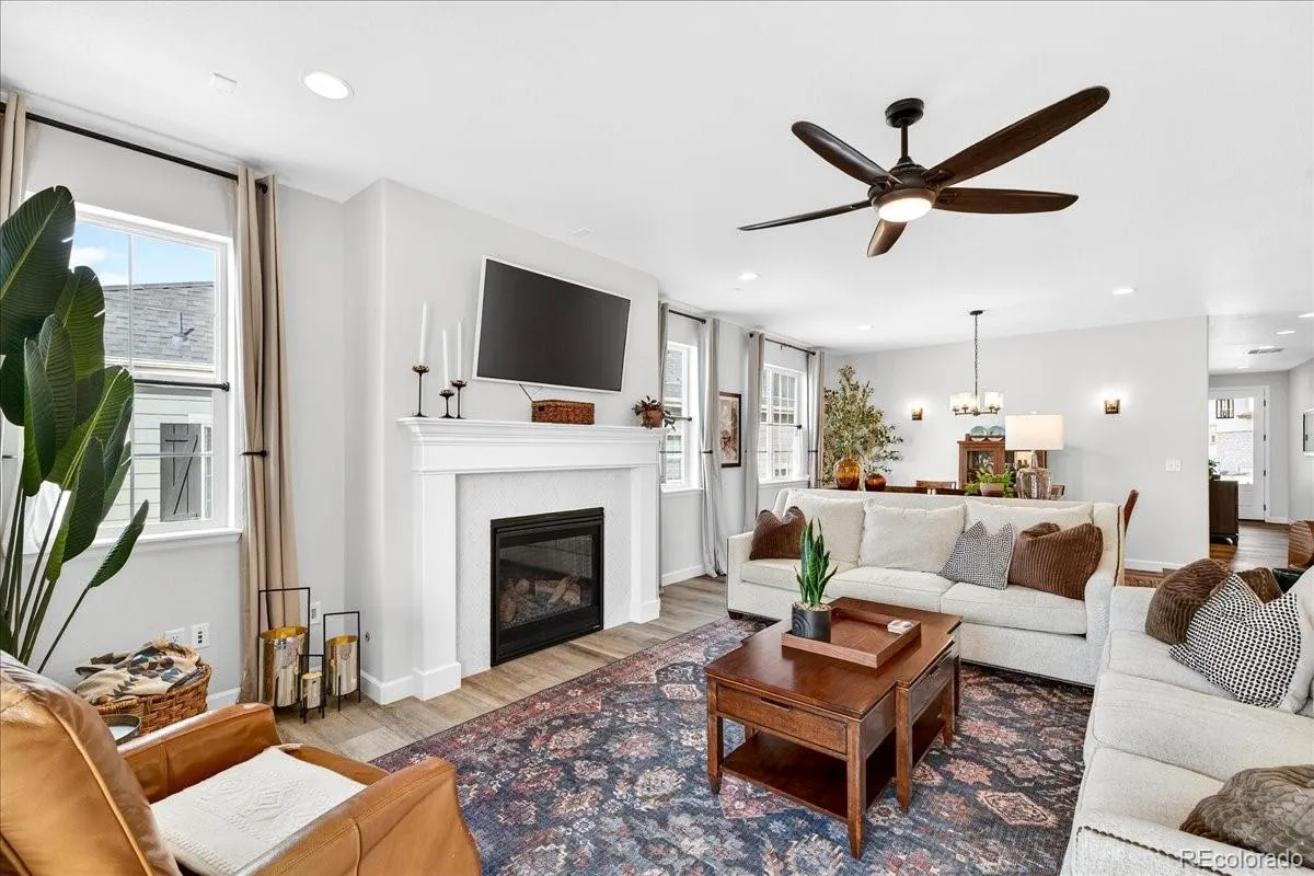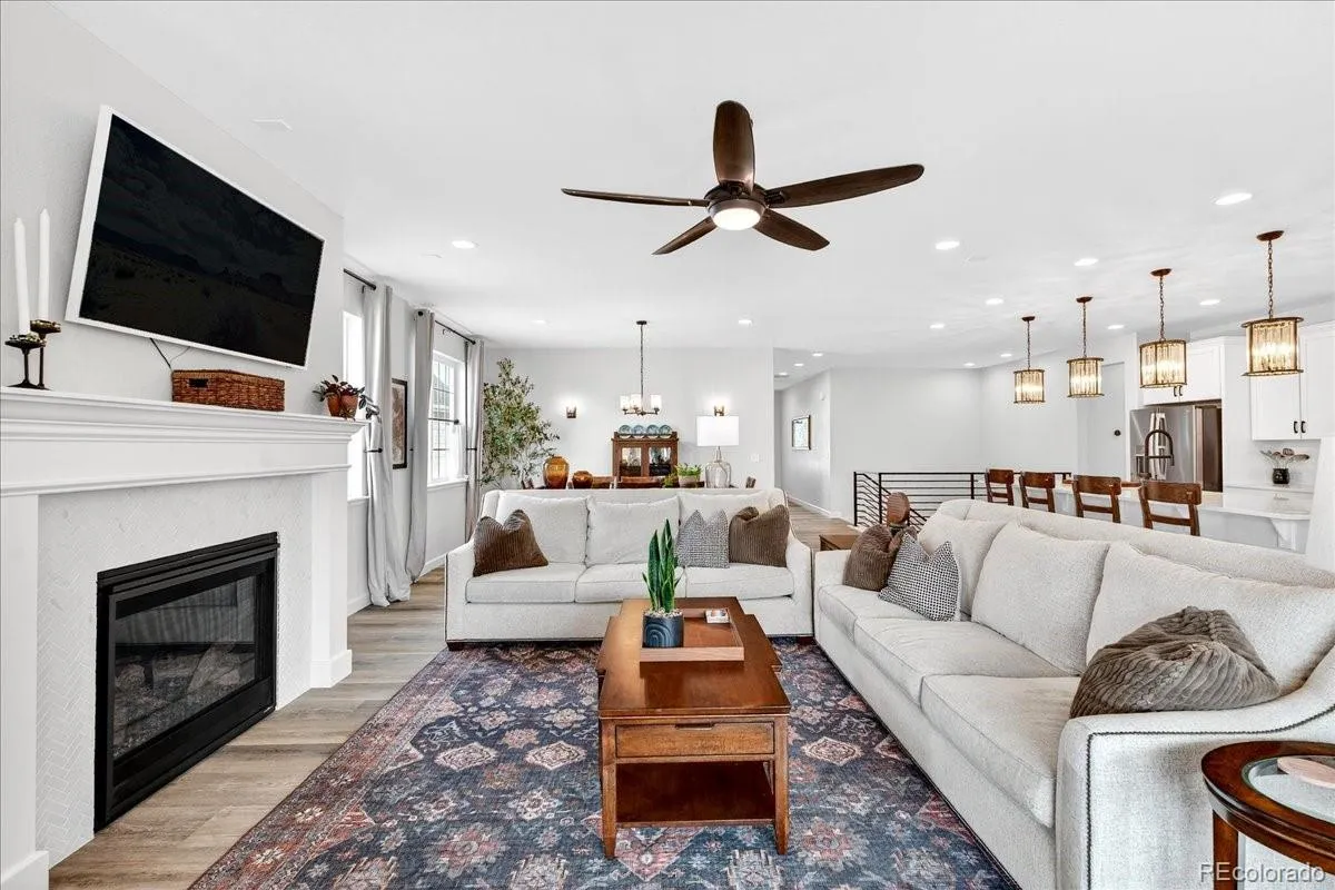 Set on a quiet cul-de-sac across from open space, this 4-bedroom, 5-bath ranch-style home in Southshore offers a sense of openness that’s increasingly rare—where the curve of the street creates wider sightlines and a more relaxed, less crowded setting. Inside, tall ceilings and abundant natural light define the main level, enhanced by a full-length glass front door that brings in both light and views. The open floor plan flows effortlessly from the kitchen into the great room, where a herringbone tile fireplace adds a custom focal point. The kitchen is both functional and inviting, featuring a gas cooktop with hood, stainless steel appliances, an oversized island designed for gathering, and a walk-in pantry—all opening to a space that feels connected yet comfortable. The main level is thoughtfully arranged with a private office and three bedrooms, including two secondary bedrooms each with their own ensuite bath. The primary suite is set apart and feels like a true retreat, complete with a freestanding tub, oversized shower, 2 generous walk-in closets, and upgraded flooring for a more finished feel. The finished garden-level basement extends the home in a meaningful way, offering a full wet bar with bar fridge and full refrigerator, expansive rec space, a secondary living area, bedroom, and bath—ideal for guests, entertaining, or flexible use. Thoughtful upgrades throughout—including upgraded lighting, mirrors, window coverings, ceiling fans, a whole-home humidifier, and landscaping—bring a more refined, cohesive feel. A 3-car garage, covered outdoor living, and access to Southshore’s pools, clubhouse, trails, and Aurora Reservoir complete a home that balances space, setting, and livability. An assumable VA loan may offer a valuable financing advantage for qualified buyers.