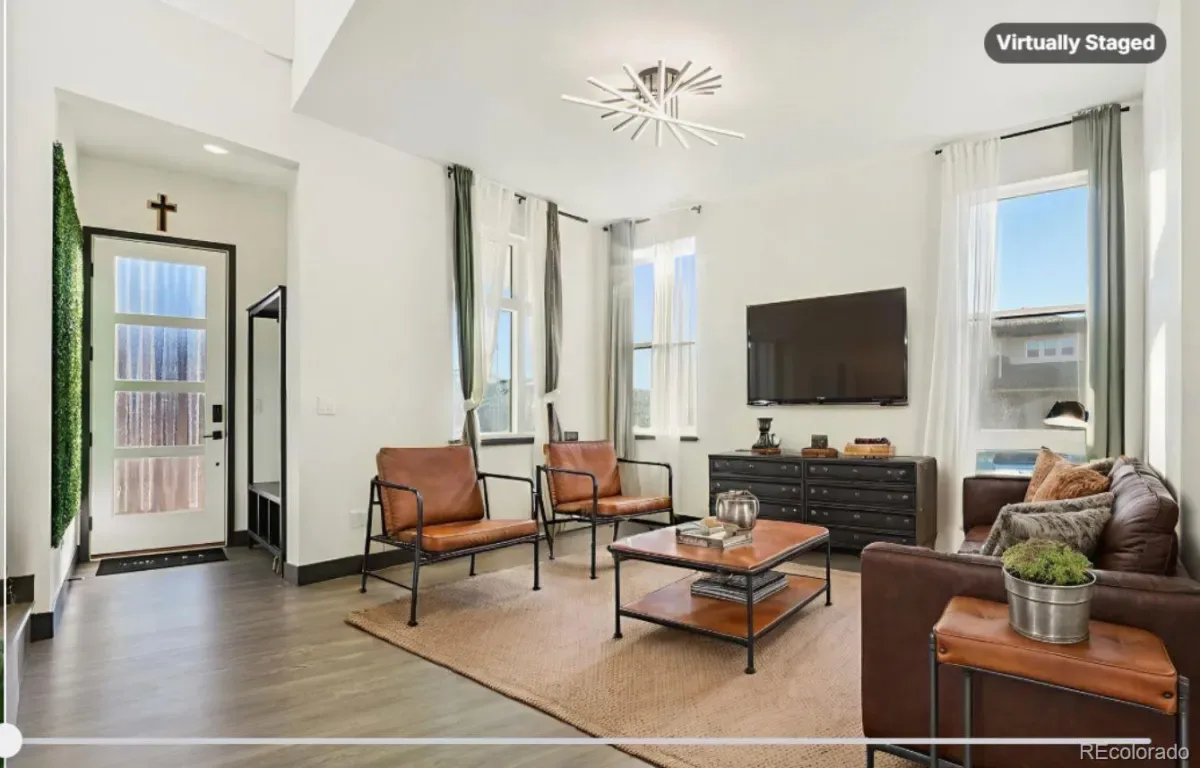 Built in 2022 in Painted Prairie, this 4-bedroom, 4-bath home offers 2,739 finished sq ft on a landscaped corner lot with a private balcony, covered deck, covered patio, front porch, fenced yard, and oversized attached garage. The main level features 10-foot ceilings and an open layout connecting the kitchen, dining, and living areas. Kitchen details include quartz countertops, shaker cabinetry, stainless steel appliances, gas cooktop and oven, pantry, oversized island, cup wash at the main sink, and custom pendant lighting. Upstairs, the primary suite includes vaulted ceilings, a walk-in closet, private balcony, and bath with tile shower, bench, and dual vanities. Two additional upper-level bedrooms, a full bath, loft, and upper-level laundry with custom built-in storage add flexibility and function. The finished basement expands the floor plan with a recreation area, flex bedroom or office, 3/4 bath with walk-in shower, storage room, sub-panel, in-wall safe, and radon mitigation system. Additional features include central air, tankless water heater, smart thermostat, security system, camera wiring with POE runs, TV rough-ins, remote garage opener with camera, keypad entry, smart locks, Samsung refrigerator, Samsung washer and dryer, side swing gate, dog run, and 220V garage outlet for compatible tools or charging needs. The property also includes wood, tile, and carpet flooring, double-pane windows, egress windows, window coverings, black trim and windowsills, horizontal railings, rain gutters, private yard, and south-facing exposure with city and mountain views noted in MLS. Painted Prairie amenities include parks, playgrounds, garden area, and trails, with High Prairie Park and Periwinkle Park shown nearby on the property map. Convenient access to Peña Boulevard, I-70, DIA, Downtown Denver, and the Anschutz Medical Campus supports commuting and regional travel.