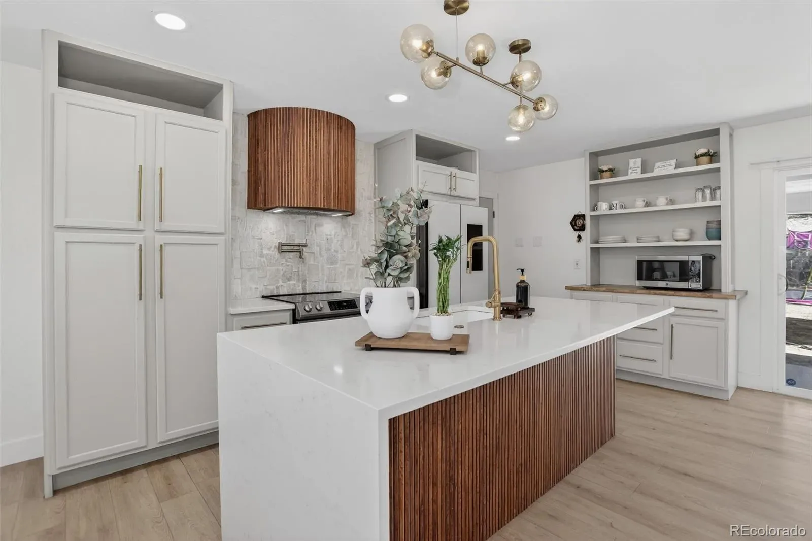 The kitchen sets the tone immediately. Quartz countertops, a pot filler over the range, a smart refrigerator, a large island, custom wood accents, and gold fixtures throughout. It is the kind of kitchen that makes people stop mid-tour and start mentally moving in. The open dining area flows right off it, making the main level feel connected and easy to live in.
