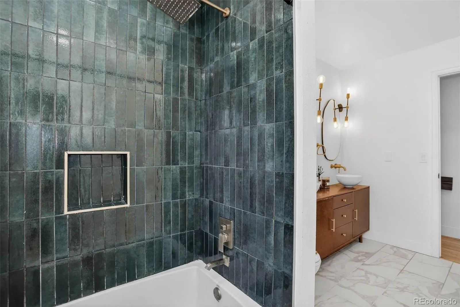 The primary suite delivers on every level. Dual closets, custom lighting, hardwood floors, and a fully renovated en-suite with dual entry, dual sinks, dark brown cabinetry, gold accents, and a stunning green tile surround shower. Two additional bedrooms upstairs carry the same hardwood warmth throughout.
