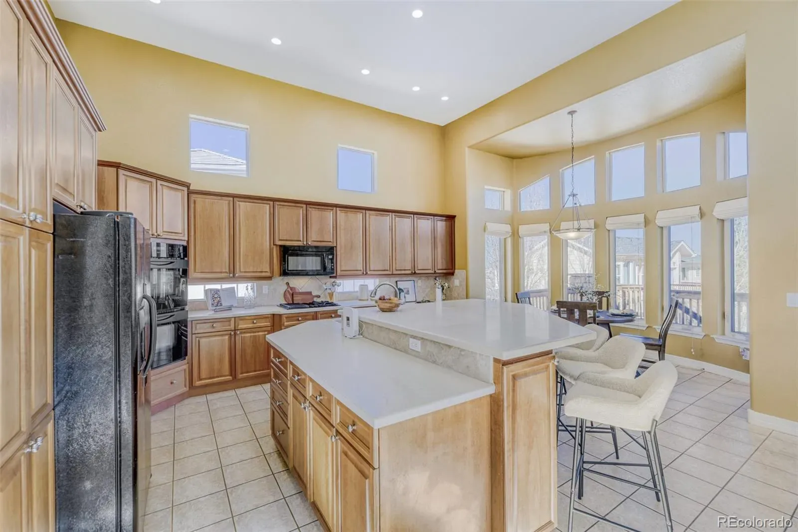 The kitchen includes extensive cabinetry, generous counter space, a large island with seating, double ovens, gas cooktop, tiled flooring, built-in desk area, and a separate eat-in space surrounded by curved windows. A formal dining room sits conveniently nearby.