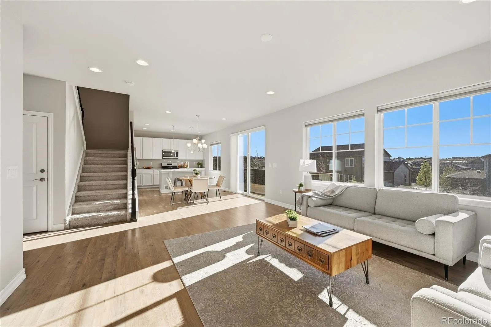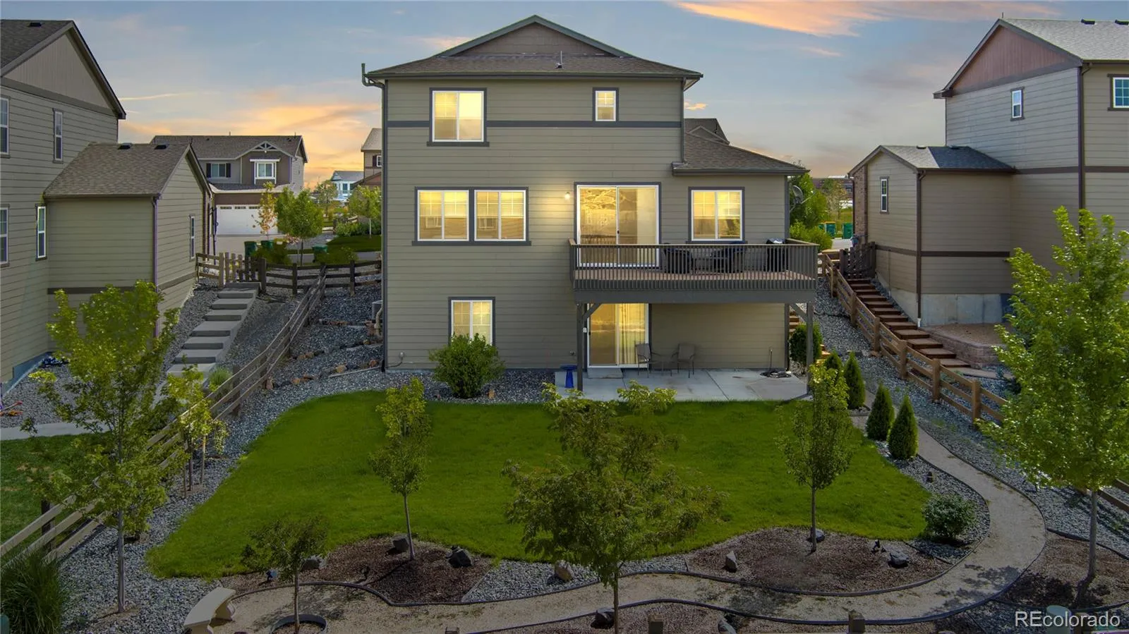 Welcome to an exceptional home in the highly sought-after Southshore at Aurora, where elevated positioning, breathtaking views, and effortless living come together beautifully. Perched on a premium lot, this home captures sweeping, unobstructed views for miles—enjoy stunning sunrises, sunsets, and open skies from your private outdoor spaces. From the front porch, you can see the Southshore clubhouse-neighborhood school- easy walk to both. Inside, you’ll find a light-filled, open-concept layout designed for everyday living/entertaining. The gourmet kitchen features quartz countertops, white cabinetry, stainless appliances, gas range, walk-in pantry, & a large island with seating. The kitchen flows into the dining area & expansive family room, offering incredible space & flexibility. Large windows fill the home w/ abundant natural light, creating a warm & inviting atmosphere. The main floor includes a bedroom with ¾ bath, ideal for guests, office, or multi-generational living. Upstairs, the primary suite offers beautiful views, a luxurious bath, & walk-in closet. Two additional bedrooms, a full bath, upper-level laundry room w/ washer-dryer included. The unfinished w/o bsmt opens to the backyard-offers endless potential. Enjoy a beautifully landscaped yard and access to Southshore’s amenities, including the Aurora Reservoir, clubhouse, pool, fitness center, trails, and parks. Turn-key, light, bright, and ideally located—this is Colorado living at its best.