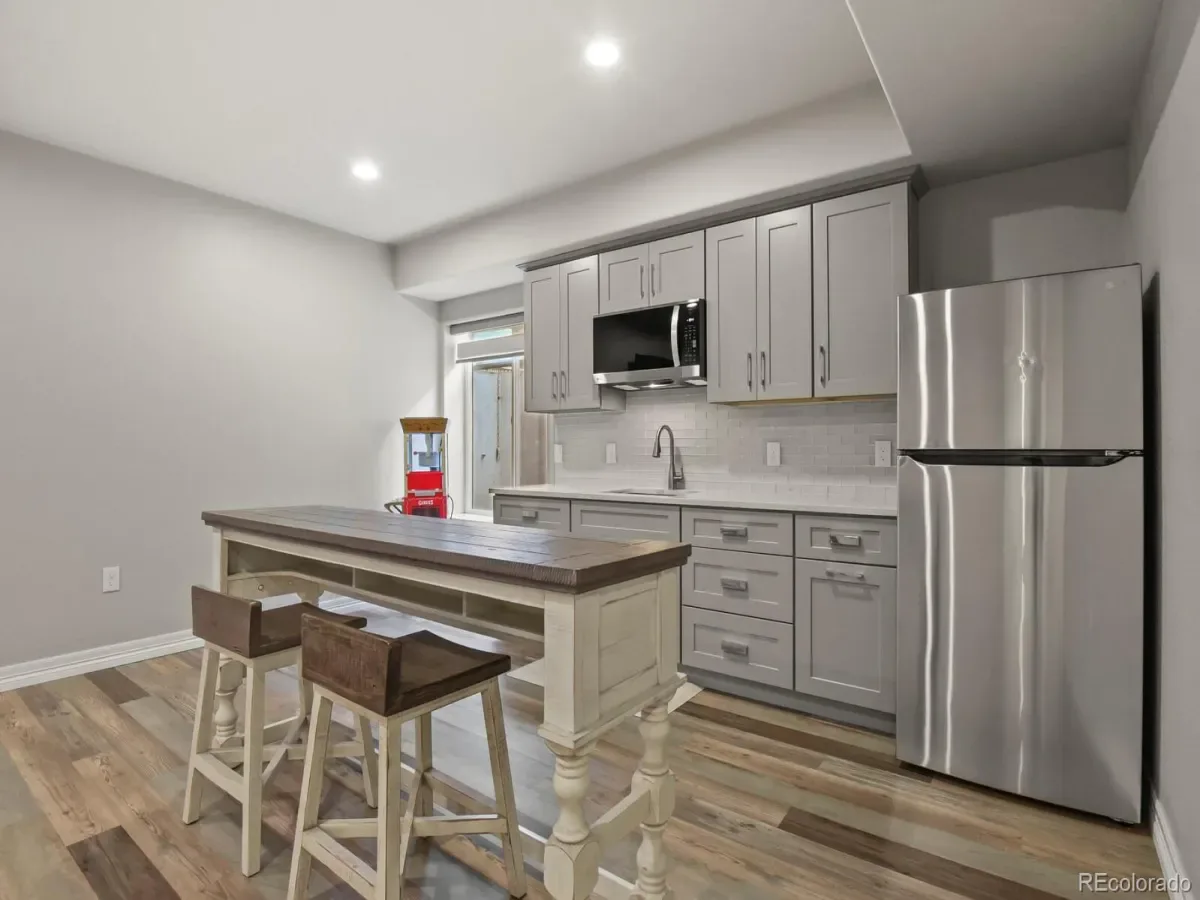 The open, finished basement features a versatile kitchen with cabinetry, quartz counters, sink, and appliances, plus an additional eating area, private bedroom with large closet, and full bathroom—perfect for guests or entertaining.