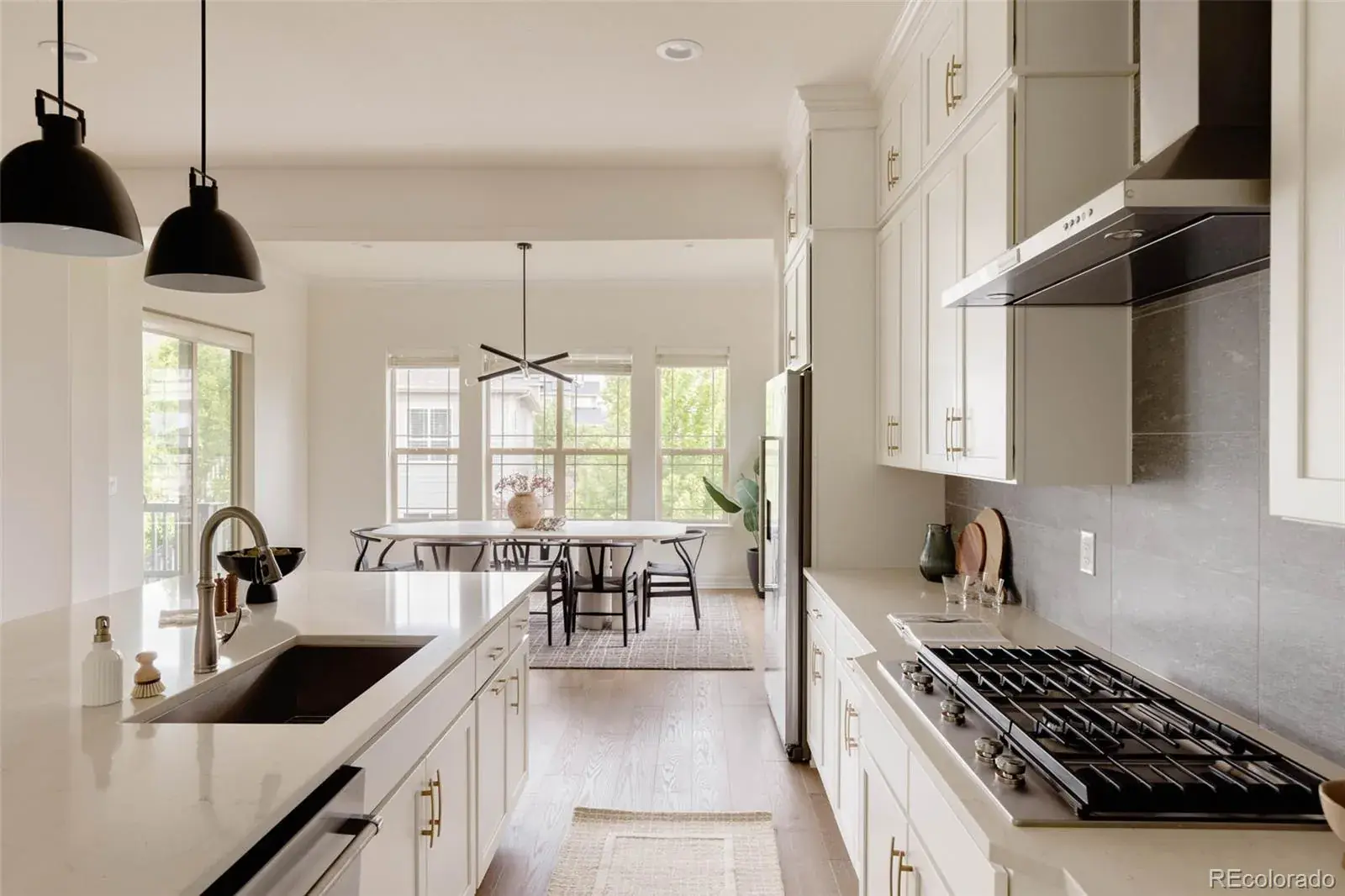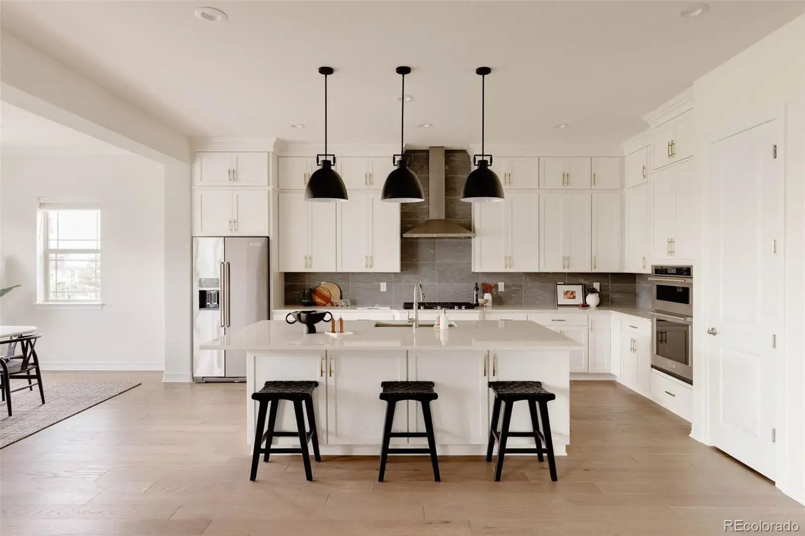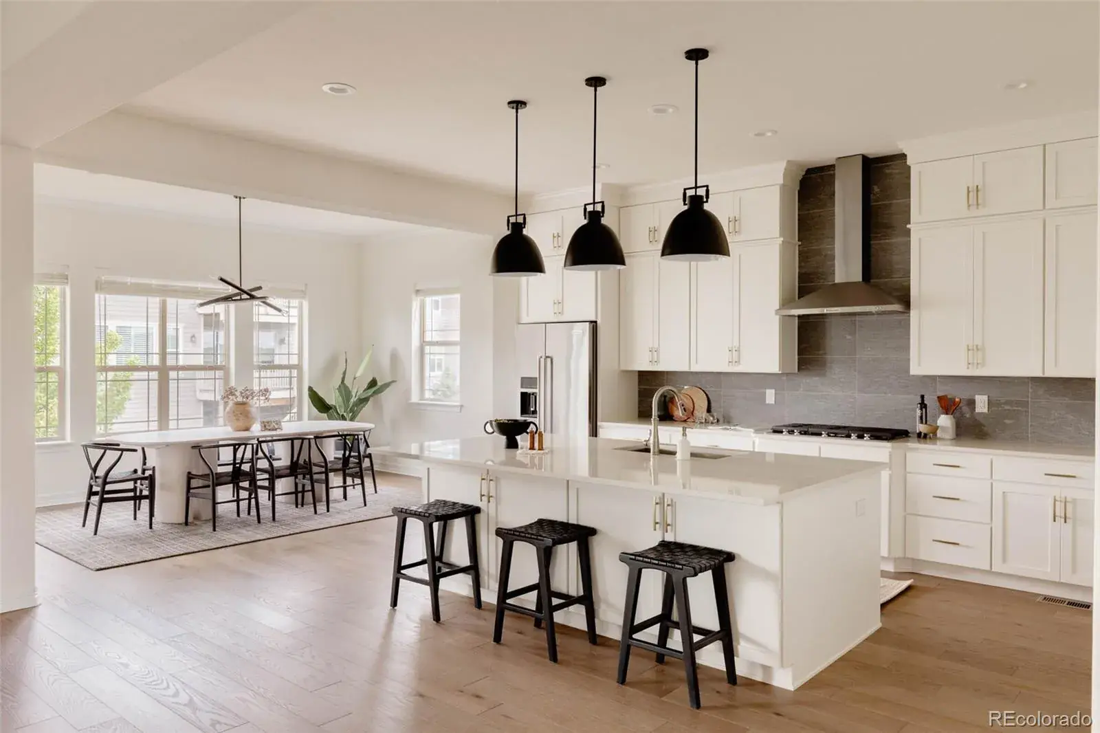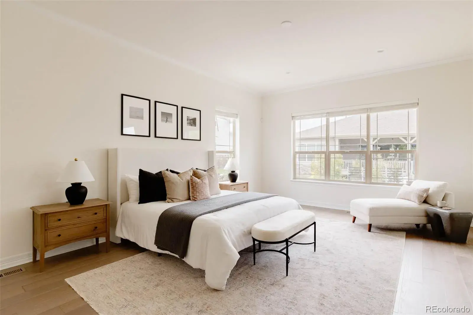 Nestled between 2 resort-style clubhouses & pools, & part of the award-winning Cherry Creek School District, this home offers the best of Colorado living w/scenic trails, vibrant parks, state-of-the-art fitness centers, & the Aurora Reservoir steps away. Inside, the great room impresses with soaring 12ft ceilings & a stunning 15ft stacked slider to access an extended patio, while the dining area has a picturesque view of the reservoir. A gas fireplace with tile surround anchors the space, complemented by engineered wide-plank oak floors & recessed LED lighting throughout. The kitchen shines w/ stacked white cabinetry to the ceiling, quartz countertops, designer lighting, an extended island perfect for entertaining, & upgraded stainless steel appliances including a gas range. A large pantry completes the space. The main level features a secondary bed w/ its own en-suite bath, providing comfort & privacy for guests or family. An additional bedroom with French doors can be used as a study, showcasing water views for an ideal work-from-home retreat. The primary suite is a sanctuary with a luxurious en-suite bath boasting double vanities, upgraded countertops, a large walk-in shower with floor-to-ceiling tile, a soaking tub & a large walk-in closet. The convenient mud/laundry room enhances daily organization. The garden-level unfinished basement is bright with six large windows & ready for your custom vision, including plumbing rough-in. Upgrades include custom blinds, enhanced sound & garage insulation, gas fireplace fan, in-line humidifier, & radon detection system. The 3-car garage is pre-wired for an EV charger; the backyard is wired for a swim spa or hot tub. Outdoors, enjoy a beautifully landscaped yard w/ dual retaining walls & a custom water runoff channel. Relax on an expanded rear deck w/water views. The deck has a gas line, perfect for grilling, while a hot/cold hose bib in the front yard adds convenience. South-facing driveway ensures easy snowmelt in winter.