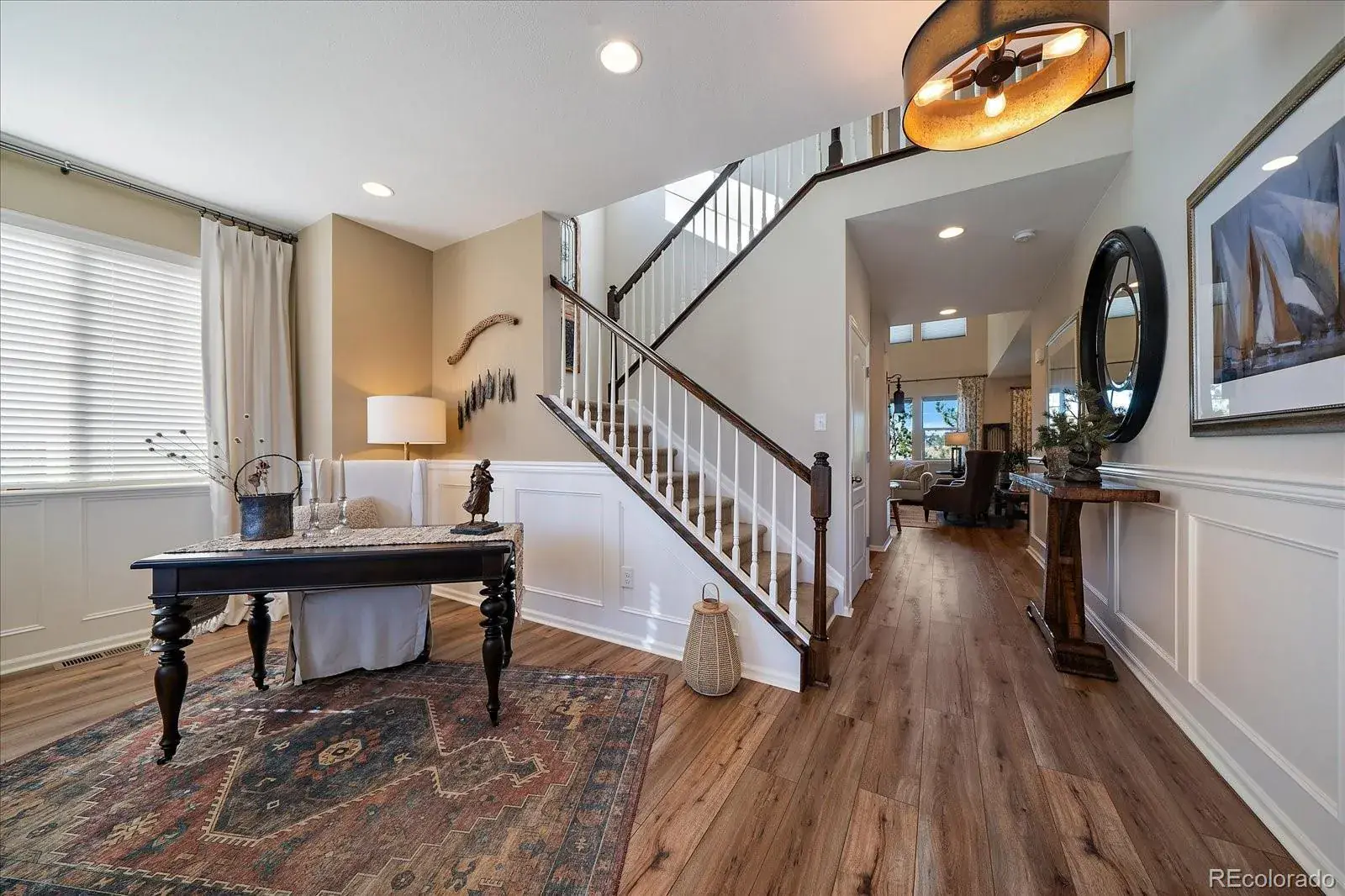 You will absolutely love this move in ready former model home located in the wonderful Southshore community! This home backs up to open space and Anchor Point Park where you have immediate access to the trails that lead to the Aurora Reservoir and the clubhouse. The beautifully landscaped yard has hardwired lighting and can be controlled with an app. The entry lights follow the sun and moon. But wait until you step into this gorgeous home! The high ceilings and windows bring in loads of light. The floors have been newly replaced with luxury vinyl. The walls have been recently painted and some lighting replaced. The kitchen is a dream with stunning granite, large island and amazing new appliances. The mudroom is a great space to store shoes and coats as well as doggie leashes if needed. Upstairs you will find a perfect loft for additional office or flex space a very large primary bedroom with a luxurious 5 piece bath, plus 2 more large bedrooms and another full bath. You will especially appreciate the laundry conveniently located on this floor.
