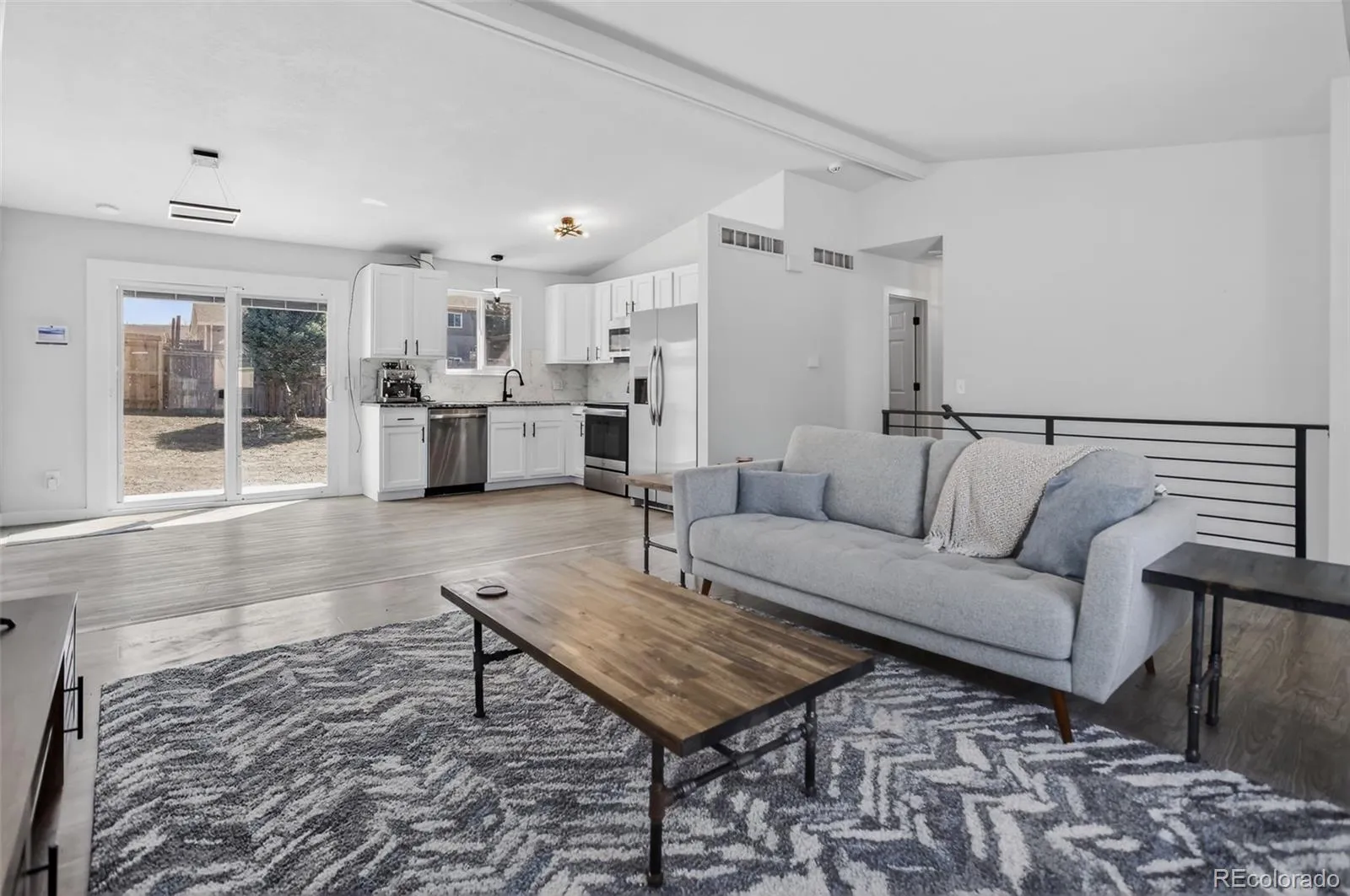 The heart of the home is the open main living area, where vaulted ceilings and abundant natural light create a bright and inviting atmosphere. The kitchen is beautifully appointed with sleek modern finishes and stainless steel appliances, seamlessly connecting to the living space for easy everyday living.