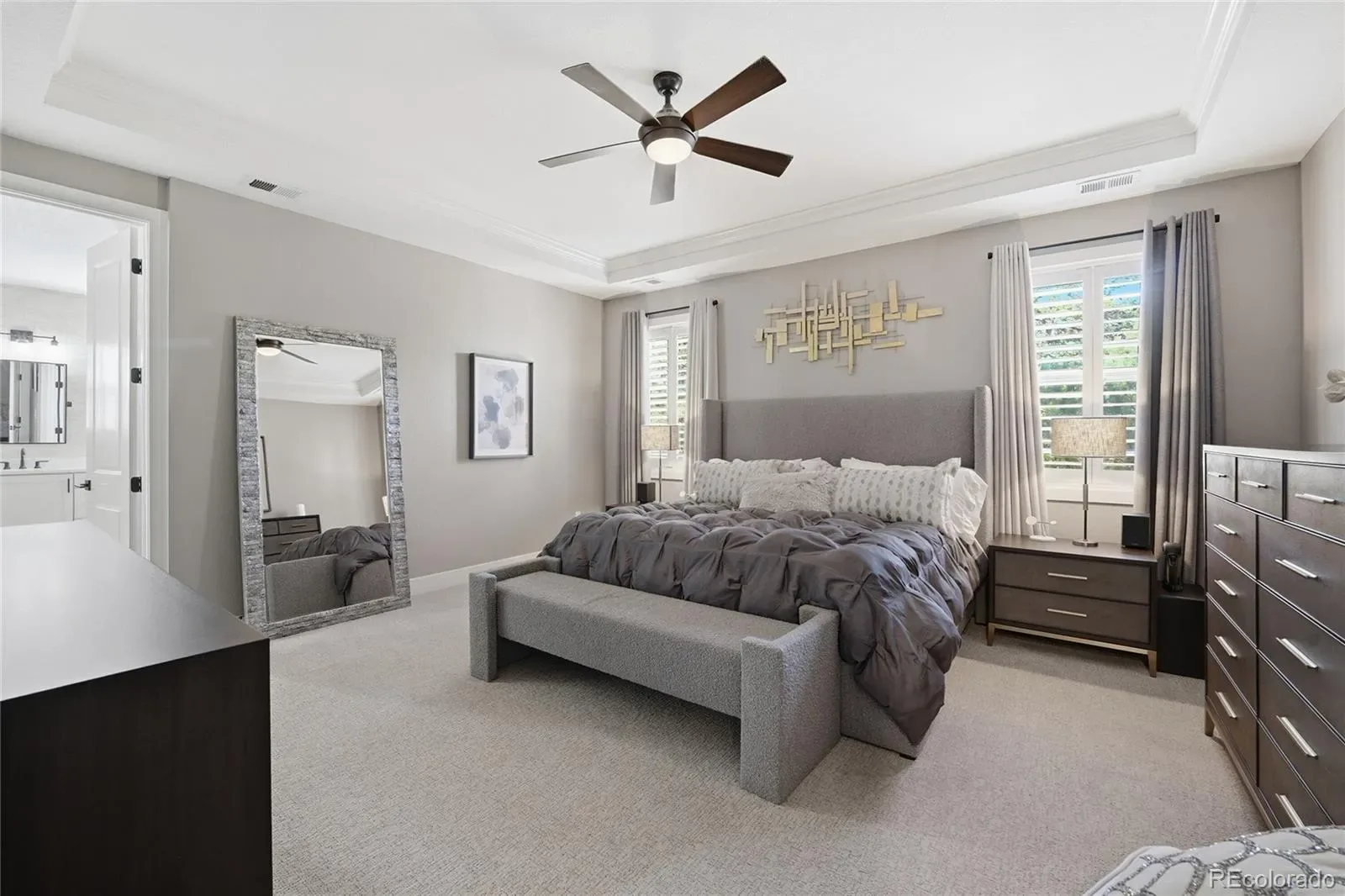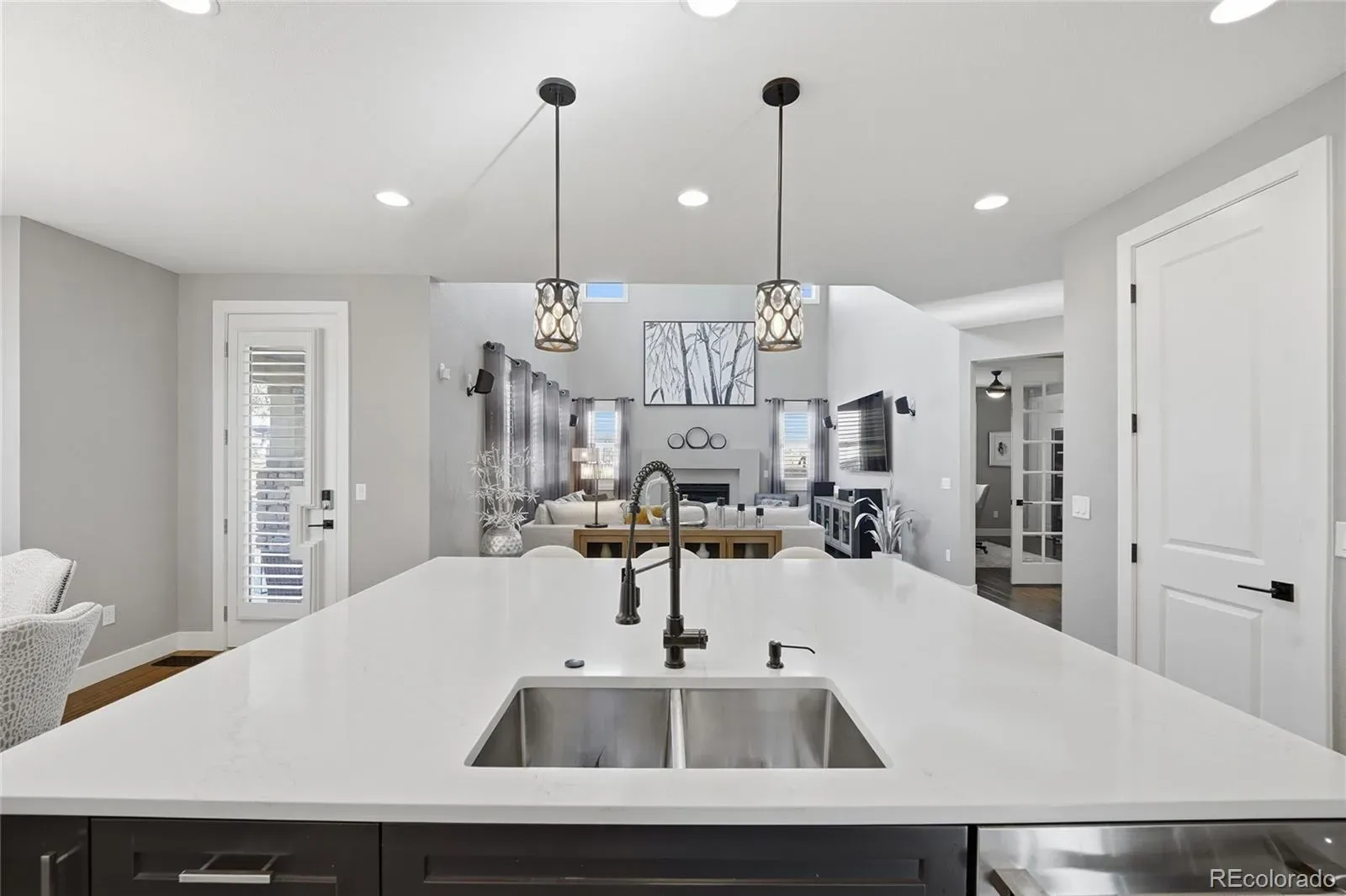 The living room showcases vaulted ceilings and hand-scraped hardwood floors, flowing seamlessly into the formal dining room with a vaulted coffered ceiling. The spacious kitchen, featured in Colorado’s Best Kitchens Magazine (Fall 2021), offers custom cabinetry, a designer vent hood, high-end JennAir appliances, and a built-in wine refrigerator.