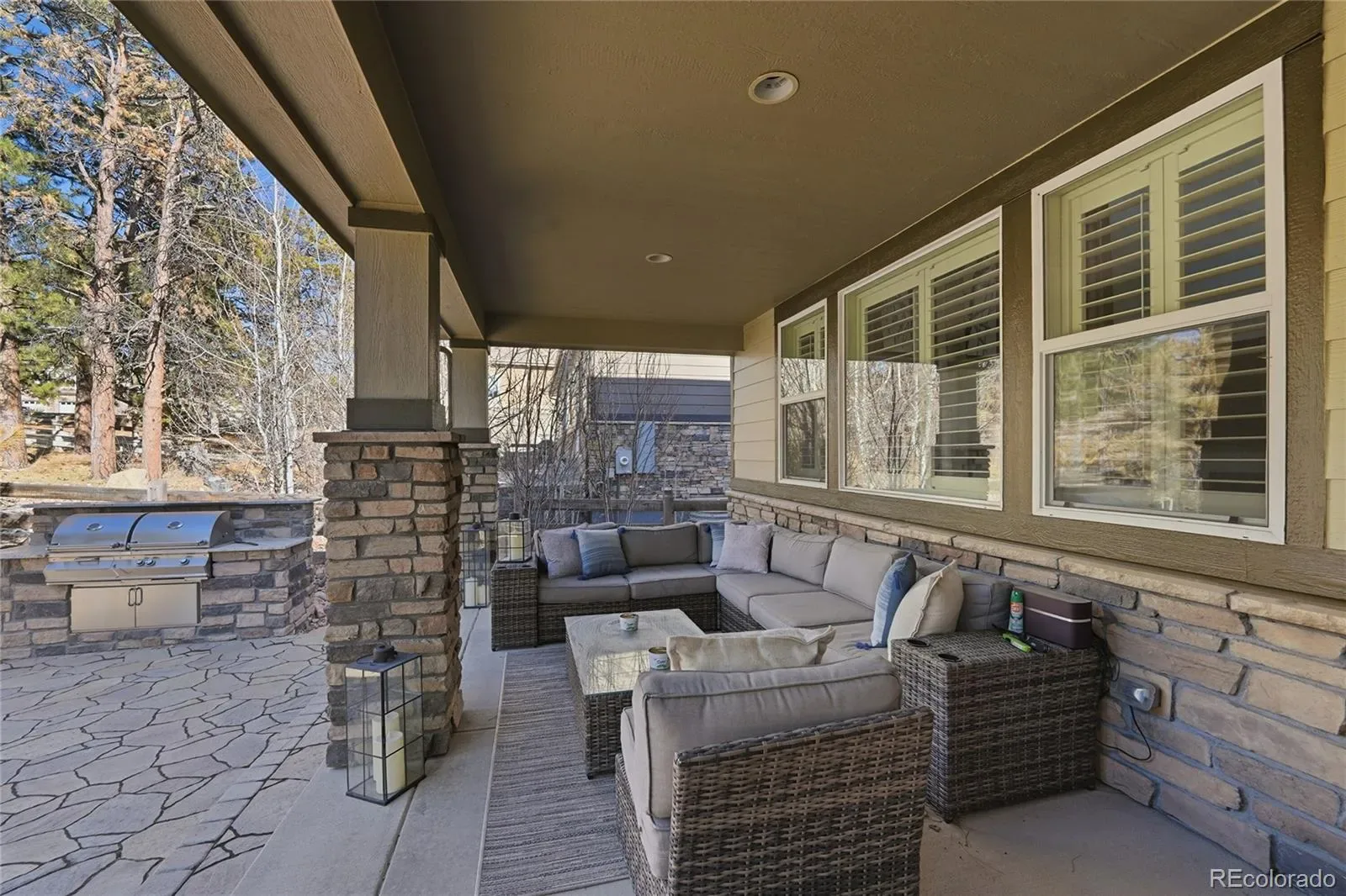 The south-facing homesite is surrounded by mature ponderosa pines and offers exceptional outdoor living, including a covered patio, built-in gas grill, gas fire pit, water feature, and professionally landscaped yard.