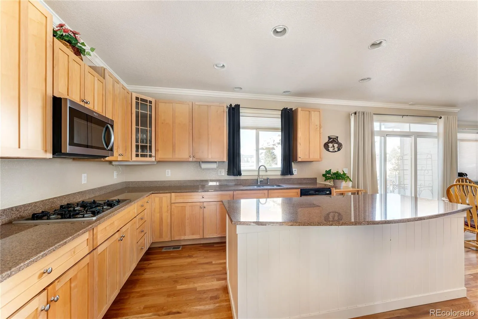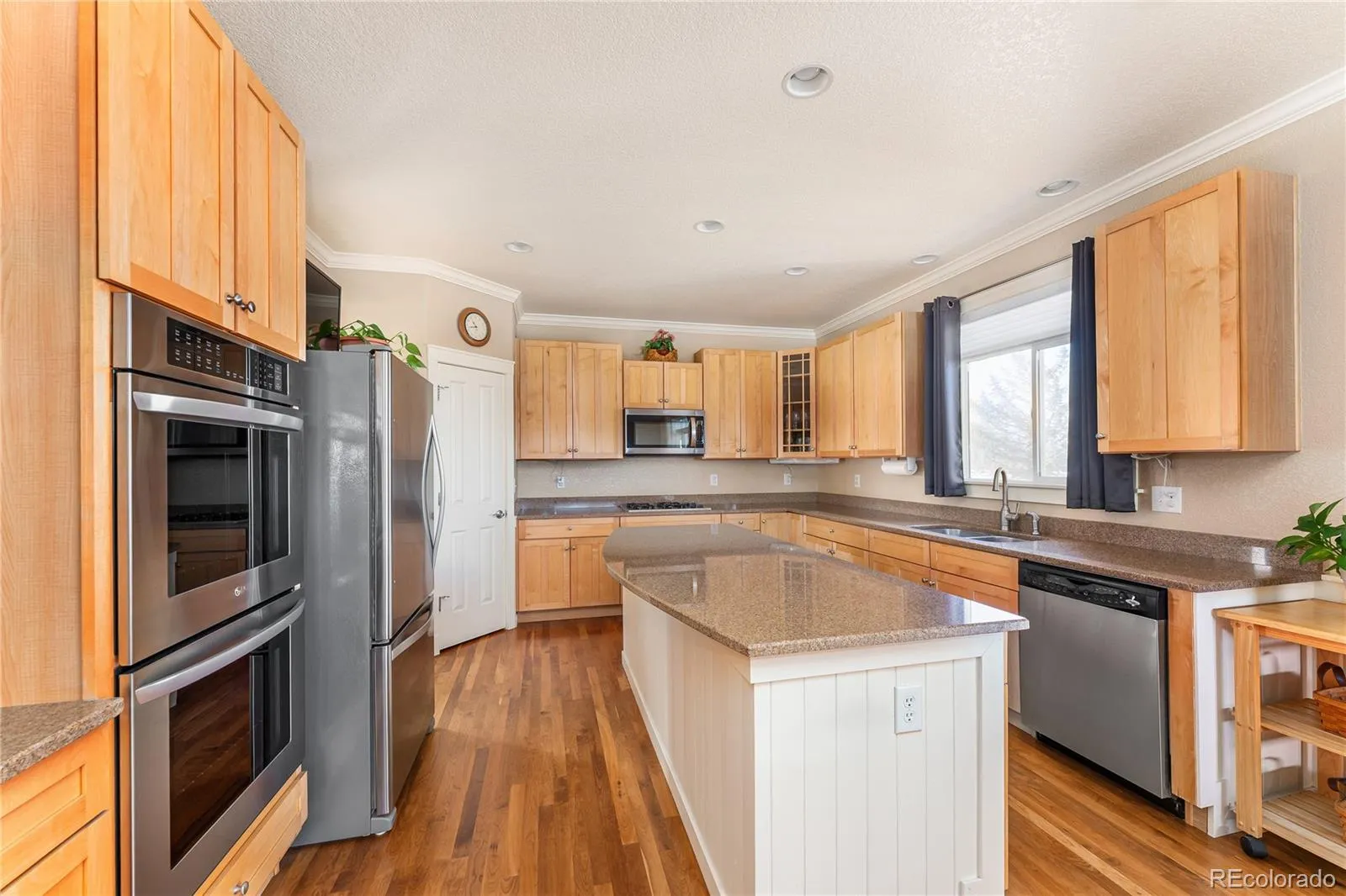 The kitchen showcases granite countertops, a spacious center island with storage and power, gas range, double ovens, stainless steel appliances, pantry, and generous workspace for both daily living and entertaining. Multiple living areas and quality finishes throughout reflect pride of ownership and thoughtful design.