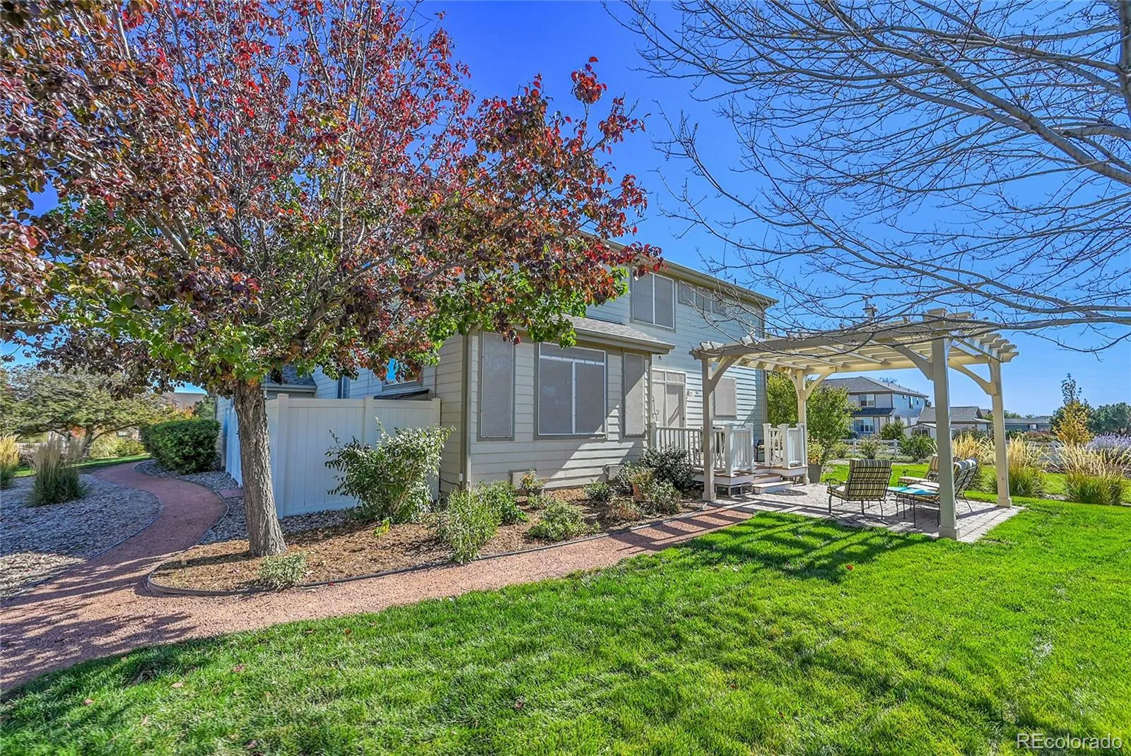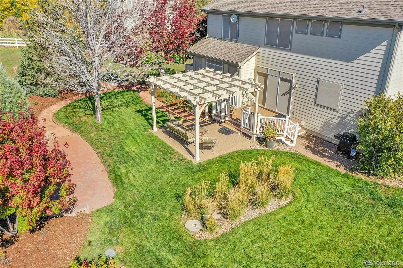 Outdoor living is a standout with professionally landscaped grounds, mature trees, multiple patios, a Trex deck with pergola, raised garden beds with dedicated irrigation, and a full-property sprinkler system, offering both beauty and functionality across the entire acre—perfect for buyers seeking homes with land in Todd Creek, space for a future shop, or expanded outdoor living in Northern Colorado.