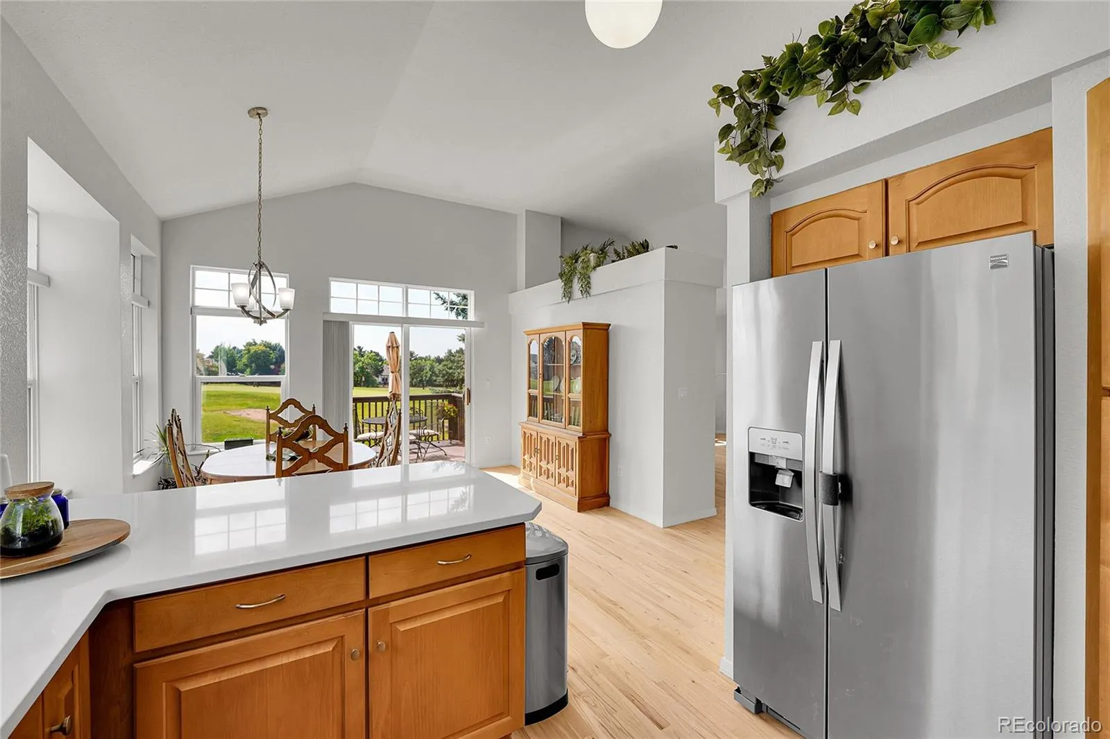 Vaulted ceilings and a cozy fireplace, offer an inviting setting for both relaxing evenings and lively gatherings. The beautifully updated kitchen is a true showpiece, featuring new stainless steel appliances, new elegant quartz countertops, a generous peninsula, and abundant natural light. The adjacent dining area opens seamlessly to a spectacular deck overlooking the fairway — the perfect place to entertain, enjoy peaceful mornings, or soak in sunsets and sweeping mountain views.