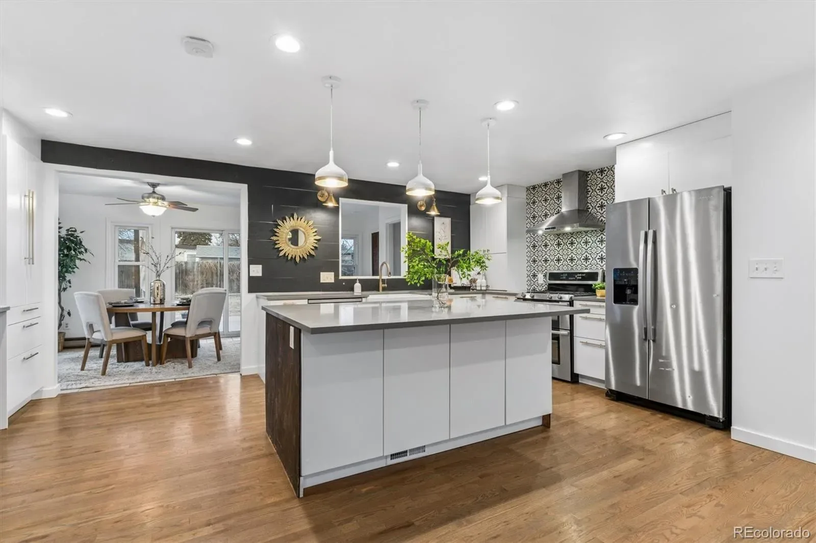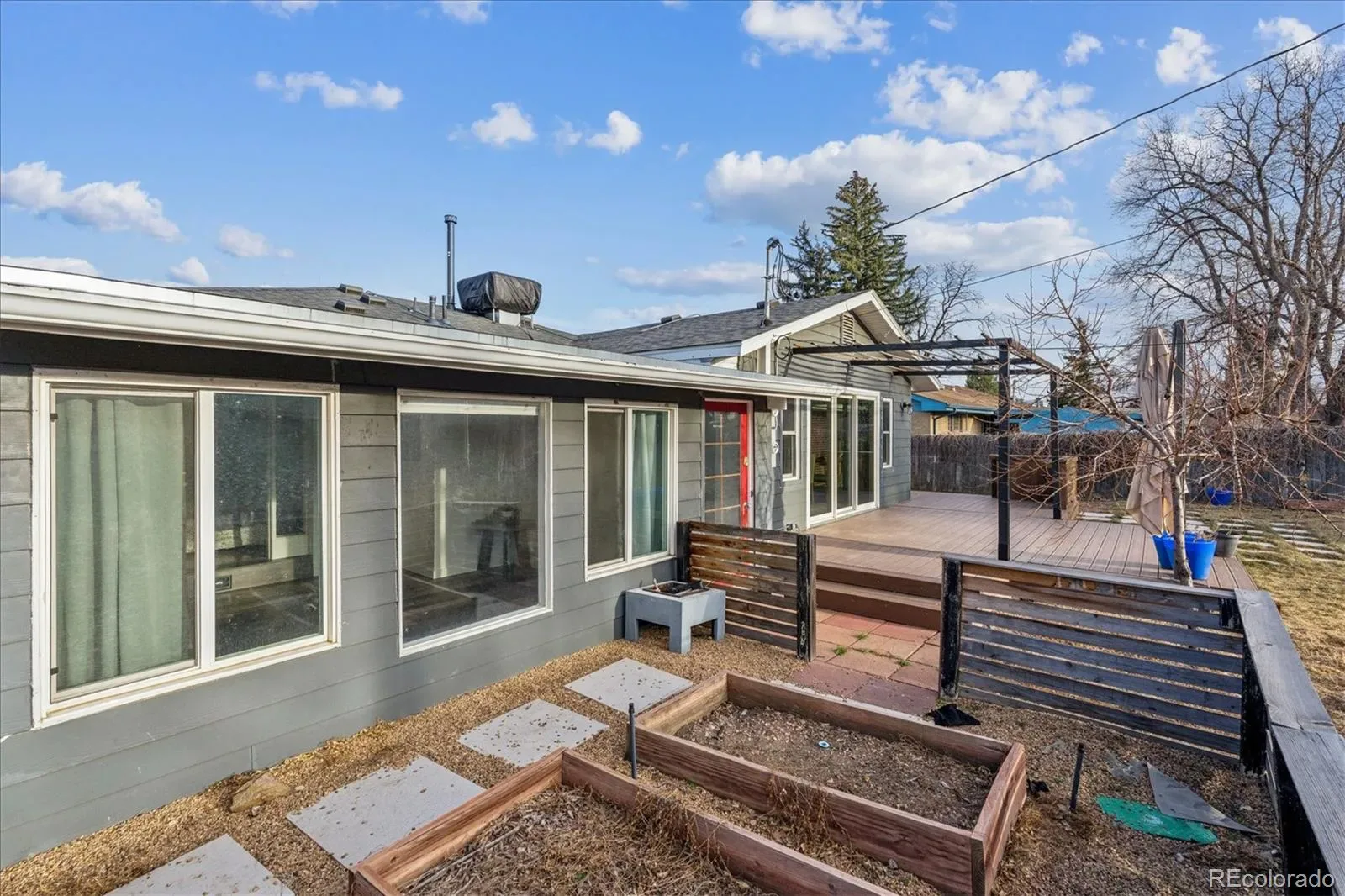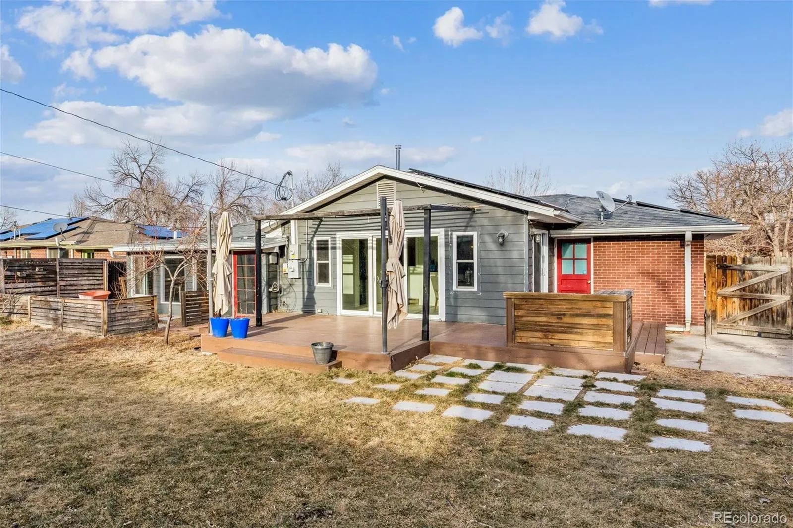 Welcome to this beautifully updated 5 bedroom, 3 bathroom ranch-style home offering a modern design, flexible layout, & thoughtful upgrades throughout. The main level features wood flooring & an open-concept layout that flows seamlessly from the inviting living room into the kitchen, perfect for everyday living & entertaining. The kitchen is a true centerpiece, showcasing a large island, quartz countertops, sleek white cabinetry, & stainless steel appliances, including a double oven & built-in shelving adding style & functionality. A striking backsplash beneath the range hood is sure to catch your eye. The spacious dining area connects easily to the backyard, making indoor/outdoor entertaining a breeze. The primary bedroom provides a relaxing retreat w/ a ceiling fan & light, closet space, a private ensuite 3/4 bath, & a versatile bonus room, perfect for an expanded closet, sitting area, or peaceful R&R space. The ensuite bath features a walk-in glass shower, sink, & toilet. Two additional main level bedrooms include new carpeting, closets, & share a full hall bath. The finished basement adds incredible versatility w/ two more bedrooms, a bonus room ideal for a home office, gym, or playroom w/ built-in shelving, & a large family room perfect for movie nights or hosting guests. A spacious laundry room includes washer & dryer, wash sink, shelving, & cabinets. You’ll also love the beautifully updated 3/4 bath with eye catching tilework & walk-in shower, making this an excellent option for multigenerational living. Additional highlights include solar, a newer roof, newer HVAC, an attached one car garage w/ exterior access, EV charger, & plenty of additional parking outside. Enjoy the fully fenced backyard w/ a Trex deck, garden area, & shed, perfect for BBQs, kids to play, or pets to roam. No HOA. Conveniently located near shopping, dining, trails, golf courses, & great schools w/ easy access to Denver & Boulder. Don’t miss this incredible opportunity!
