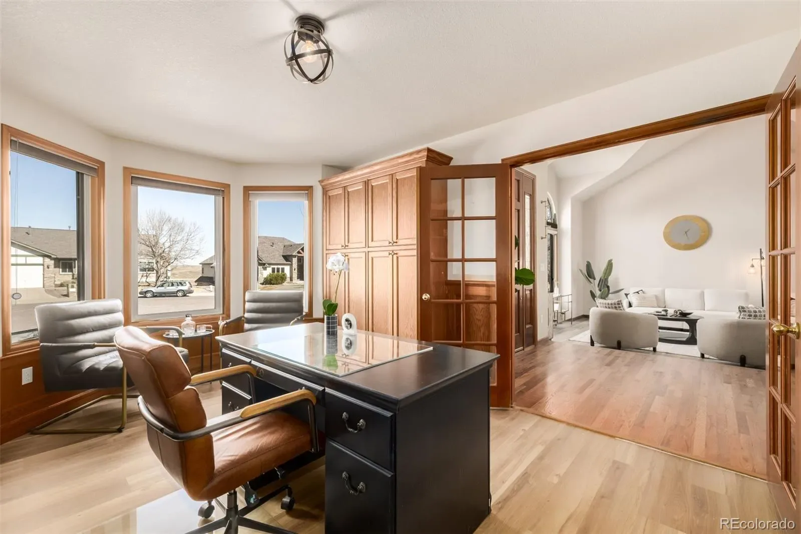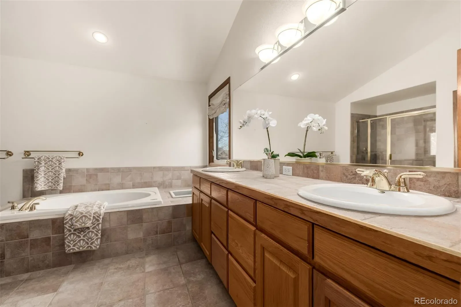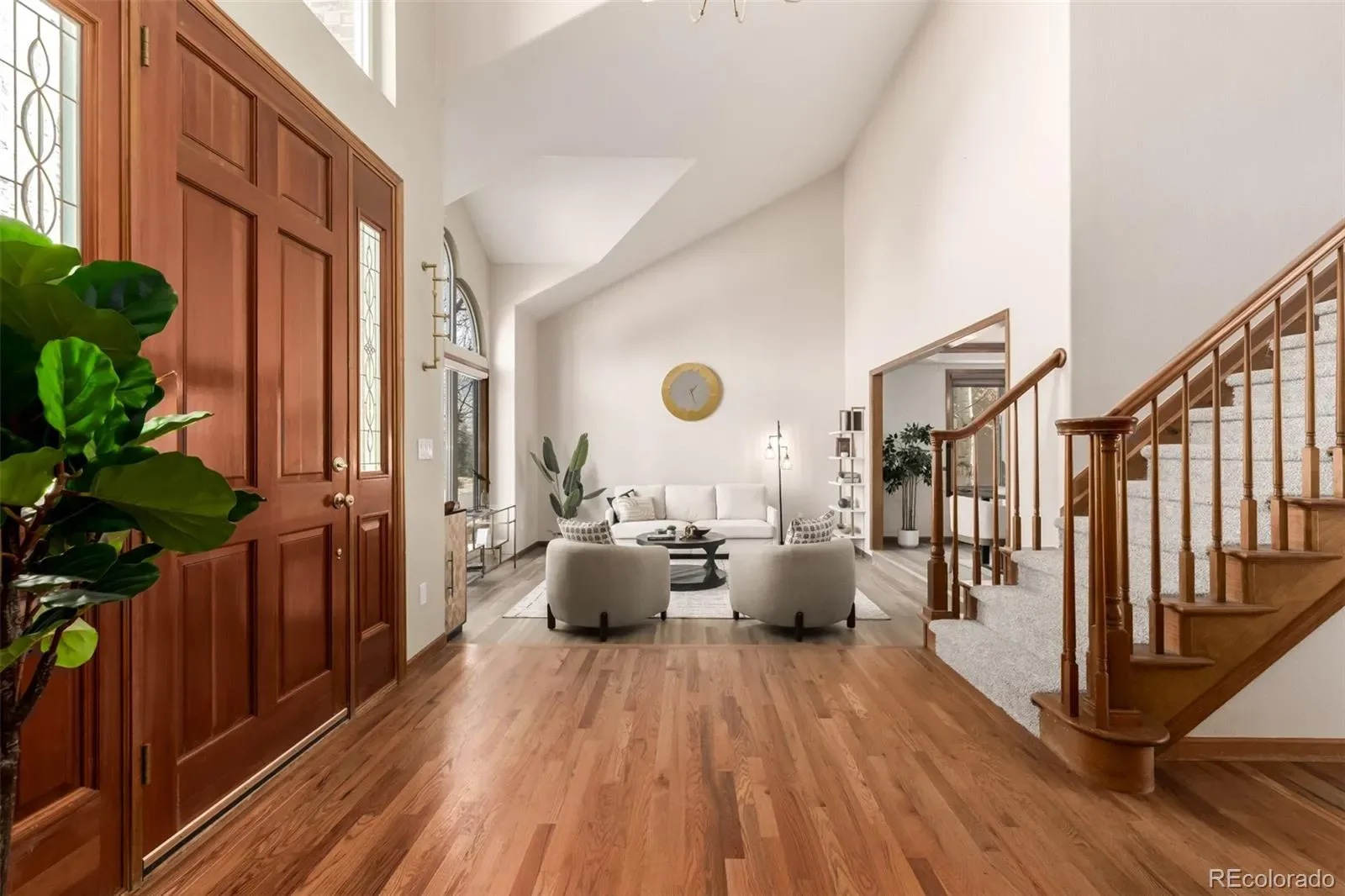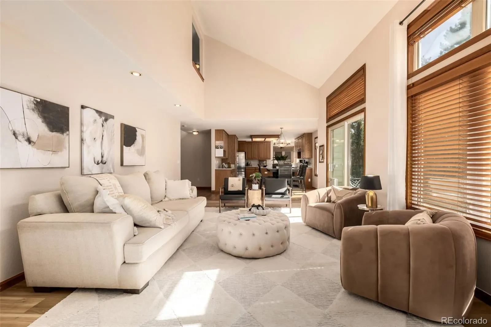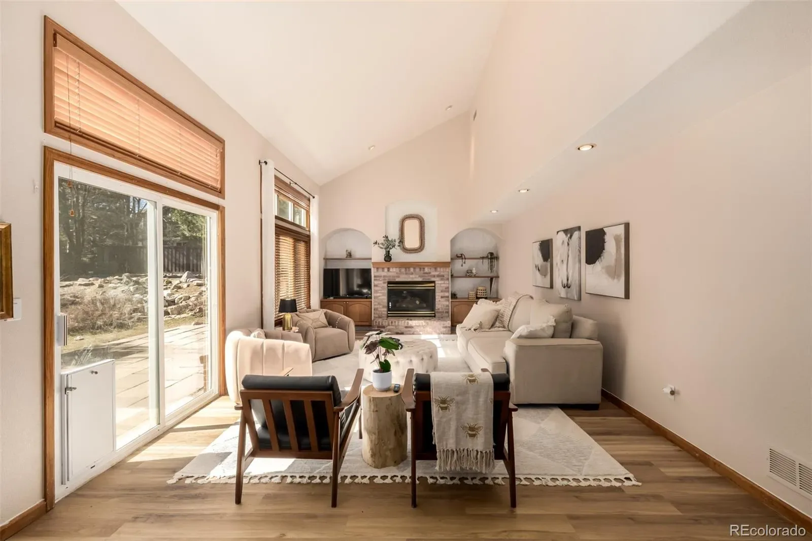 Inside, soaring vaulted ceilings and warm wood flooring welcome you into a bright, open layout designed for both everyday living and entertaining. A private den with French doors, built-in bookcases, and a sunlit bay window offers the perfect home office or library. The main level also features a sunken living room, formal dining room, and a spacious family room anchored by a brick-accented fireplace.