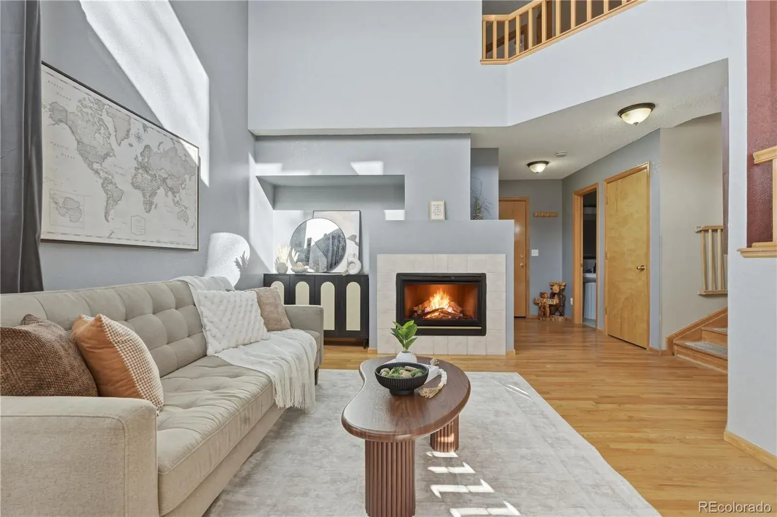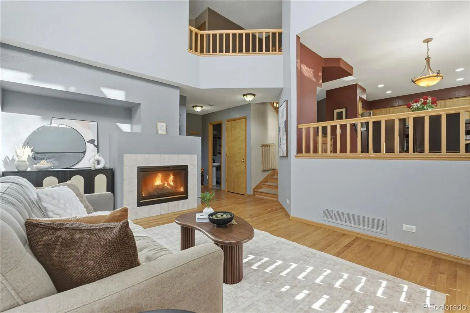 Inside, you’re greeted by soaring vaulted ceilings and true hardwood floors that add warmth and charm. The kitchen is upgraded with granite countertops, a custom matching bar, and a built-in wine rack. Just a few steps down, the inviting family room features a gas fireplace, vaulted ceilings, and walk-out access to the covered patio addition. Upstairs, the landing overlooks the family room and leads to the spacious primary suite with tall ceilings, dual vanity, walk-in closet, and private backyard views. Two additional bedrooms and a full bath complete the upper level.