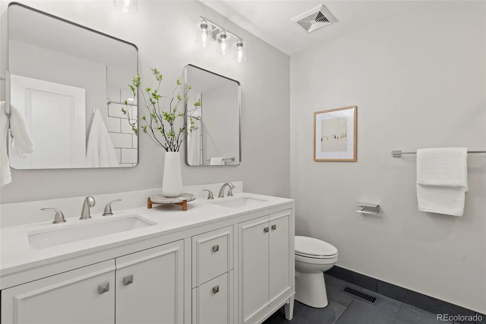 The remodeled kitchen features shaker style cabinetry, quartz countertops, subway tile backsplash, and brand new appliances. The fully updated hallway bathroom includes slate flooring, a double sink vanity, updated lighting, soaker tub, and tile that extends to the ceiling for a polished finish.