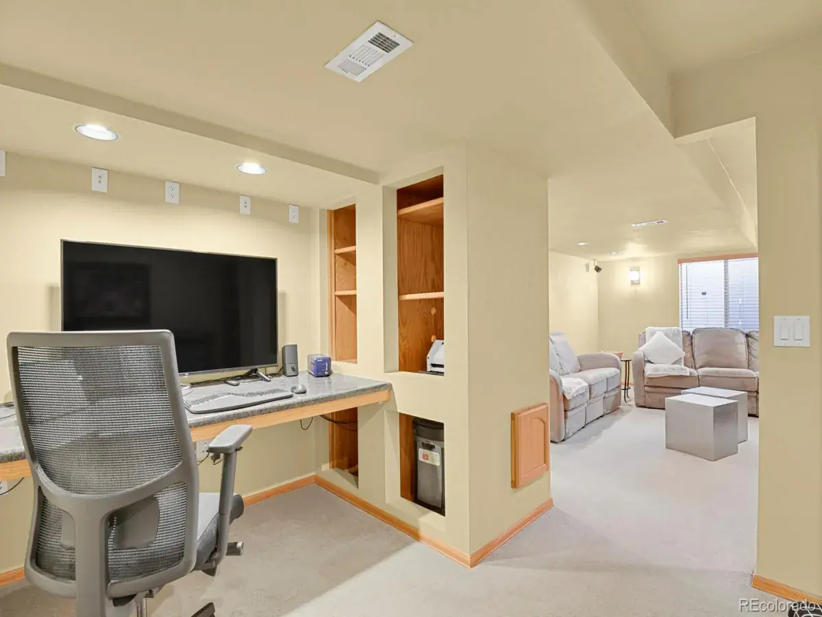 The remodeled, finished basement adds exceptional versatility and comfort. It includes a 5th bedroom, a spacious family/recreation room with an egress window, a wet bar and beverage refrigerator, a built-in full-wall bookshelf, and an office with custom shelving.