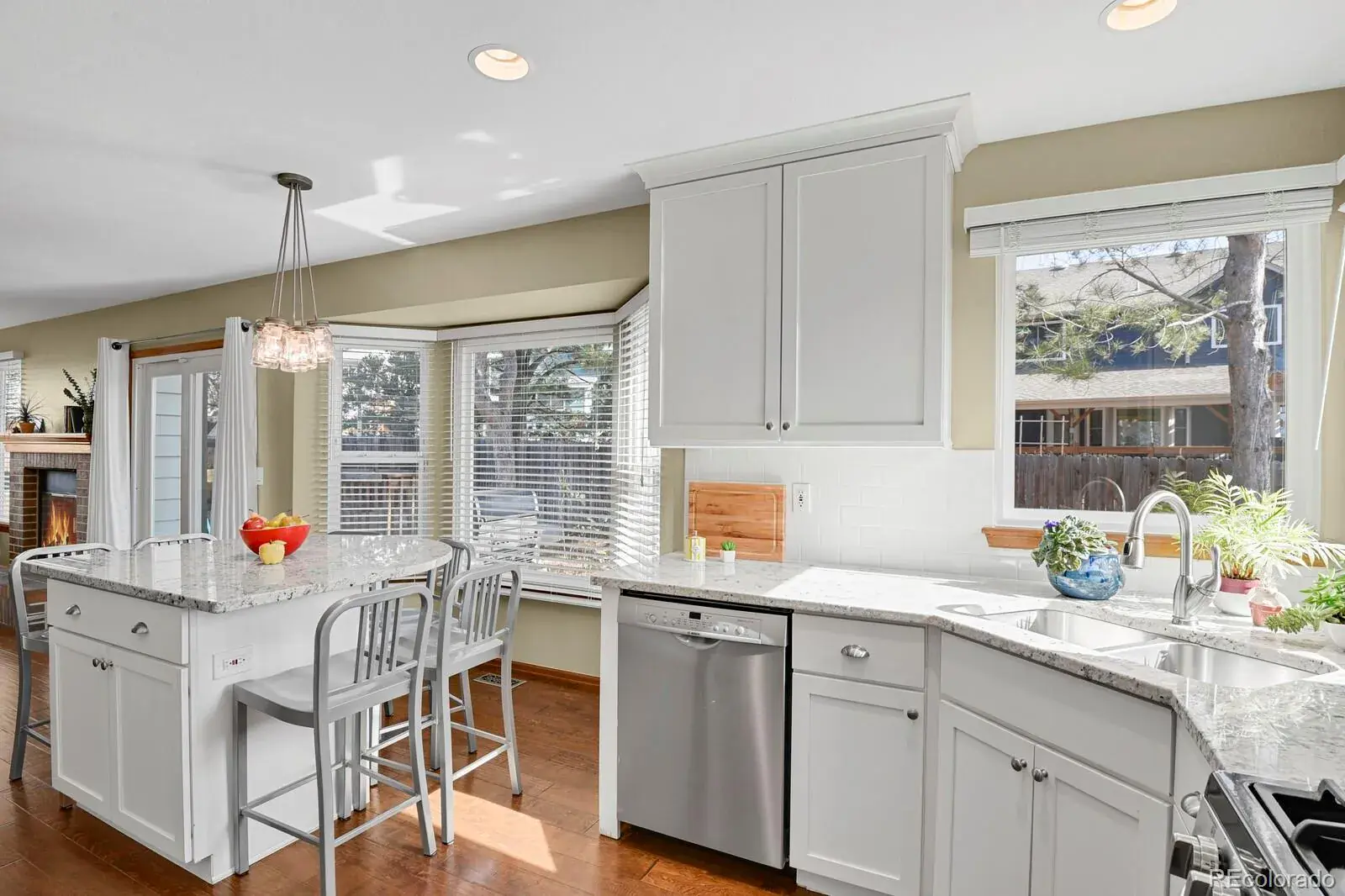 The kitchen is ideal for everyday living and entertaining, offering granite countertops, stylish cabinetry, a large island, a pantry, and stainless-steel appliances. The inviting family room is bright and comfortable, centered around a brick wood-burning fireplace with a mantle, large windows, and a glass door offering views of backyard evergreens and the sounds of songbirds.