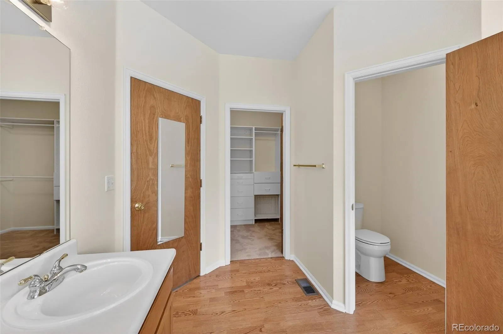 Master bedroom with large inviting windows, a 5 piece master bath with separate vanities and the walk in closet with built-in wardrobe.