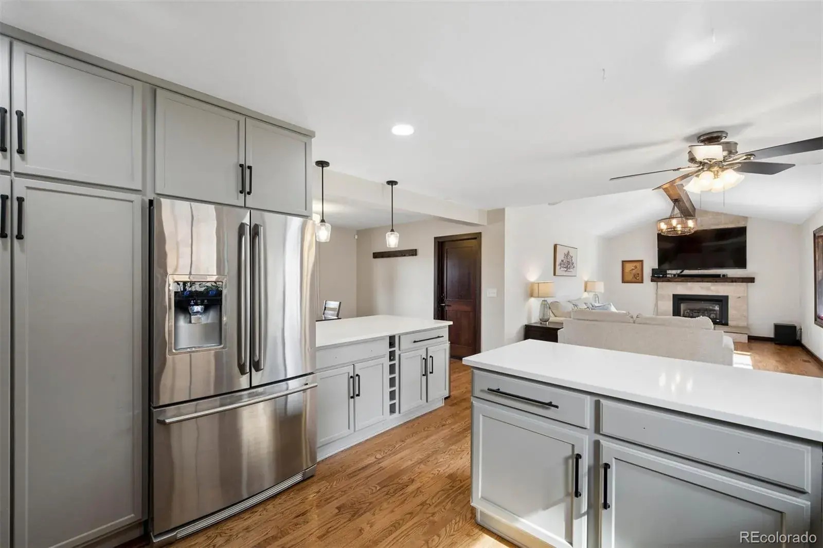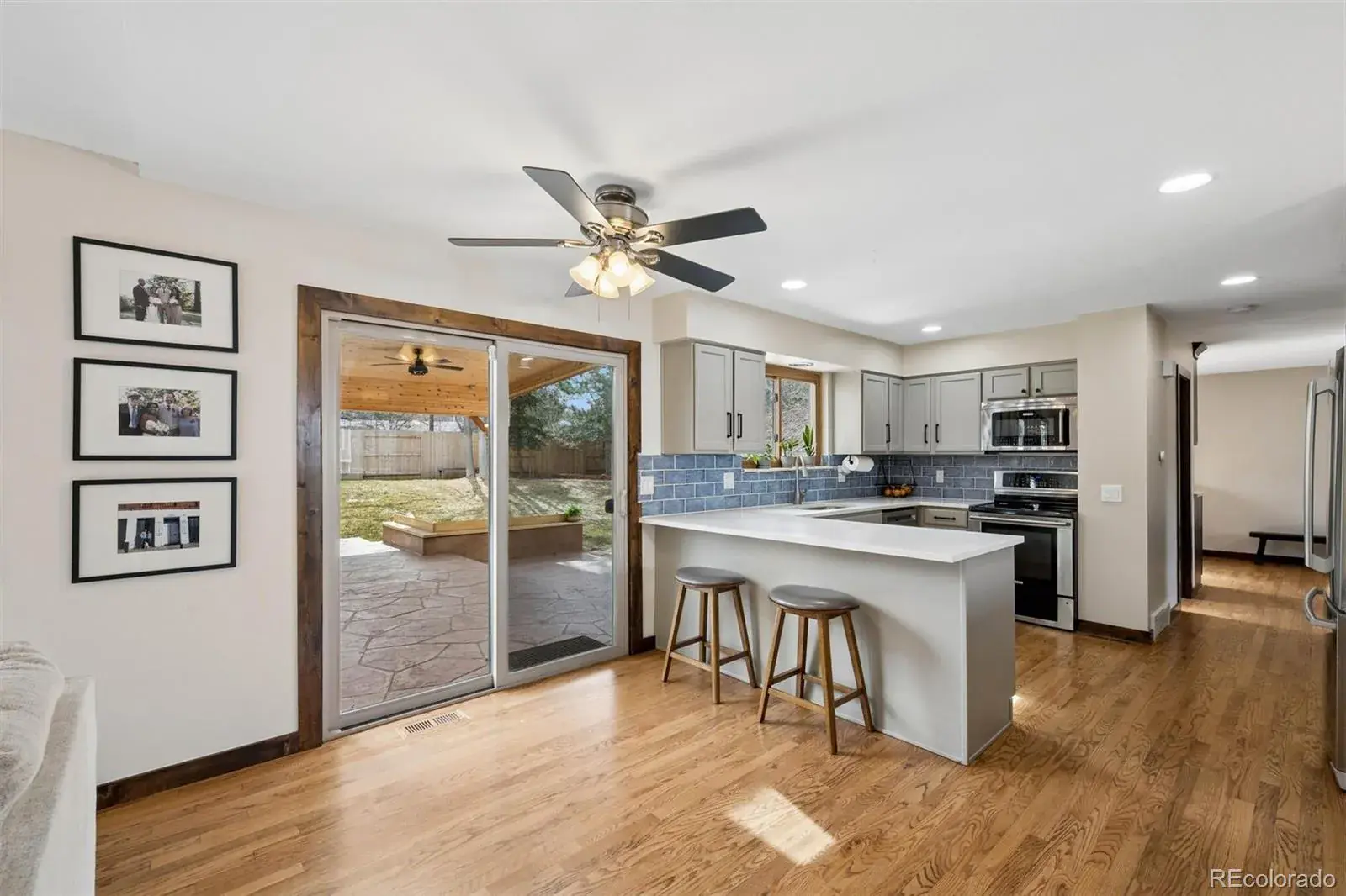 Situated in a highly desirable Centennial location within the renowned Cherry Creek School District, this beautifully updated two-story residence offers 2,892 total square feet of thoughtfully designed living space, blending comfort, style, and exceptional outdoor living. From the inviting front deck to the expansive corner lot, curb appeal shines. Inside, rich wood flooring, vaulted ceilings, and abundant natural light create an airy, welcoming atmosphere. The family room serves as a true focal point, featuring a gas fireplace with striking stone surround and a charming bay window with built-in bench seating. The updated kitchen is both functional and stylish, showcasing quartz countertops, stainless steel appliances, a wall pantry, and a distinctive blue backsplash.Entertain with ease in the dining room, highlighted by a custom built-in bar area with beverage fridge and built-ins — perfect for gatherings. Upstairs, the primary suite offers a peaceful retreat with a walk-in closet featuring custom shelving and a private ¾ bath with dual vanities. Two additional bedrooms and a full bathroom provide flexibility for family or guests. The finished basement expands the living space with a recreation room, ¾ bath, non-conforming bedroom area, and laundry room complete with washer and dryer. The outdoor setting is truly exceptional. The fully fenced, oversized yard features a flagstone patio, heated covered patio, fire pit with seating area, and a fully equipped outdoor kitchen with gas grill and refrigerator. Located in one of Centennial’s most sought-after neighborhoods and served by the highly regarded Cherry Creek School District, this home offers not only elevated living but long-term value in an exceptional community setting.