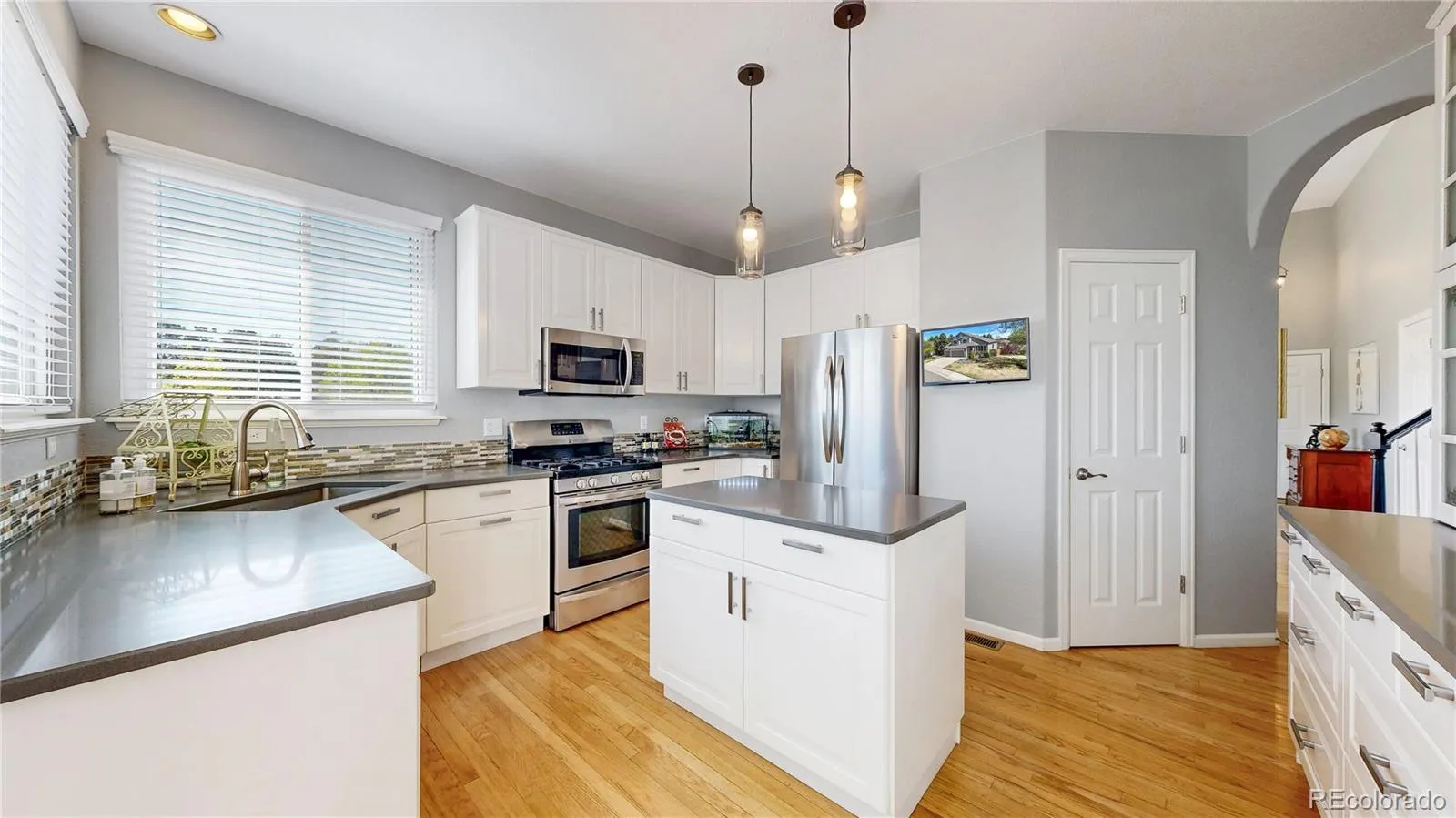 The remodeled kitchen includes new cabinetry, quartz countertops, and stainless steel appliances, ideal for everyday living and entertaining. Hardwood flooring flows through main living areas.